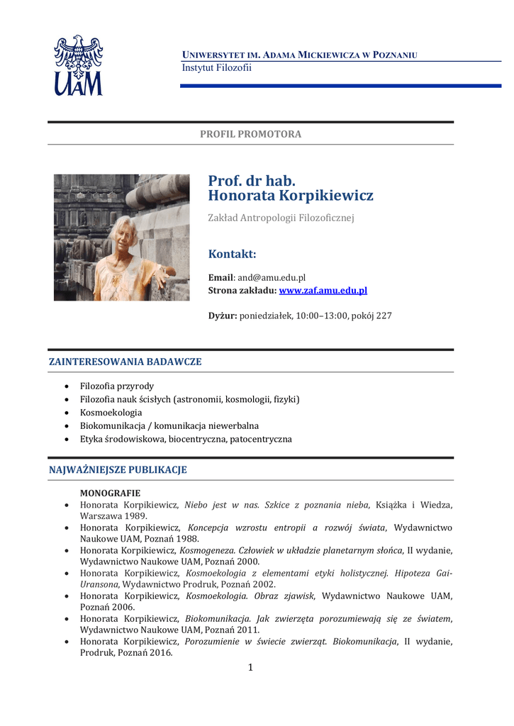 UNIWERSYTET IM. ADAMA MICKIEWICZA W POZNANIU Instytut Filozofii PROFIL PROMOTORA Prof. dr hab. Honorata Korpikiewicz Zakład Antropologii Filozoficznej Kontakt: Email: [email protected] Strona zakładu: www.zaf.amu.edu.pl Dyżur: poniedziałek, 10:00–13:00, pokój 227 ZAINTERESOWANIA BADAWCZE Filozofia przyrody Filozofia nauk ścisłych (astronomii, kosmologii, fizyki) Kosmoekologia Biokomunikacja / komunikacja niewerbalna Etyka środowiskowa, biocentryczna, patocentryczna NAJWAŻNIEJSZE PUBLIKACJE MONOGRAFIE Honorata Korpikiewicz, Niebo jest w nas. Szkice z poznania nieba, Książka i Wiedza, Warszawa 1989. Honorata Korpikiewicz, Koncepcja wzrostu entropii a rozwój świata, Wydawnictwo Naukowe UAM, Poznań 1988. Honorata Korpikiewicz, Kosmogeneza. Człowiek w układzie planetarnym słońca, II wydanie, Wydawnictwo Naukowe UAM, Poznań 2000. Honorata Korpikiewicz, Kosmoekologia z elementami etyki holistycznej. Hipoteza GaiUransona, Wydawnictwo Prodruk, Poznań 2002. Honorata Korpikiewicz, Kosmoekologia. Obraz zjawisk, Wydawnictwo Naukowe UAM, Poznań 2006. Honorata Korpikiewicz, Biokomunikacja. Jak zwierzęta porozumiewają się ze światem, Wydawnictwo Naukowe UAM, Poznań 2011. Honorata Korpikiewicz, Porozumienie w świecie zwierząt. Biokomunikacja, II wydanie, Prodruk, Poznań 2016. 1 UNIWERSYTET IM. ADAMA MICKIEWICZA W POZNANIU Instytut Filozofii AKTUALNY PROJEKT BADAWCZY Kosmoekologia Kosmoekologia jest wiedzą dotyczącą wpływu Kosmosu na biosferę, życie, jego modyfikacje i rozwój, a także na pochodzenie życia na naszej planecie oraz narodziny życia we Wszechświecie. Dziedzina ta może być realizowana jako nauka ścisła – z pogranicza kosmologii, astronomii, biologii, ale także jako dział filozofii, rozważający problem, jakie parametry, procesy fizyczne oraz kategorie bytu są konieczne do rozwoju życia oraz jak kosmoekologia wpływa na rozumienie naszego miejsca w świecie. Biokomunikacja Biomunikacja to wiedza na temat komunikacji istot żywych. Szczególnie interesuję się komunikacja niewerbalną zwierząt, a także ludzi - ich mową ciała, porozumieniem ze zwierzęciem, porozumieniem międzygatunkowym. To ostatnie to nowość, prawdziwa terra incognita. Etyka patocentryczna Jest to dział etyki stawiający na czele problem cierpienia, zarówno ludzi jak i zwierząt. OBSZAR WSPÓŁPRACY KRAJOWEJ I MIĘDZYNARODOWEJ Prowadzę intensywną współpracę naukowo-badawczą z następującymi instytucjami: Laboratorium Animal Studies, Polskie Towarzystwo Antropologii Filozoficznej, Towarzystwo Antropozoficzne, Polskie Towarzystwo Astronomiczne, Astro Asociation, PTTK, TOZ, PCK – oraz z wieloma innymi organizacjami społecznymi. PROPONOWANA TEMATYKA DOKTORATÓW Tematyka zostanie wypracowana wspólnie z kandydatką/kandydatem. Jednakże chętnie podsunę swoje propozycje. Mile widziana jest tematyka kosmoekologii, biokomunikacji, etyki, w ramach których jeszcze wiele problemów czeka na pilne i gruntowne przebadanie. W w/w monografiach zawarłam wiele pytań i wskazałam szereg takowych problemów, które są warte głębszego rozważenia. Chociażby: Zjawiska cykliczne i niecykliczne a rozwój Wszechświata Relacyjna teoria Leibniza a kartezjańsko-newtonowski opis zjawisk Prahinduska zasada kosmologiczna a rozwój Elegancja rozwiązań matematycznych a prawda przyrodnicza Rozwój przez regres. Wyjątek czy zjawisko powszechne? Życie vs cierpienie. Etyka biocentryczna czy patocentryczna? Błąd metodologiczny w biokomunikacji. Dlaczego człowiek uczy zwierzęta swojego języka 2 UNIWERSYTET IM. ADAMA MICKIEWICZA W POZNANIU Instytut Filozofii OCZEKIWANIA WZGLĘDEM KANDYDATÓW Od Kandydata oczekuję przede wszystkim uczciwości, solidności i pracowitości. Poza tym mile widziane (choć nie konieczne) pewne doświadczenie pisarskie, orientacja w naukach ścisłych albo nawet studia w tym kierunku – jeśli Kandydat chce się realizować w filozofii nauk ścisłych, a także wrażliwość – jeśli chce realizować temat etyczny. Jeśli jest Pani/Pan zainteresowan-a/-y współpracą ze mną i pisaniem pracy doktorskiej pod moją opieką, to pierwszym krokiem do nawiązania współpracy jest zaaplikowanie na studia doktoranckie w Instytucie Filozofii UAM (http://filozofia.amu.edu.pl/studia/doktoranckie/ ). Przed zaaplikowaniem na studia doktoranckie (zazwyczaj termin mija na początku czerwca), proszę przesłać na mój adres mailowy – najlepiej do końca kwietnia danego roku kalendarzowego – następujący zestaw informacji: • Opis problemu badawczego, jaki Pani/Pan chciałby podjąć w swej pracy doktorskiej (2-5 stron wraz z orientacyjną literaturą przedmiotu); • List motywacyjny; • Curriculum Vitae; • Streszczenie (pisanej) pracy magisterskiej (maksymalnie 5 stron); • Jedną - dwie swoje publikacje; • Dane kontaktowe (mail, telefon). Po otrzymaniu dokumentów odpowiem celem uzgodnienia terminu przeprowadzenia rozmowy (bezpośrednio lub na adres emailowy), mającej za zadanie dokonanie uzgodnień merytorycznych i organizacyjnych. POZOSTAŁE INFORMACJE O PROMOTORZE Ukończone studia magisterskie z astronomii, fizyki teoretycznej oraz podyplomowe z kulturoznawstwa. Doktorat z nauk fizycznych na UJ. Habilitacja z nauk społecznych w zakresie filozofii na UAM. Profesor tytularny w dziedzinie filozofii, profesor zwyczajny UAM. Zainteresowania pozanaukowe: pisarstwo, fotografia, turystyka, podróże, zwierzęta. 3