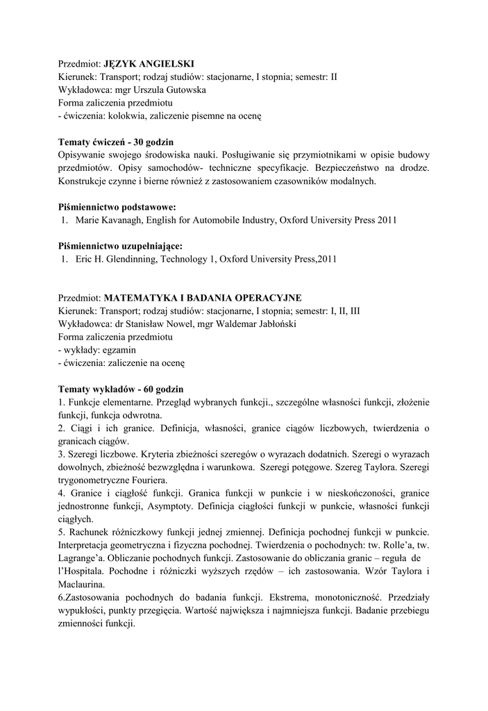 Przedmiot: JĘZYK ANGIELSKI Kierunek: Transport; rodzaj studiów: stacjonarne, I stopnia; semestr: II Wykładowca: mgr Urszula Gutowska Forma zaliczenia przedmiotu - ćwiczenia: kolokwia, zaliczenie pisemne na ocenę Tematy ćwiczeń - 30 godzin Opisywanie swojego środowiska nauki. Posługiwanie się przymiotnikami w opisie budowy przedmiotów. Opisy samochodów- techniczne specyfikacje. Bezpieczeństwo na drodze. Konstrukcje czynne i bierne również z zastosowaniem czasowników modalnych. Piśmiennictwo podstawowe: 1. Marie Kavanagh, English for Automobile Industry, Oxford University Press 2011 Piśmiennictwo uzupełniające: 1. Eric H. Glendinning, Technology 1, Oxford University Press,2011 Przedmiot: MATEMATYKA I BADANIA OPERACYJNE Kierunek: Transport; rodzaj studiów: stacjonarne, I stopnia; semestr: I, II, III Wykładowca: dr Stanisław Nowel, mgr Waldemar Jabłoński Forma zaliczenia przedmiotu - wykłady: egzamin - ćwiczenia: zaliczenie na ocenę Tematy wykładów - 60 godzin 1. Funkcje elementarne. Przegląd wybranych funkcji., szczególne własności funkcji, złożenie funkcji, funkcja odwrotna. 2. Ciągi i ich granice. Definicja, własności, granice ciągów liczbowych, twierdzenia o granicach ciągów. 3. Szeregi liczbowe. Kryteria zbieżności szeregów o wyrazach dodatnich. Szeregi o wyrazach dowolnych, zbieżność bezwzględna i warunkowa. Szeregi potęgowe. Szereg Taylora. Szeregi trygonometryczne Fouriera. 4. Granice i ciągłość funkcji. Granica funkcji w punkcie i w nieskończoności, granice jednostronne funkcji, Asymptoty. Definicja ciągłości funkcji w punkcie, własności funkcji ciągłych. 5. Rachunek różniczkowy funkcji jednej zmiennej. Definicja pochodnej funkcji w punkcie. Interpretacja geometryczna i fizyczna pochodnej. Twierdzenia o pochodnych: tw. Rolle’a, tw. Lagrange’a. Obliczanie pochodnych funkcji. Zastosowanie do obliczania granic – reguła de l’Hospitala. Pochodne i różniczki wyższych rzędów – ich zastosowania. Wzór Taylora i Maclaurina. 6.Zastosowania pochodnych do badania funkcji. Ekstrema, monotoniczność. Przedziały wypukłości, punkty przegięcia. Wartość największa i najmniejsza funkcji. Badanie przebiegu zmienności funkcji. 7. Rachunek całkowy funkcji jednej zmiennej. Pojęcie funkcji pierwotnej. Całki nieoznaczone. Całkowanie przez części i przez podstawienie. Całkowanie funkcji wymiernych. Wzory rekurencyjne. Całkowanie funkcji trygonometrycznych i niewymiernych. 8. Całka oznaczona. Całka Riemanna – definicja i własności. Twierdzenie o całkach oznaczonych - tw. o wartości średniej. 9. Liczby zespolone. Jednostka urojona a liczba zespolona. Postaci liczb zespolonych, działania na liczbach zespolonych, pierwiastki liczb zespolonych. Interpretacja geometryczna liczby zespolonej. Moduł i argument. 10. Wyznaczniki i macierze. Wyznaczniki - własności i sposoby obliczania. Macierze własności i działania na macierzach. Macierz odwrotna. Równania macierzowe. 11.Układy równań liniowych. Rozwiązywanie układów równań liniowych - wzory Cramera, metoda Gaussa i Gaussa-Jordana. 12. Rachunek różniczkowy funkcji wielu zmiennych. Funkcja wielu zmiennych. Pochodne cząstkowe funkcji wielu zmiennych. Pochodne cząstkowe wyższych rzędów. Ekstrema lokalne funkcji dwóch zmiennych. 13. Zastosowanie rachunku różniczkowego funkcji wielu zmiennych. 14. Całki podwójne. Całka podwójna,, interpretacja geometryczna, własności całek podwójnych. Zamiana całki podwójnej na iterowaną. Zamiana zmiennych w całce podwójnej. 15. Całka potrójna. Zamiana całki potrójnej na iterowaną. Zamiana współrzędnych prostokątnych na współrzędne sferyczne i walcowe. Zastosowania całek wielowymiarowych. 16. Całki na liniach i powierzchniach. Całka krzywoliniowa płaska skierowana, całka krzywoliniowa płaska nieskierowana. Całka krzywoliniowa w przestrzeni skierowana, całka krzywoliniowa w przestrzeni nieskierowana. Wzór Greena. Całka powierzchniowa zorientowana, całka powierzchniowa niezorientowana. Twierdzenie Gaussa-Ostrogradskiego, twierdzenie Stokesa. 17. Równania różniczkowe zwyczajne rzędu pierwszego. Uwagi ogólne o równaniach różniczkowych rzędu pierwszego. Rozdzielanie zmiennych. Metoda podstawienia. Równania różniczkowe liniowe rzędu pierwszego. 18.Równania różniczkowe liniowe. Wybrane równania różniczkowe nieliniowe rzędu pierwszego. Równania różniczkowe zwyczajne rzędu drugiego sprowadzalne do równań rzędu. pierwszego. 19. Elementy rachunku prawdopodobieństwa. Pojęcie zdarzenia, działania na zdarzeniach. Pojęcie prawdopodobieństwa i własności prawdopodobieństwa. Elementy kombinatoryki. Prawdopodobieństwo warunkowe. Niezależność zdarzeń. Schemat Bernoulliego. 20. Elementy statystyki opisowej i matematycznej. Podstawowe statystyki. Miary położenia i rozproszenia. Zmienne losowe i ich rozkłady. Estymacja przedziałowa parametrów rozkładu jednej zmiennej. 21. Elementy korelacji i regresji. Testowanie hipotez statystycznych. 22. Programowanie liniowe. Wprowadzenie, cel i zakres badań operacyjnych. Postaci i przykłady zadań programowania liniowego. Metoda geometryczna rozwiązywania zadań programowania liniowego. Dualność w programowaniu liniowym. Zadanie dualne. 23. Zagadnienie transportowe. Modele zagadnień transportowych. Zamknięte i otwarte zagadnienie transportowe. Metoda minimalnego elementu macierzy. 24. Problemy przydziału. Minimalizacja kosztów lub czasu wykonywania zadań planowych. Maksymalizacja efektów produkcji. Algorytm, węgierski. 25. Programowanie dyskretne. Nieliniowe zagadnienia optymalizacyjne. Przykłady nieliniowych zadań optymalizacyjnych i metody ich rozwiązywania. Programowanie ilorazowe. Mnożniki i funkcja Lagrange’a. Warunki Kuhna-Tuckera. 26. Elementy programowania sieciowego i teorii gier. Przykłady zagadnień programowania dyskretnego. Elementy programowania sieciowego. Gry dwuosobowe o sumie
