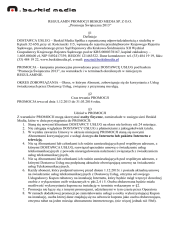 REGULAMIN PROMOCJI BESKID MEDIA SP. Z O.O. „Promocja Świąteczna 2013” §1 Definicje DOSTAWCA USŁUG – Beskid Media Spółka z ograniczoną odpowiedzialnością z siedzibą w Kętach 32-650, przy ul. Kościuszki 115, wpisaną do rejestru przedsiębiorców Krajowego Rejestru Sądowego, prowadzonego przez Sąd Rejonowy dla Krakowa-Śródmieścia XII Wydział Gospodarczy Krajowego Rejestru Sądowego pod nr KRS 0000378167, kapitał zakładowy – 1.605.000,00 zł, NIP 5492417339, REGON 121463522. Dane kontaktowe: tel. (33) 484 19 19, faks: (33) 484 19 22, www.beskidmedia.pl, e-mail: [email protected] PROMOCJA – kampania promocyjna prowadzona przez DOSTAWCĘ USŁUG pod hasłem "Promocja Świąteczna 2013”, na warunkach i w terminach określonych w niniejszym REGULAMINIE. OKRES ZOBOWIĄZANIA – Okres, w którym Abonent, zobowiązuje się do korzystania z Usług świadczonych przez Dostawcę Usług, związany z przyznaną mu ulgą. §2 Czas trwania PROMOCJI PROMOCJA trwa od dnia 1.12.2013 do 31.03.2014 roku. §3 Udział w PROMOCJI Z warunków PROMOCJI mogą skorzystać osoby fizyczne, zamieszkałe w zasięgu sieci Beskid Media, które w dniu przystąpienia do PROMOCJI: 1. Staną się nowymi klientami DOSTAWCY USŁUG na okres nie krótszy niż 24 miesiące. 2. Nie zalegają względem DOSTAWCY USŁUG z płatnościami z jakiegokolwiek tytułu. 3. W wyniku zawarcia Umowy w okresie niniejszej PROMOCJI staną się nowymi Abonentami korzystającymi z usługi dostępu do Internetu lub pakietu Internetu z telewizją. 4. Nie są Abonentami lub członkami ich rodzin zamieszkujących pod wspólnym adresem, z którymi DOSTAWCA USŁUG, rozwiązał uprzednio umowę o świadczenie usług telekomunikacyjnych z powodu nieuregulowania należności związanych z świadczeniem usług telekomunikacyjnych, 5. Nie są Abonentami lub członkami ich rodzin zamieszkujących pod wspólnym adresem, z którymi Dostawca Usług ma podpisaną aktualnie obowiązującą umowę na świadczenie usług Telekomunikacyjnych. 6. Każdy abonent, który podpisał umowę przed dniem 1.12.2013r. i posiada aktualną umowę na świadczenie usług telekomunikacyjnych z Dostawcą Usług, otrzyma od swojego Usługodawcy Kupon rabatowy na instalację Internetu, który będzie mógł wręczyć dowolnej osobie z wyłączeniem osób wskazanych w pkt.2,4 i 5. Osoba obdarowana będzie miała możliwość wykorzystania kuponu na instalację w terminie wskazanym w §2. 7. Promocja nie łączy się z innymi promocjami, udzielanymi w tym czasie przez Operatora 8. W ramach dodatkowej promocji po zainstalowaniu usługi u osoby wykorzystującej Kupon na instalację, osoba której dane znajdują się na odwrocie kuponu jako osoba obdarowująca, otrzyma rabat na jeden miesiąc abonamentu internetowego, (nie więcej jednak niż 50zł). §4 Ulgi dla Abonenta 1. Ulgi w PROMOCJI dla wszystkich jej Uczestników zapisane są w Załączniku nr 1 do REGULAMINU PROMOCJI. 2. Ulgi określone w Załączniku nr 1 do REGULAMINU PROMOCJI przysługują Abonentowi od dnia zawarcia Umowy, przy czym warunkiem skorzystania z ulg jest obowiązywanie umowy przez okres na jaki została ona zawarta. 1. 2. 3. 4. 5. §5 Zobowiązania uczestnika PROMOCJI Warunkiem przyznania ulg określonych w §4 niniejszego REGULAMINU jest zobowiązanie się Uczestnika Promocji do pozostania Abonentem DOSTAWCY USŁUG w zakresie wybranego zgodnie z Załącznikiem nr 1 zestawu Usług lub Usługi przez wybrany okres zobowiązania. Umowa zawarta na czas określony ulega przedłużeniu na czas nieokreślony, o ile Abonent nie złożony przeciwnego oświadczenia w terminie 30 dni przed upływem terminu obowiązywania umowy na czas określony. Promocyjna opłata abonamentowa obowiązuje w kolejnych OKRESACH ZOBOWIĄZANIA. W przypadku jednostronnego rozwiązania umowy przez Abonenta lub przez Dostawce usług z winy Abonenta przed upływem terminu na jaki Umowa - związana z przyznaniem ulgi Abonentowi - została zawarta, Dostawcy usług przysługuje roszczenie o zwrot przyznanej Abonentowi ulgi pomniejszonej o proporcjonalną jej wartość za okres od dnia zawarcia umowy do dnia jej rozwiązania. Roszczenie nie przysługuje w przypadku rozwiązania umowy przez Abonenta przed rozpoczęciem świadczenia usług. Obowiązek zwrotu ulg nie dotyczy przypadków, w których przepisy prawa uprawniają Abonenta do rozwiązania umowy bez obowiązku zwrotu ulgi przyznanej w związku z zawarciem umowy. §6 Faktury elektroniczne (e-faktura) 1. Oświadczam, że wyrażam zgodę zgody na otrzymywanie faktur elektronicznych dotyczących usług, których dotyczy PROMOCJA drogą elektroniczną. 2. Faktury będą dostępne na stronie bok.beskidmedia.pl w zakładce „Finanse”, po uprzednim zalogowaniu przez Uczestnika Promocji. 1. 2. 3. 4. 5. §7 Postanowienia Końcowe Niniejszy REGULAMIN PROMOCJI jest regulaminem szczególnym w stosunku do Regulaminu świadczenia usług dostępu do Internetu firmy Beskid Media Sp. z o. o. i odnosi się tylko do tej promocji. DOSTAWCA USŁUG zastrzega sobie w trakcie obowiązywania PROMOCJI możliwość zmiany czasu obowiązywania PROMOCJI określonego w §2. Dostawca usług zastrzega sobie prawo do zmian Opłat Abonamentowych określonych w załączniku nr 1. Dostawca usług zastrzega sobie zmianę parametrów technicznych Usługi Dostępu do Internetu. O zmianach, o których mowa w pkt. 3 i 4 niniejszego paragrafu i terminie ich wprowadzenia, Dostawca Usług poinformuje pisemnie Abonenta, z wyprzedzeniem czasowym obejmującym co najmniej jeden okres rozliczeniowy wraz z informacją o prawie wypowiedzenia umowy w przypadku braku akceptacji tych zmian. 6. We wszystkich sprawach nieuregulowanych niniejszym REGULAMINEM i jego załącznikach mają zastosowania odpowiednie postanowienia Regulaminu świadczenia usług dostępu do Internetu firmy Beskid Media Sp. z o. o., przepisy powszechnie obowiązującego prawa polskiego, a zwłaszcza ustawy Prawo telekomunikacyjne oraz Kodeksu cywi