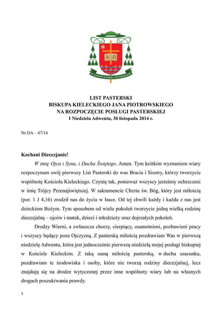 LIST PASTERSKI BISKUPA KIELECKIEGO JANA PIOTROWSKIEGO NA ROZPOCZĘCIE POSŁUGI PASTERSKIEJ I Niedziela Adwentu, 30 listopada 2014 r. Nr OA – 47/14 Kochani Diecezjanie! W imię Ojca i Syna, i Ducha Świętego. Amen. Tym krótkim wyznaniem wiary rozpoczynam swój pierwszy List Pasterski do was Bracia i Siostry, którzy tworzycie wspólnotę Kościoła Kieleckiego. Czynię tak, ponieważ wszyscy jesteśmy ochrzczeni w imię Trójcy Przenajświętszej. W sakramencie Chrztu św. Bóg, który jest miłością (por. 1 J 4,16) zrodził nas do życia w łasce. Od tej chwili każdy i każda z nas jest dzieckiem Bożym. Tym sposobem od wielu pokoleń tworzycie jedną wielką rodzinę diecezjalną – ojców i matek, dzieci i młodzieży oraz dojrzałych pokoleń. Drodzy Wierni, a zwłaszcza chorzy, cierpiący, osamotnieni, pozbawieni pracy i wszyscy będący poza Ojczyzną. Z pasterską miłością pozdrawiam Was w pierwszą niedzielę Adwentu, która jest jednocześnie pierwszą niedzielą mojej posługi biskupiej w Kościele Kieleckim. Z taką samą miłością pasterską, w duchu szacunku, pozdrawiam te środowiska i osoby, które nie tworzą rodziny diecezjalnej, lecz znajdują się na drodze wytyczonej przez inne wspólnoty wiary lub na własnych drogach poszukiwania prawdy. 1 II Ubogaceni refleksją duszpasterską minionego roku liturgicznego i mocniejsi w wierze, że Jezus Chrystus jest Synem Bożym, wchodzimy odważnie, pełni nadziei, w nowy Adwent, czas oczekiwania i przygotowania do świąt Bożego Narodzenia. Zarówno historyczny czas Adwentu oczekującej ludzkości na przyjście Pana, jak i nasz obecny Adwent liturgiczny, to czas nadziei, wolności i poszukiwania prawdy o sobie. „Nawracajcie się i wierzcie w Ewangelię” (Mk 1,15). Te słowa Pan Jezusa są zarazem wyzwaniem nowego roku duszpasterskiego i przesłaniem Ewangelii, które wprowadzają nas w przestrzeń miłosierdzia Bożego. Jednocześnie uczą nas, że nawrócenie w życiu człowieka nie jest czymś wstydliwym, ani poniżającym. Jest po prostu zrobieniem miejsca Jezusowi Chrystusowi w swoim sercu, nawet zbrukanym grzechami. Nawrócenie to piękny dar, który przynosi nam Jezus Chrystus Odkupiciel człowieka. Nauczanie św. Jana Pawła II zawarte w encyklice „Redemptor hominis” przypomina nam, że „To zjednoczenie Chrystusa z człowiekiem samo w sobie jest tajemnicą, w której rodzi się „nowy człowiek” powołany do uczestnictwa w Bożym życiu (por. 2 P 1, 4), stworzony na nowo w Chrystusie ku pełni łaski i prawdy (por. Ef 2, 10; J 1, 14. 16). Zjednoczenie Chrystusa z człowiekiem jest mocą i źródłem mocy wedle tego, co tak zwięźle wypowiedział w Prologu swej Ewangelii św. Jan: Słowo „Wszystkim tym (...) którzy Je przyjęli, dało moc, aby się stali synami Bożymi” (J 1, 12). Jest to moc wewnętrznie przemieniająca człowieka, zasada nowego życia, które nie niszczeje i nie przemija, ale trwa ku żywotowi wiecznemu (por. J 4, 14) (Redemptor hominis, 18). Bracia i Siostry! Człowiek nawrócony, to człowiek żyjący w prawdzie o sobie samym, wolny od poniżających go przywiązań, które nie uszlachetniają jego ludzkiej natury. Gdzie zatem szukać prawdy? Nie gdzie indziej, jak tylko w Jezusie Chrystusie. Kiedy duch niepewności penetrował serca apostołów, wtedy Jezus powiedział im: „Znacie drogę, dokąd ja idę». Odezwał się do Niego Tomasz: «Panie, 2 nie wiemy, dokąd idziesz. Jak więc możemy znać drogę?» Odpowiedział mu Jezus: «Ja jestem drogą i prawdą, i życiem. Nikt nie przychodzi do Ojca inaczej jak tylko przeze Mnie» (J 14,5-6). Droga Bożej prawdy i życia, to autentyczna droga do wolności, którą człowiek zbuduje, jeśli na co dzień żyje Jezusem, Jego Słowem, łaską sakramentów świętych, modlitwą i niezmiennym przykazaniem miłości Boga i bliźniego. Wtedy i nam będą bliskie słowa, które Pan Jezus skierował do Żydów: „Jeżeli będziecie trwać w nauce mojej, będziecie prawdziwie moimi uczniami i poznacie prawdę, a prawda was wyzwoli” (J 8,32). Niech drogą do osobistej wolności i prawdy będzie przede wszystkim niedzielna Msza święta, ta najpiękniejsza modlitwa Kościoła, która jest „wielką tajemnicą naszej wiary”, a jednocześnie najbliższą naszemu sercu obecnością Boga w Jezusie Chrystusie. Jeśli w Kościele Kieleckim niedzielna i świąteczna Eucharystia będzie punktem odniesienia do całego tygodnia, to zarazem będzie jego busolą i zdrowym sercem życia religijnego, moralnego i obyczajowego szlachetnych synów i córek tej ziemi. Z przeżywanej, a nie obserwowanej Eucharystii, zrodzi się prawdziwy duch apostolskiego świadectwa wiary, jaki mieli uczniowie podążający do Emaus, którzy mimo późnej pory wrócili do Jerozolimy, aby opowiedzieć braciom, co ich spotkało w drodze, i jak poznali Jezusa przy łamaniu chleba (por. Łk 24,35). Wtedy nasza wiara przez zaangażowanie w misje „ad gentes” stanie się darem dla tych, co jeszcze nie znają Jezusa, a pośród nas będzie darem dla bliźnich poprzez dzieło nowej ewangelizacji. Zaufajmy Jezusowi, jak uczy papież Franciszek, On jest źródłem nadziei i nie zabraknie nam Jego pomocy, aby wypełnić powierzoną nam przez Niego misję (por. Evangelii gaudium, 275). III Kochani Bracia i Siostry! Oto mój pasterski program, który będzie wielki i niezmiernie bogaty dla każdego i każdej z was, jeśli pójdziemy przez życie z Jezusem Chrystusem. Niech tą drogą prowadzi Was Maryja i święci patronowie tej ziemi: św. Stanisław BM, bł. Wincenty Kadłubek i bł. Józef Pawłowski! 3 Życzę wam kochani Wierni, Waszym duszpasterzom i osobom życia konsekrowanego, aby w Kościele Kieleckim nikt nigdy nie czuł się obcy, ale zawsze miał świadomość, że jest współobywatelem tej wspólnoty, której kamieniem węgielnym jest Jezus Chrystus (por. Ef 2,19-22). „W końcu bądźcie mocni w Panu – siłą Jego potęgi” jak pisał św. Paweł do