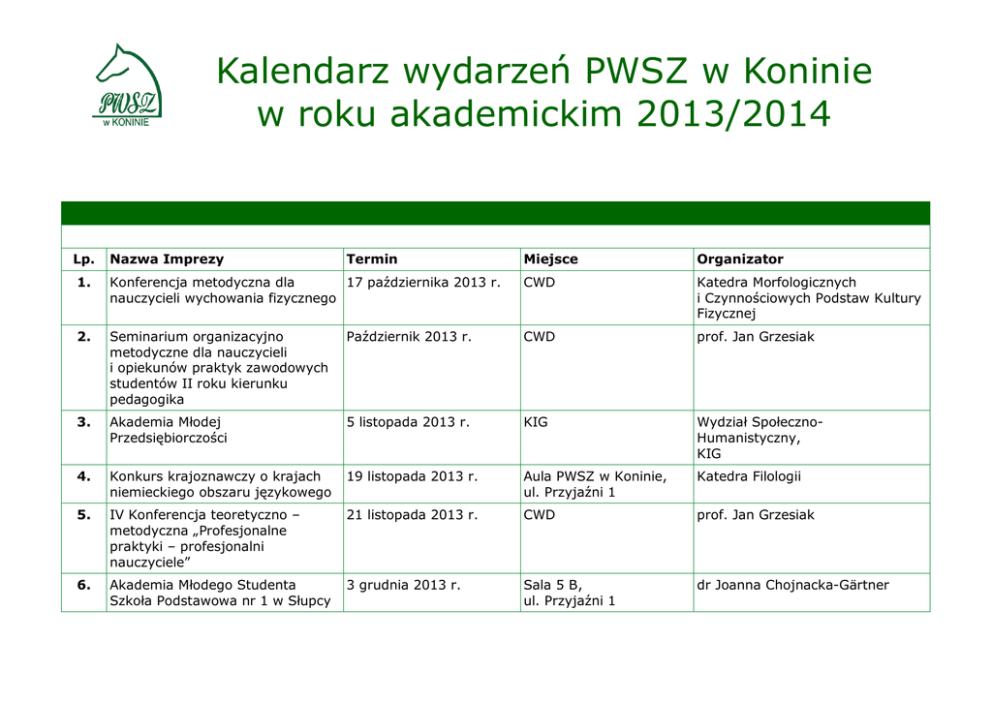 Kalendarz wydarzeń PWSZ w Koninie w roku