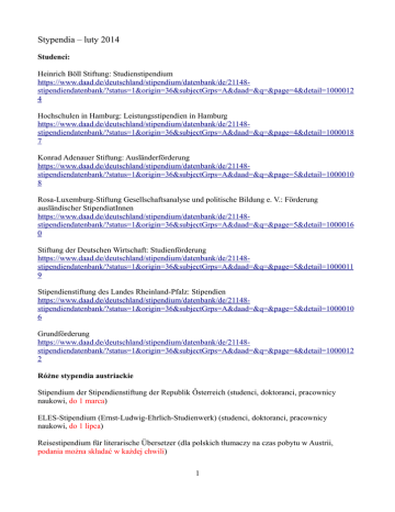 Stypendia – luty 2014 Studenci: Heinrich Böll Stiftung: Studienstipendium https://www.daad.de/deutschland/stipendium/datenbank/de/21148stipendiendatenbank/?status=1&origin=36&subjectGrps=A&daad=&q=&page=4&detail=1000012 4 Hochschulen in Hamburg: Leistungsstipendien in Hamburg https://www.daad.de/deutschland/stipendium/datenbank/de/21148stipendiendatenbank/?status=1&origin=36&subjectGrps=A&daad=&q=&page=4&detail=1000018 7 Konrad Adenauer Stiftung: Ausländerförderung https://www.daad.de/deutschland/stipendium/datenbank/de/21148stipendiendatenbank/?status=1&origin=36&subjectGrps=A&daad=&q=&page=5&detail=1000010 8 Rosa-Luxemburg-Stiftung Gesellschaftsanalyse und politische Bildung e. V.: Förderung ausländischer StipendiatInnen https://www.daad.de/deutschland/stipendium/datenbank/de/21148stipendiendatenbank/?status=1&origin=36&subjectGrps=A&daad=&q=&page=5&detail=1000016 0 Stiftung der Deutschen Wirtschaft: Studienförderung https://www.daad.de/deutschland/stipendium/datenbank/de/21148stipendiendatenbank/?status=1&origin=36&subjectGrps=A&daad=&q=&page=5&detail=1000011 9 Stipendienstiftung des Landes Rheinland-Pfalz: Stipendien https://www.daad.de/deutschland/stipendium/datenbank/de/21148stipendiendatenbank/?status=1&origin=36&subjectGrps=A&daad=&q=&page=5&detail=1000010 6 Grundförderung https://www.daad.de/deutschland/stipendium/datenbank/de/21148stipendiendatenbank/?status=1&origin=36&subjectGrps=A&daad=&q=&page=4&detail=1000012 2 Różne stypendia austriackie Stipendium der Stipendienstiftung der Republik Österreich (studenci, doktoranci, pracownicy naukowi, do 1 marca) ELES-Stipendium (Ernst-Ludwig-Ehrlich-Studienwerk) (studenci, doktoranci, pracownicy naukowi, do 1 lipca) Reisestipendium für literarische Übersetzer (dla polskich tłumaczy na czas pobytu w Austrii, podania można składać w każdej chwili) 1 Bischof-Johann-Weber-Stiftung (studenci, doktoranci, pracownicy naukowi, do 1 kwietnia) 2