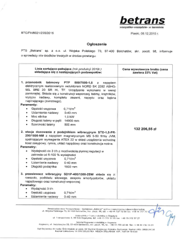 betrans BTCtFHt6021t235t2015 Ogloszen ie PTS ,,Betrans" sp. z o.o. ul. Wojska Polskiego 73, 97-4OO Belchat6w, skr. poczt, 9g, informuje o sprzedazy n/w Srodk6w trwalych w drodze przetargu: Linia sortujqco-pakujqca (rok produkcji 201 0r.) skladaj4ca sie z nastepujEcych podzespol6w: 1. przenosnik tasmowy PTP 500/7000-1,5 z Cena wywolawcza brutto (cena zawiera 23% Vat) napQdem elektrycznym reallzowanym reduktorem NORD SK 22A2 ABHG- 90L BRE' 20 SR HL TF. Urzqdzenie wykonano w wersll zamkniqtej. Sklada sie z konstrukcji wsporczej, taSmy, krqznik6w, wysypu nadawy, kompletu zsuwni, napgdu oraz bQbna napinajacego (zwrotnego). Paramenty: . . o . . GestoSC usypowa O,71Ilm3 Uziarnienie nadawy 0-40 mm Moc 1,5 kW Dtugoso tasmy w petli 14900 mm SzerokoSd 500 mm silnika taSmy z 2. stacja dozowania podajnikiem wibracyjnym STD-1,S-pR200/1500-NM z napqdem magnetycznym MS 5-S0 firmy JVM, spelniajqcym wymagania ATEX 22 w sklad urzqdzenla wchodzq: 132 206.55 zN I(osz zasypowy, rynna, uklad napgdowy oraz konstrukcja no6na. Parametry: . . . o Wydajnose do 3 Vh z mozliwosciq ptynnej regulacji w zakresie od 5-100 % wydajnosci GQstoSO usypowa 0,71Vm3 Uziarnienie nadawy 0-40 mm Dlugo66 podajnika 1500 mm 3. przesiewacz wibracyjny SDl p-400/1300-2SW sklada sie z: rzeszoto, podkladu sitowego, zespolu amortyzator6w, ukladu napqdowego oraz konstrukcji wsporczej. Parametry: . . . Wydajnose 3 Uh GQstoSc usypowa O,71tlm3 nadawy 0-40 mm Uziarnienie Przedsrebiorstwo Irdnsportowo - SplzQtowe ,,Betrans,, sD6tka z oqran czonq odpo,,!tedzialno6cre ul. Wojskd Polskiego 71, 97 400 Belchat6w, skr. poczi. 98, tet + 48 44137 72 AO fa\: +48 44 737 t2 ul Oddzlal EttL|-Trans z siedzib4w BogaLyni Transporfowa 3, 59-916 Boqalynia, tel +48 75 772 37 A\ fax: +49 7S 772 37 37 Oddzial Rogow ec z siedzibE w Roqowcu Rooowlec, ul. Insialacyjna 20, 97-400 Betchar6w, skr. poczr. 98, tet +4a 44 735 t6 06 faxt + 4a 44 73s t6 24 s4cl Rejonowy dla Loclzi-srodmte6cia w Loclzi, xx wy.tzial t<rajourego Rejesku sqdowego Numer KRS:0000134150 Kdprtdt zakledowy 16 078 500/00 pLN REGON 592178498 Nrp. 769_19-76-060 Posta6 materialu suchy, sypki, nie tworzy aglomerat6w, nie obkleja Scian 4. automatyczna waga porciujqca EWNI-POn: . . Nominalna masa porcji od sdo 30 kg Dokladnosd wazenia +l- 1% 5, maszyna pakujqca EWN-BB-Econo GSE 661 . : Nominalna masa porcji 200-1 100 kg 6.rewersyjny podajnik dozujqcy RPD it000: . Wydajnoso . Moc . PojemnoSC . Prgdkoso tasmy 3Uh 1,5 kW 0,5 m3 0,19-0,64 m/s Cena wywolawcza brutto fnstalacja odpylania (rok produkcji 2010) (cena zawiera 23% Yatl Parametry: . . . . . . . . filtr FilterMax Nederman DX 600 TR Typ wentylatora promieniowy pEeciwwybuchowy NYBORGTyp MAWENT WPSEx-4010,7 0 Nedclrman l\4oc 15 kW 57 423,78 zl Wydajnosd 3,33 m3/s Sterownica niskonapigciowa 15 kW+PTC+KL zwrotna Klapa zwrotna Nederman Wibroizolator Nederman KA-s0-PS Agregat grzewczo-wentylacyjny Juvent TERM-2,W-L; lll-K-T lstnieje mozliwosc oglgdzin w/w srodk6w w godz. 2.00 97 -410 Kleszczow po - 14,00 na terenie prs ,,Betrans" sp. z o.o. piaski uprzednim uzgodnieniu telefonicznym: 602-370-675. Informacje dodatkowe moZna uzyskaC pod numerem tel. 607-370-675, Ll Prz ecls ebiorstwo Transporlowo Sprzelowe ,,Bei/-ans" sp6lka z oqraniczona odpowtedztaln06c a Wojsl<a Poisl<ieqo73,97 400 Uelchat6w, skr. poczr.98, tet: + 4E 44 737 72 OO tay +48 44 131 72 OI Odclziat Eltur Tfans z siectzibq w Bo!aryni uL Transportowa Rogowiec, ul. Instaiacyjna 3,59 916Boqatynia,te | +4a7577237Dtfay +487577231 37 Oddziat Rogowtec z siedziba !,r Roqowcu 20,97 400 Belchar6w, skr. poczt.98, tet. +48 44 735 16 06 faxr + 48 44 735 16 24 Lodz 6rodmie6cia \\, Loctzi, XX Wy.lzial Krajoweco Relestru SECtowego NumerKRS 0000134150 KapitalZakladowy 16 078 500,00 pLN REGON 592178498 NIpr 769-19-76-060 S4d Re.jofowy dla B, betrans wszystko- wszedzie- w termi n ie Rozpatrzeniu bgdq podregaly oferty dostarczone zamknigtych kopertach z napisem: ,,pRetarg nie otwiera6" Oferty nalezy zlozy6 w sekretariacie Sp6lki Betrans, w godz 7.00 - 00 lub wyslac pocztq na adres: prs BTC/FH/6021/235/2015 15 w ,,Betrans" sp. z o. o, piaski g, gr-4io Kleszcz6w w terminie do dnia 29.12,2015 r. w.lqcznie. 1. Oferta powinna zawiera6: a. adres rub nazwq (firmg) j siedzibe oferenta oraz numer kontaktowy. Jezeri oferentem jest osoba prawnel, aktualny odpis z wlasciwego rejestru lub z centralnej ewidencji imiQ, nazwisko i informacji o dzialarnosci gospodarczei (cErDG) iezeri odrgbne przepisy wymagaia wpisu do rejestru lub zgloszenia do ewidencji d;uialalno5ci gospodarczej, wystawionego nie wczesniej niz 6 miesigcy przed uplywem terminu skladania wniosk6Mofert; b c 2. Przedmiot ofefty oraz oferowanq ceng pLN brutto, nie ni2szq nrz ww cena wywolawcza; oswiadczenie, ze oferent zapoznar siQ ze stanem przedmiotu przetargu oraz akceptuje sposob iwarunki przetargu podane w ogloszeniu - kt6rego wz6r stanowi zarqcznik nr 1 do ogloszenia. oferta powinna byc napisana w jgzyku porskim, podpisana ptzez oferenta rub upowaznionego przedstawiciela oferenta w spos6b umozliwiaiqcy identyfikaciQ podpisu upowaznienie do podpisania oferty winno byd dolqczone do of,-'rty wraz z dokumentaml potwierdzaiqcymi wlasciwq reprezenracje mocodawcy 3 okres zwiazania oferta wynosi 60 rlni; bieg terminu rozpoczyna siq wraz z uplywem terminu skladania ofert. 4 5 6 Ka2dy z Oferent6w moae zloLye tylko jednq ofertQ w jednym egzemplarzu. Dopuszczamy skladanie ofert czgsciowych, przez czese rozumie sig: czes6 pakujqca, czg56 ll - uktad odpytrajqcy. |- rinia sortui4cq - Zamiana rub wycofanie oferty dokonane przez oferenta jest skuteczne w6wczas, gdy nastqpi w formie pisemnej i zostanie :zlozone przed uplywem terminu skladania powtadomienie ofert. 7. 8 o wprowadzeniu zmian Iub wycofaniu powinno byd opakowane spos6b, co ofefta onz opatzone opisem ,,zamiana" lub w koperte i zaadresowane w ten sam ,,wycofanie,,. PTS ,,Betrans'sp. z o.o. nie wymaga wniesienia wadium Oferta zostanie odrzucona jezeli: a. b zostala zlozona po wyznaczonym terminie, w niewlaSciwym mrelscu; nie 