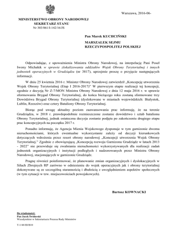 Warszawa, 2016-06MINISTERSTWO OBRONY NARODOWEJ SEKRETARZ STANU Nr 303/861/I-142/16/JS Pan Marek KUCHCIŃSKI MARSZAŁEK SEJMU RZECZYPOSPOLITEJ POLSKIEJ Odpowiadając, z upoważnienia Ministra Obrony Narodowej, na interpelację Pani Poseł Iwony Michałek w sprawie zlokalizowania oddziałów Wojsk Obrony Terytorialnej i innych jednostek operacyjnych w Grudziądzu (nr 3817), uprzejmie proszę o przyjęcie następujących informacji. W dniu 25 kwietnia 2016 r. Minister Obrony Narodowej zatwierdził „Koncepcję utworzenia Wojsk Obrony Terytorialnej (Etap I 2016-2017)” W pierwszym etapie realizacji tej koncepcji, zgodnie z decyzją Nr Z-7/MON Ministra Obrony Narodowej z dnia 12 maja 2016 r. w sprawie sformowania Brygad Obrony Terytorialnej, do końca bieżącego roku zostaną sformowane trzy Dowództwa Brygad Obrony Terytorialnej (dyslokowane w miastach wojewódzkich: Białystok, Lublin, Rzeszów) oraz cztery Bataliony Obrony Terytorialnej. Biorąc pod uwagę aktualny poziom zaawansowania prac informuję, że na terenie Grudziądza, w 2018 r. prawdopodobnie rozmieszczone zostanie dowództwo i sztab batalionu Obrony Terytorialnej, jednak ostateczna decyzja zostanie podjęta po zakończeniu drugiego etapu prac koncepcyjnych na początku 2017 r. Ponadto informuję, że Agencja Mienia Wojskowego dysponuje w tym garnizonie dwoma nieruchomościami, których ewentualne wykorzystanie zależy od decyzji kierunkowych dotyczących wdrożenia przez resort obrony narodowej „Koncepcji utworzenia Wojsk Obrony Terytorialnej.” Zgodnie z obowiązującą „Koncepcją rozwoju Garnizonu Grudziądz w latach 2013 - 2022” nie przewiduje się zwalniania nieruchomości wykorzystywanych dla realizacji zadań jednostek organizacyjnych i instytucji podległych i nadzorowanych przez Ministra Obrony Narodowej, stacjonujących w garnizonie Grudziądz. Pragnę również poinformować, że planowanie zmian organizacyjnych i dyslokacyjnych w Siłach Zbrojnych RP zarówno w odniesieniu do wojsk operacyjnych jak i obrony terytorialnej dokonywane są ze szczególną starannością i dbałością z uwzględnieniem aspektów społecznych (w tym sytuacji w tzw. miejscowościach powojskowych). Bartosz KOWNACKI Do wiadomości: Pan Jacek Świderski Wicedyrektor w Sekretariacie Prezesa Rady Ministrów T-1/48/III/B10