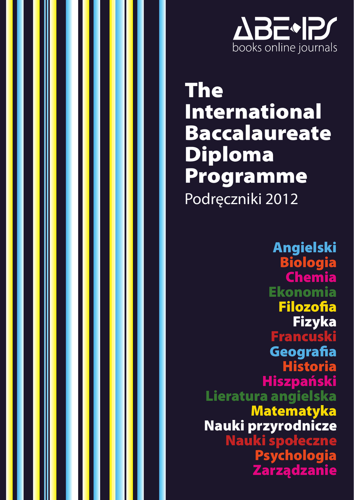 The International Baccalaureate Diploma Programme Podręczniki 2012 Angielski Biologia Chemia Ekonomia Filozofia Fizyka Francuski Geografia Historia Hiszpański Lieratura angielska Matematyka Nauki przyrodnicze Nauki społeczne Psychologia Zarządzanie IB DIPLOMA PROGRAMME — POLECANE TYTUŁY English Literature for the IB Diploma James, David Cambridge University Press ISBN - 13: 9781107402232 Sierpień 2011 Cena: £ 25.00 Angielski Wri en by experienced, prac#sing IB English teachers, this new #tle is a clear and concise guide to studying the revised Language A Literature syllabus in English for the IB Diploma. It covers all parts of the Language A Literature programme at both Standard and Higher Levels, and contains a wide variety of text extracts including works originally wri en in English and World literature in transla#on. Integrated into the coursebook are informa#on and guidance on assessment, Theory of Knowledge opportuni#es, Extended Essay sugges#ons, and ac#vi#es to help students read, think, discuss, write and present ideas. IB Course Companion: English A Language and Literature Allison, Rob Oxford University Press ISBN - 13: 9780199135424 Maj 2011 Cena: £ 27.50 Angielski This new book has been specifically developed for the 2011 English A: Language and Literature syllabus at both Standard and Higher Level. It provides an engaging explora#on of a wide focus on language and literature, along with a wealth of opportuni#es for students to develop skills in reading, viewing, listening, speaking and producing works in English. Cambridge Biology for the IB Diploma Coursebook Walpole, Brenda Cambridge University Press ISBN - 13: 9780521171786 Marzec 2011 Cena: £ 35.00 Biologia A new #tle that offers an in-depth analysis of all topics covered in the IB syllabus, preparing students with the skills needed to succeed in the examina#on. Biology for the IB Diploma is a comprehensive new book wri en by an experienced author team. The text offers an in-depth analysis of all topics covered in the IB syllabus, preparing students with the skills needed to succeed in the examina#on. Links to Theory of www.abe.pl Knowledge themes are included. Features include: clearly stated learning objec#ves at the start of each sec#on; quick ques#ons throughout each chapter; accessible language for students at all levels; exam-style ques#ons; and a glossary and index. The accompanying CD-ROM contains eight chapters covering the syllabus op#ons, sample examina#on papers and model answers. 1 IB DIPLOMA PROGRAMME — POLECANE TYTUŁY IB Course Companion: Biology Allott, Andrew Oxford University Press ISBN - 13: 9780199139569 Kwiecień 2010 Cena: £ 26.00 Biologia The extremely popular IB Diploma Course Companion for Biology has been thoroughly revised, updated and extended. S#ll uniquely developed with the IB for the latest syllabus, the content has remained largely untouched, the main change being the improved page design to allow be er access to the content. Op#on units have been more extensively revised and content is covered more rigorously.All of the features from the first edi#on have been retained - including the wider aims of the IB through connec#ons to TOK, interna#onal-mindedness and the IB learner profile. Data-based ques#on and ideas for prac#cal experiments reinforce learning. Now in colour, more diagrams and photographs have been included to illustrate the concepts discussed and to place the subject in context.The CD material has been designed... Chemistry for the IB Diploma Coursebook with CD-ROM Owen, Steve Cambridge University Press ISBN - 13: 9780521182942 Maj 2011 Cena: £ 35.00 Chemia A comprehensive new book, with accompanying CD-ROM, offering an indepth analysis of the IB syllabus at both Standard and Higher Levels. Using accessible language, it efficiently presents topics to op#mise learning. Worked examples help students tackle different types of ques#ons; Ques#ons throughout to test understanding, and exam-style ques#ons at the end of each chapter. IB Course Companion: Economics Blink, Jocelyn Oxford University Press ISBN - 13: 9780199184996 Marzec 2011 Cena: £ 26.50 Ekonomia The new edi#on of this bestselling Course Companion has been specifically designed to support the student through the IB Diploma Programme in Economics.Wri en by experienced authors and examiners for the 2011 syllabus content, this book provides students with materials and ac#vi#es that will help them towards success in the course. It also offers advice and guidance to help students address the new 2 quan#ta#ve elements of the syllabus. It now comes with even more material on a brand new student CD-ROM, offering 17 handy revision sheets, specimen papers, a glossary and weblinks for further research. In addi#on the book provides ac#vi#es integrated with study and learning approaches, TOK, and the IB learner profile to ensure that students are fully rounded par#cipants in the programme. Examples, features... www.abe.pl IB DIPLOMA PROGRAMME — POLECANE TYTUŁY Pearson Baccalaureate Economics for the IB Diploma Maley, Sean Pearson Educa on Limited ISBN - 13: 9780435089986 Wrzesień 2011 Cena: £ 32.70 Ekonomia Pearson Baccalaureate: Economics is an exci#ng new textbook with integrated online learning resources. For students and teachers of the Interna#onal Baccalaureate Diploma, wri en and developed by prac#sing IB teachers. IB Course Companion: Physics Kirk, Tim Oxford University Press ISBN - 13: 9780199139545 Marzec 2010 Cena: £ 26.00 Fizyka The extremely popular IB Diploma Course Companion for Physics has been thoroughly revised, updated and extended. S#ll uniquely developed with the IB for the latest syllabus, the content has remained largely untouched, the main change being the improved page design to allow be er access to the content. Op#on units have been more extensively revised and content is covered more rigorously. All of the features from the first edi#on have been retained - including the wider aims