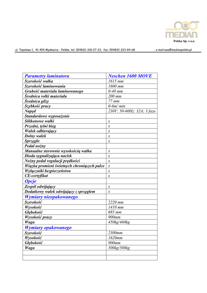 Polska Sp. z o.o. ul. Topolowa 1, 41-404 Mysłowice - Polska, tel. 004832-318-27-23, fax. 004832-223-84-68 Parametry laminatora Neschen 1600 MOVE Szerokość wałka Szerokość laminowania Grubość materiału laminowanego Średnica rolki materiału Średnica gilzy Szybkość pracy Napęd Standardowe wyposaŜenie Silikonowe wałki Przedni, tylni bieg Wałek odbierający Dolny wałek Sprzęgło Pedał noŜny Manualne sterownie wysokością wałka Dioda sygnalizująca nacisk NoŜny pedał regulacji prędkości Wiązka promieni świetnych chroniących palce Wyłączniki bezpieczeństwa CE-certyfikat 1615 mm 1600 mm 0-40 mm 200 mm 77 mm 0-6m/ min 230V; 50-60Hz; 32A; 3 faza x x x x x x x x x x x Opcje Zespół odwijający Dodatkowy wałek odwijający z sprzęgłem x x Wymiary nieopakowanego Szerokość Wysokość Głębokość Wysokość pracy Waga 2220 mm 1410 mm 685 mm 900mm 450kg/460kg Wymiary opakowanego Szerokość Wysokość Głębokość Waga 2300mm 1620mm 900mm 500kg/508kg e-mail:[email protected] Dodatkowe wyposaŜenie laminatora, osobno wycenione. Cena laminatora Neschen 1600 MOVE bez dodatkowego wyposaŜenia: 8 984 €. Numer artykułu: 6027316 Termin realizacji: 14 dni od złoŜenia zamówienia. Serwis: zapewniamy pełen serwis laminatora a takŜe wsparcie technologiczne oraz przeszkolenie dotyczące obsługi laminatora.