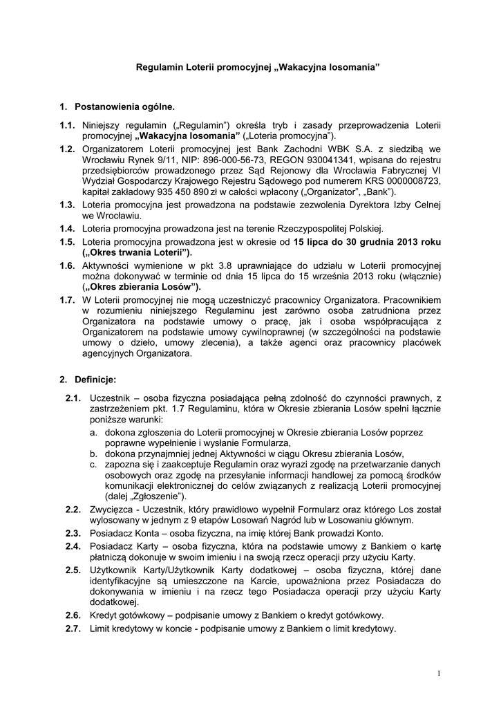Regulamin Loterii promocyjnej „Wakacyjna losomania” 1. Postanowienia ogólne. 1.1. Niniejszy regulamin („Regulamin”) określa tryb i zasady przeprowadzenia Loterii promocyjnej „Wakacyjna losomania” („Loteria promocyjna”). 1.2. Organizatorem Loterii promocyjnej jest Bank Zachodni WBK S.A. z siedzibą we Wrocławiu Rynek 9/11, NIP: 896-000-56-73, REGON 930041341, wpisana do rejestru przedsiębiorców prowadzonego przez Sąd Rejonowy dla Wrocławia Fabrycznej VI Wydział Gospodarczy Krajowego Rejestru Sądowego pod numerem KRS 0000008723, kapitał zakładowy 935 450 890 zł w całości wpłacony („Organizator”, „Bank”). 1.3. Loteria promocyjna jest prowadzona na podstawie zezwolenia Dyrektora Izby Celnej we Wrocławiu. 1.4. Loteria promocyjna prowadzona jest na terenie Rzeczypospolitej Polskiej. 1.5. Loteria promocyjna prowadzona jest w okresie od 15 lipca do 30 grudnia 2013 roku („Okres trwania Loterii”). 1.6. Aktywności wymienione w pkt 3.8 uprawniające do udziału w Loterii promocyjnej można dokonywać w terminie od dnia 15 lipca do 15 września 2013 roku (włącznie) („Okres zbierania Losów”). 1.7. W Loterii promocyjnej nie mogą uczestniczyć pracownicy Organizatora. Pracownikiem w rozumieniu niniejszego Regulaminu jest zarówno osoba zatrudniona przez Organizatora na podstawie umowy o pracę, jak i osoba współpracująca z Organizatorem na podstawie umowy cywilnoprawnej (w szczególności na podstawie umowy o dzieło, umowy zlecenia), a także agenci oraz pracownicy placówek agencyjnych Organizatora. 2. Definicje: 2.1. Uczestnik – osoba fizyczna posiadająca pełną zdolność do czynności prawnych, z zastrzeżeniem pkt. 1.7 Regulaminu, która w Okresie zbierania Losów spełni łącznie poniższe warunki: a. dokona zgłoszenia do Loterii promocyjnej w Okresie zbierania Losów poprzez poprawne wypełnienie i wysłanie Formularza, b. dokona przynajmniej jednej Aktywności w ciągu Okresu zbierania Losów, c. zapozna się i zaakceptuje Regulamin oraz wyrazi zgodę na przetwarzanie danych osobowych oraz zgodę na przesyłanie informacji handlowej za pomocą środków komunikacji elektronicznej do celów związanych z realizacją Loterii promocyjnej (dalej „Zgłoszenie”). 2.2. Zwycięzca - Uczestnik, który prawidłowo wypełnił Formularz oraz którego Los został wylosowany w jednym z 9 etapów Losowań Nagród lub w Losowaniu głównym. 2.3. Posiadacz Konta – osoba fizyczna, na imię której Bank prowadzi Konto. 2.4. Posiadacz Karty – osoba fizyczna, która na podstawie umowy z Bankiem o kartę płatniczą dokonuje w swoim imieniu i na swoją rzecz operacji przy użyciu Karty. 2.5. Użytkownik Karty/Użytkownik Karty dodatkowej – osoba fizyczna, której dane identyfikacyjne są umieszczone na Karcie, upoważniona przez Posiadacza do dokonywania w imieniu i na rzecz tego Posiadacza operacji przy użyciu Karty dodatkowej. 2.6. Kredyt gotówkowy – podpisanie umowy z Bankiem o kredyt gotówkowy. 2.7. Limit kredytowy w koncie - podpisanie umowy z Bankiem o limit kredytowy. 1 2.8. Konto/Konto osobiste - rachunek rozliczeniowo oszczędnościowy w złotych zawarty zgodnie z umową z Bankiem. 2.9. Karta kredytowa – płatnicza karta kredytowa wydana przez Bank. 2.10. Karta debetowa – karta płatnicza wydana przez Bank do Konta osobistego dla klientów detalicznych. 2.11. Karta PAYBACK – Karty debetowe MasterCard PAYBACK Omni, MasterCard PAYBACK, MasterCard PAYBACK Multi, Naklejka MasterCard PAYBACK, Naklejka MasterCard PAYBACK Omni lub Karta kredytowa MasterCard PAYBACK. 2.12. Transakcja bezgotówkowa - płatność Kartą w kraju lub zagranicą dokonana przez Uczestnika w punkcie handlowo-usługowym lub w Internecie na kwotę minimum 20 zł. 2.13. Usługa Ratio – usługa oferowana w ramach limitu kredytowego przyznanego Posiadaczowi Karty kredytowej umożliwiająca rozłożenie na raty, zakupów dokonanych Kartą kredytową. 2.14. Wpływ na Konto – dokonanie w danym miesiącu jednorazowego zasilenia Konta na kwotę min. 1000 zł z wyłączeniem zasilenia z innego rachunku Uczestnika w Banku oraz wpłat gotówkowych. 2.15. Konto wspólne - rachunek rozliczeniowo oszczędnościowy w złotych zawarty zgodnie z umową z Bankiem i prowadzony dla więcej niż 1 osoby. 2.16. Aktywność – poszczególne działania Uczestnika opisane w pkt. 3.8, które uprawniają go do wzięcia udziału w Loterii pod warunkiem prawidłowego wypełnienia i wysłania Formularza. 2.17. Los – przyznawany Uczestnikowi za dokonane Aktywności i uprawniający do wzięcia udziału w Losowaniu. 2.18. Losowanie – losowy wybór zwycięzców Nagród w Loterii promocyjnej dokonany zgodnie z zasadami opisanymi w punkcie 5.2 i 5.3. 2.19. Formularz – formularz zgłoszeniowy dostępny na stronie Organizatora www.bzwbk.pl/loteria oraz w oddziałach Banku, zawierający następujące pola: imię, nazwisko, PESEL, adres e-mail, potwierdzenie adresu email, numer telefonu kontaktowego, akceptację warunków Regulaminu oraz wyrażenie zgody na przetwarzanie danych osobowych oraz zgody na przesyłanie informacji handlowej za pomocą środków komunikacji elektronicznej do celów związanych z realizacją Loterii promocyjnej. 2.20. Data zgłoszenia do loterii – data pierwszego wypełnienia i wysłania Formularza. 3. Zasady prowadzenia Loterii promocyjnej. 3.1. Zgłoszenia do Loterii promocyjnej przez Uczestnika można dokonywać od 15 lipca do 15 września 2013 roku. 3.2. Uczestnik bierze udział w kolejnych etapach i będzie brany pod uwagę w kolejnych Losowaniach pod warunkiem uzyskania w danym etapie Losów za Aktywność. Uczestnik otrzymuje Losy za Aktywność począwszy od etapu, w którym dokonał Zgłoszenia, za wyjątkiem pkt. 3.3 i 3.4 oraz za wyjątkiem osób, które osiągnęły pełnoletniość w trakcie etapu, w którym dokonały Zgłoszenia. Ci Uczestnicy otrzymują losy za czynności dokonane począwszy od dnia uzyskania pełnoletniości. 3.3. W przypadku p