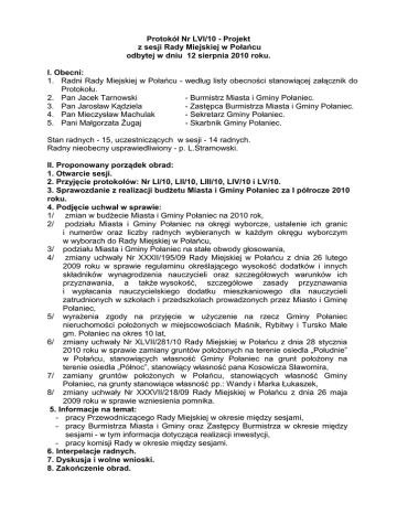 Protokół Nr LVI/10 - Projekt z sesji Rady Miejskiej w Połańcu odbytej w dniu 12 sierpnia 2010 roku. I. Obecni: 1. Radni Rady Miejskiej w Połańcu - według listy obecności stanowiącej załącznik do Protokołu. 2. Pan Jacek Tarnowski - Burmistrz Miasta i Gminy Połaniec. 3. Pan Jarosław Kądziela - Zastępca Burmistrza Miasta i Gminy Połaniec. 4. Pan Mieczysław Machulak - Sekretarz Gminy Połaniec. 5. Pani Małgorzata śugaj - Skarbnik Gminy Połaniec. Stan radnych - 15, uczestniczących w sesji - 14 radnych. Radny nieobecny usprawiedliwiony - p. L.Stramowski. II. Proponowany porządek obrad: 1. Otwarcie sesji. 2. Przyjęcie protokołów: Nr LI/10, LII/10, LIII/10, LIV/10 i LV/10. 3. Sprawozdanie z realizacji budŜetu Miasta i Gminy Połaniec za I półrocze 2010 roku. 4. Podjęcie uchwał w sprawie: 1/ zmian w budŜecie Miasta i Gminy Połaniec na 2010 rok, 2/ podziału Miasta i Gminy Połaniec na okręgi wyborcze, ustalenie ich granic i numerów oraz liczby radnych wybieranych w kaŜdym okręgu wyborczym w wyborach do Rady Miejskiej w Połańcu, 3/ podziału Miasta i Gminy Połaniec na stałe obwody głosowania, 4/ zmiany uchwały Nr XXXII/195/09 Rady Miejskiej w Połańcu z dnia 26 lutego 2009 roku w sprawie regulaminu określającego wysokość dodatków i innych składników wynagrodzenia nauczycieli oraz szczegółowych warunków ich przyznawania, a takŜe wysokość, szczegółowe zasady przyznawania i wypłacania nauczycielskiego dodatku mieszkaniowego dla nauczycieli zatrudnionych w szkołach i przedszkolach prowadzonych przez Miasto i Gminę Połaniec, 5/ wyraŜenia zgody na przyjęcie w uŜyczenie na rzecz Gminy Połaniec nieruchomości połoŜonych w miejscowościach Maśnik, Rybitwy i Tursko Małe gm. Połaniec na okres 10 lat, 6/ zmiany uchwały Nr XLVII/281/10 Rady Miejskiej w Połańcu z dnia 28 stycznia 2010 roku w sprawie zamiany gruntów połoŜonych na terenie osiedla „Południe” w Połańcu, stanowiących własność Gminy Połaniec na grunt połoŜony na terenie osiedla „Północ”, stanowiący własność pana Kosowicza Sławomira, 7/ zamiany gruntów połoŜonych w Połańcu, stanowiących własność Gminy Połaniec, na grunty stanowiące własność pp.: Wandy i Marka Łukaszek, 8/ zmiany uchwały Nr XXXVII/218/09 Rady Miejskiej w Połańcu z dnia 26 maja 2009 roku w sprawie wzniesienia pomnika. 5. Informacje na temat: - pracy Przewodniczącego Rady Miejskiej w okresie między sesjami, - pracy Burmistrza Miasta i Gminy oraz Zastępcy Burmistrza w okresie między sesjami - w tym informacja dotycząca realizacji inwestycji, - pracy komisji Rady w okresie między sesjami. 6. Interpelacje radnych. 7. Dyskusja i wolne wnioski. 8. Zakończenie obrad. III. Przebieg obrad: Ad. 1. Obradom LVI sesji przewodniczył i otwarcia dokonał Przewodniczący Rady Miejskiej w Połańcu p. Stanisław Lolo. Powitał radnych oraz wszystkich zaproszonych gości. Na podstawie listy obecności stwierdził prawomocność obrad, informując, Ŝe w sali znajduje się 14 radnych, to jest wymagane quorum do podejmowania prawomocnych uchwał. Następnie odczytał porządek obrad i zapytał, czy są do niego uwagi. Pan Mieczysław Machulak - Sekretarz Gminy Połaniec z upowaŜnienia p. Burmistrza zawnioskował o zdjęcie z porządku obrad w pkt 4 pppkt 8 tj. projektu uchwały w sprawie: zmiany uchwały Nr XXXVII/218/09 Rady Miejskiej w Połańcu z dnia 26 maja 2009 roku w sprawie wzniesienia pomnika. Powód: nie ustalenie treści załącznika, która miała być przedmiotem obrad. Pan Edward Bobiński - radny zasygnalizował, Ŝe w którymś z protokołów z sesji jest zobowiązanie p. Przewodniczącego, Ŝe na dzisiejszej sesji będzie przedstawiona informacja o przebiegu powodzi. Zaznaczył, Ŝe jeŜeli znajduje się to w jednym z punktów to nie ma uwag, jeśli nie - ten punkt chciałby wprowadzić. Pan Przewodniczący Rady Miejskiej w Połańcu Stanisław Lolo odparł, Ŝe informacja powyŜsza będzie przedstawiona w sprawach róŜnych, po czym poprosił o przegłosowanie zawnioskowanej zmiany. (Podczas głosowania w sali obrad obecnych było 14 radnych). Głosowanie: Za przyjęciem - 14 osób (jednogłośnie). Pan Przewodniczący Rady Miejskiej w Połańcu Stanisław Lolo poprosił o przegłosowanie porządku obrad wraz z zawnioskowaną zmianą. (Podczas głosowania w sali obrad obecnych było 14 radnych). Głosowanie: Za przyjęciem - 14 osób (jednogłośnie). Porządek obraz wraz z zawnioskowaną zmianą został przyjęty. Ad. 2. Pan Przewodniczący Rady Miejskiej Stanisław Lolo zapytał, czy radni zgłaszają uwagi do Protokołu Nr LI/10 z dnia 22 kwietnia 2010 roku. Pan Edward Bobiński - radny zgłosił, Ŝe w powyŜszym protokole brakuje mu sprawozdania z działalności Rady Miejskiej. Jest tam co prawda odnośnik, Ŝe sprawozdanie jest do wglądu w Biurze Rady Miejskiej, ale uwaŜa, Ŝe powinno znajdować się w protokole, bo to jest skutek całorocznej działalności Rady. Pan Przewodniczący Rady Miejskiej Stanisław Lolo odparł, Ŝe sprawozdanie zostanie zamieszczone w powyŜszym protokole. W związku z tym w Protokole Nr LI/10 z dnia 22 kwietnia 2010 roku umieszczono sprawozdanie z działalności Rady Miejskiej za 2009 rok. 2 Pan Przewodniczący Rady Miejskiej Stanisław Lolo poprosił o przegłosowanie Protokołu LI/10 z dnia 22 kwietnia 2010 roku wraz z zamieszczonym sprawozdaniem z działalności Rady Miejskiej w Połańcu za 2009 rok. (Podczas głosowania w sali obrad obecnych było 14 radnych). Głosowanie: Za przyjęciem protokołu - 12 osób Przeciw - osób 2 osoby Wstrzymało się Protokół Nr LI/10 z dnia 22 kwietnia 2010 roku został przyjęty. Pan Przewodniczący Rady Miejskiej Stanisław Lolo zapytał, czy radni zgłaszają uwagi do Protokołu Nr LII/10 z dnia 9 maja 2010 roku. Uwag nie wniesiono, więc Pan Przewodniczący Rady Miejskiej Stanisław Lolo poprosił o przegłosowanie Protokołu Nr LII/10 z dnia 9 maja 2010 roku. (Podczas głosowania