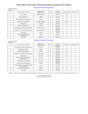 Plan studiów na kierunku: Politologia (studia niestacjonarne, II stopnia) Specjalność: Dziennikarstwo polityczne I ROK STUDIÓW I semestr Lp. Nazwa modułu kształcenia Rodzaj zajęć dydaktycznych* O/F** Forma zaliczenia*** Liczba godzin Punkty ECTS 1. Teoria polityki wykład/ćwiczenia O egzamin 22/14 6 2. Ruchy społeczne wykład O egzamin 22 4 3. Historia instytucji politycznych wykład O egzamin 22 4 4. Filozofia i etyka polityki wykład/ćwiczenia O egzamin 22/14 6 5. Seminarium ćwiczenia O zaliczenie 20 4 6. Historia dziennikarstwa wykład F egzamin 22 5 7. Informacyjne gatunki dziennikarskie konwersatorium F 14 3 8. Polityka w wywiadach i reportażach konwersatorium F 14 3 9. Federalism wykład F egzamin 14 3 10. Storia del pensiero politico contemporaneo wykład F egzamin 14 3 11. Język obcy Ćwiczenia O Zaliczenie 14 1 Liczba godzin Punkty ECTS 14 3 egzamin 22 4 egzamin 22 4 14 3 20 6 14 3 14 3 14 3 zaliczenie na ocenę zaliczenie na ocenę Specjalność: Dziennikarstwo polityczne I ROK STUDIÓW II semestr Lp. Nazwa modułu kształcenia Rodzaj zajęć dydaktycznych* O/F** 1. Metodologia badań politologicznych ćwiczenia O 2. Psychologia polityki wykład O 3. Decydowanie polityczne wykład O 4. Forma zaliczenia*** zaliczenie na ocenę zaliczenie na ocenę zaliczenie Podstawy warsztatu dziennikarskiego ćwiczenia O 5. Seminarium ćwiczenia O 6. Techniki tworzenia programów informacyjnych ćwiczenia F 7. Organizacja pracy redakcji ćwiczenia F 8. Teoria form dziennikarskich wykład F 9. Communism, Post-Communism and Democratization wykład F egzamin 14 3 10. La France contemporaine wykład F egzamin 14 3 11. Język obcy Ćwiczenia O Egzamin 14 1 zaliczenie na ocenę zaliczenie na ocenę zaliczenie na ocenę Student w ciągu I roku ma obowiązek wybrać 2 przedmioty zakończone egzaminem, w tym 1 w języku obcym i 2 zakończone zaliczeniem z oceną Łączna liczba godzin: 292 Łączna liczba punktów ECTS: 60 Specjalność: Instytucje i zarządzanie polityką I ROK STUDIÓW I semestr Lp. Nazwa modułu kształcenia Rodzaj zajęć dydaktycznych* O/F** Forma zaliczenia*** Liczba godzin Punkty ECTS 1. Teoria polityki wykład/ćwiczenia O egzamin 22/14 6 2. Ruchy społeczne wykład O egzamin 22 4 3. Historia instytucji politycznych wykład O egzamin 22 4 4. Filozofia i etyka polityki wykład/ćwiczenia O egzamin 22/14 6 5. Seminarium ćwiczenia O zaliczenie 20 4 14 3 14 3 14 3 14 3 14 3 6. Współczesne instytucje polityczne wykład F 7. Praktyka działania publicznego konwersatorium F konwersatorium F konwersatorium F wykład F zaliczenie na ocenę zaliczenie na ocenę zaliczenie na ocenę zaliczenie na ocenę egzamin wykład F egzamin 14 3 Ćwiczenia O Zaliczenie 14 1 Liczba godzin Punkty ECTS 14 3 egzamin 14 4 Władza wykonawcza we współczesnym świecie Parlamentaryzm państw demokratycznych Federalism 8. 9. 10. 11. 11. Storia del pensiero politico contemporaneo Język obcy Specjalność: Instytucje i zarządzanie polityką I ROK STUDIÓW II semestr Lp. Nazwa modułu kształcenia Rodzaj zajęć dydaktycznych* O/F** 1. Metodologia badań politologicznych ćwiczenia O 2. Psychologia polityki wykład O 3. Decydowanie polityczne wykład O egzamin 22 4 4. Modele współczesnej demokracji a społeczeństwo obywatelskie ćwiczenia O zaliczenie na ocenę 14 3 5. Seminarium ćwiczenia O zaliczenie 20 6 wykład F egzamin 22 5 14 3 14 3 6. 7. Państwo w stosunkach międzynarodowych Współczesne struktury partii politycznych w Polsce konwersatorium F Forma zaliczenia*** zaliczenie na ocenę zaliczenie na ocenę zaliczenie na ocenę 8. Zarządzanie projektami ćwiczenia F 9. Communism, Post-Communism and Democratization wykład F egzamin 14 3 10. La France contemporaine wykład F egzamin 14 3 11. Język obcy Ćwiczenia O Egzamin 14 1 Student w ciągu I roku ma obowiązek wybrać 2 przedmioty zakończone egzaminem, w tym 1 w języku obcym i 2 zakończone zaliczeniem z oceną Łączna liczba godzin: 284 Łączna liczba punktów ECTS: 60 Specjalność: Transformacje polityczne i ustrojowe I ROK STUDIÓW I semestr Lp. Nazwa modułu kształcenia Rodzaj zajęć dydaktycznych* O/F** Forma zaliczenia*** Liczba godzin Punkty ECTS 1. Teoria polityki wykład/ćwiczenia O egzamin 22/14 6 2. Ruchy społeczne wykład O egzamin 22 4 3. Historia instytucji politycznych wykład O egzamin 22 4 4. Filozofia i etyka polityki wykład/ćwiczenia O egzamin 22/14 6 5. Seminarium ćwiczenia O zaliczenie 20 4 14 3 14 3 zaliczenie na ocenę zaliczenie na ocenę 6. Współczesne instytucje polityczne wykład F 7. Kształtowanie się zachodnich tradycji prawnych konwersatorium F Federalism wykład F egzamin 14 3 wykład F egzamin 14 3 Ćwiczenia O Zaliczenie 14 1 Liczba godzin Punkty ECTS 14 3 egzamin 14 4 8. 9. 10. Storia del pensiero politico contemporaneo Język obcy Specjalność: Transformacje polityczne i ustrojowe I ROK STUDIÓW II semestr Lp. Nazwa modułu kształcenia Rodzaj zajęć dydaktycznych* O/F** 1. Metodologia badań politologicznych ćwiczenia O 2. Psychologia polityki wykład O 3. Decydowanie polityczne wykład O egzamin 22 4 4. Etniczne i religijne problemy współczesnej Europy ćwiczenia O zaliczenie na ocenę 14 3 Seminarium ćwiczenia O zaliczenie 20 6 ćwiczenia F zaliczenie na ocenę 14 3 wykład F egzamin 22 5 konwersatorium F zaliczenie na ocenę 14 3 wykład F egzamin 14 3 5. 6. 7. 8. 9. Modele współczesnej demokracji a społeczeństwo obywatelskie Państwo w stosunkach międzynarodowych Współczesne struktury partii politycznych w Polsce Communism, Post-Communism and Democratization Forma zaliczenia*** zaliczenie na ocenę 10. La France contemporaine wykład F egzamin 14 3 11. Język obcy Ćwiczenia O Egzamin 14 1 Student w ciągu I roku ma obowiązek wybrać 2 przedmioty zakończone egzaminem, w tym 1 w języku obcym i 2 zakończone zaliczeniem z oceną Łączna liczba godzin: 284 Łączna liczba punktów ECTS: 60 Specjalność: Dziennikarstwo polityczne II ROK STUDIÓW III semestr