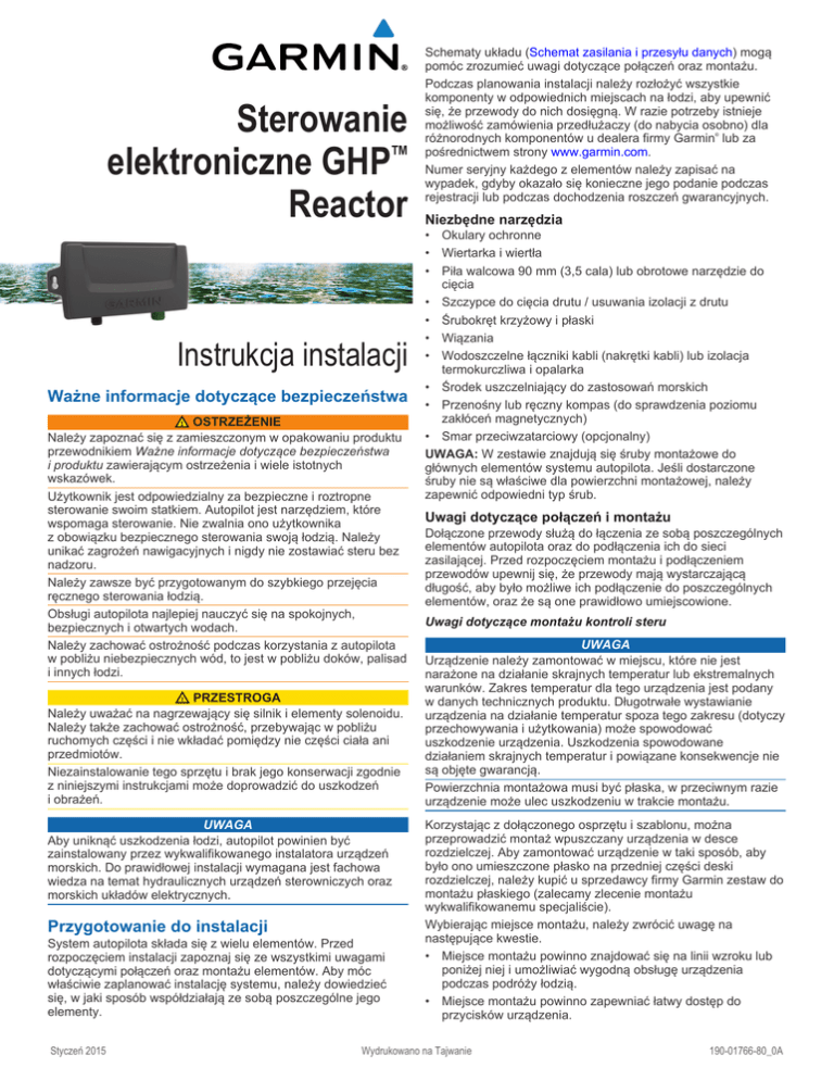 Sterowanie elektroniczne GHP™ Reactor Instrukcja instalacji Ważne informacje dotyczące bezpieczeństwa OSTRZEŻENIE Należy zapoznać się z zamieszczonym w opakowaniu produktu przewodnikiem Ważne informacje dotyczące bezpieczeństwa i produktu zawierającym ostrzeżenia i wiele istotnych wskazówek. Użytkownik jest odpowiedzialny za bezpieczne i roztropne sterowanie swoim statkiem. Autopilot jest narzędziem, które wspomaga sterowanie. Nie zwalnia ono użytkownika z obowiązku bezpiecznego sterowania swoją łodzią. Należy unikać zagrożeń nawigacyjnych i nigdy nie zostawiać steru bez nadzoru. Należy zawsze być przygotowanym do szybkiego przejęcia ręcznego sterowania łodzią. Obsługi autopilota najlepiej nauczyć się na spokojnych, bezpiecznych i otwartych wodach. Należy zachować ostrożność podczas korzystania z autopilota w pobliżu niebezpiecznych wód, to jest w pobliżu doków, palisad i innych łodzi. PRZESTROGA Należy uważać na nagrzewający się silnik i elementy solenoidu. Należy także zachować ostrożność, przebywając w pobliżu ruchomych części i nie wkładać pomiędzy nie części ciała ani przedmiotów. Niezainstalowanie tego sprzętu i brak jego konserwacji zgodnie z niniejszymi instrukcjami może doprowadzić do uszkodzeń i obrażeń. UWAGA Aby uniknąć uszkodzenia łodzi, autopilot powinien być zainstalowany przez wykwalifikowanego instalatora urządzeń morskich. Do prawidłowej instalacji wymagana jest fachowa wiedza na temat hydraulicznych urządzeń sterowniczych oraz morskich układów elektrycznych. Przygotowanie do instalacji System autopilota składa się z wielu elementów. Przed rozpoczęciem instalacji zapoznaj się ze wszystkimi uwagami dotyczącymi połączeń oraz montażu elementów. Aby móc właściwie zaplanować instalację systemu, należy dowiedzieć się, w jaki sposób współdziałają ze sobą poszczególne jego elementy. Styczeń 2015 Schematy układu (Schemat zasilania i przesyłu danych) mogą pomóc zrozumieć uwagi dotyczące połączeń oraz montażu. Podczas planowania instalacji należy rozłożyć wszystkie komponenty w odpowiednich miejscach na łodzi, aby upewnić się, że przewody do nich dosięgną. W razie potrzeby istnieje możliwość zamówienia przedłużaczy (do nabycia osobno) dla różnorodnych komponentów u dealera firmy Garmin lub za pośrednictwem strony www.garmin.com. Numer seryjny każdego z elementów należy zapisać na wypadek, gdyby okazało się konieczne jego podanie podczas rejestracji lub podczas dochodzenia roszczeń gwarancyjnych. ® Niezbędne narzędzia • Okulary ochronne • Wiertarka i wiertła • Piła walcowa 90 mm (3,5 cala) lub obrotowe narzędzie do cięcia • Szczypce do cięcia drutu / usuwania izolacji z drutu • Śrubokręt krzyżowy i płaski • Wiązania • Wodoszczelne łączniki kabli (nakrętki kabli) lub izolacja termokurczliwa i opalarka • Środek uszczelniający do zastosowań morskich • Przenośny lub ręczny kompas (do sprawdzenia poziomu zakłóceń magnetycznych) • Smar przeciwzatarciowy (opcjonalny) UWAGA: W zestawie znajdują się śruby montażowe do głównych elementów systemu autopilota. Jeśli dostarczone śruby nie są właściwe dla powierzchni montażowej, należy zapewnić odpowiedni typ śrub. Uwagi dotyczące połączeń i montażu Dołączone przewody służą do łączenia ze sobą poszczególnych elementów autopilota oraz do podłączenia ich do sieci zasilającej. Przed rozpoczęciem montażu i podłączeniem przewodów upewnij się, że przewody mają wystarczającą długość, aby było możliwe ich podłączenie do poszczególnych elementów, oraz że są one prawidłowo umiejscowione. Uwagi dotyczące montażu kontroli steru UWAGA Urządzenie należy zamontować w miejscu, które nie jest narażone na działanie skrajnych temperatur lub ekstremalnych warunków. Zakres temperatur dla tego urządzenia jest podany w danych technicznych produktu. Długotrwałe wystawianie urządzenia na działanie temperatur spoza tego zakresu (dotyczy przechowywania i użytkowania) może spowodować uszkodzenie urządzenia. Uszkodzenia spowodowane działaniem skrajnych temperatur i powiązane konsekwencje nie są objęte gwarancją. Powierzchnia montażowa musi być płaska, w przeciwnym razie urządzenie może ulec uszkodzeniu w trakcie montażu. Korzystając z dołączonego osprzętu i szablonu, można przeprowadzić montaż wpuszczany urządzenia w desce rozdzielczej. Aby zamontować urządzenie w taki sposób, aby było ono umieszczone płasko na przedniej części deski rozdzielczej, należy kupić u sprzedawcy firmy Garmin zestaw do montażu płaskiego (zalecamy zlecenie montażu wykwalifikowanemu specjaliście). Wybierając miejsce montażu, należy zwrócić uwagę na następujące kwestie. • Miejsce montażu powinno znajdować się na linii wzroku lub poniżej niej i umożliwiać wygodną obsługę urządzenia podczas podróży łodzią. • Miejsce montażu powinno zapewniać łatwy dostęp do przycisków urządzenia. Wydrukowano na Tajwanie 190-01766-80_0A • Powierzchnia montażowa powinna być wystarczająco mocna, aby zapewnić podparcie dla ciężaru urządzenia oraz chronić go przed nadmiernymi wibracjami lub wstrząsami. • Aby uniknąć zakłóceń kompasu magnetycznego, urządzenia nie należy instalować w odległości mniejszej niż bezpieczny dystans dla kompasu podany w danych technicznych produktu. • Za miejscem montażu musi być pozostawione miejsce na poprowadzenie i podłączenie przewodów. Uwagi dotyczące połączeń kontroli steru • Kontrolę steru należy podłączyć do sieci NMEA 2000 . • Opcjonalne urządzenia zgodne z interfejsem NMEA , takie jak czujnik wiatru, czujnik prędkości po wodzie lub urządzenie GPS, można podłączyć do kontroli steru za pomocą przewodu do przesyłu danych (Uwagi dotyczące połączeń interfejsu NMEA 0183). ® ® Uwagi dotyczące połączeń i mon
