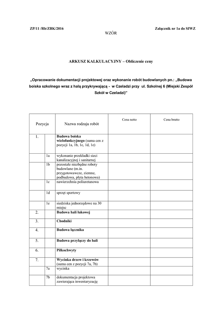Załącznik nr 1a do SIWZ ZP/11 /Rb/ZBK/2016 WZÓR ARKUSZ KALKULACYJNY – Obliczenie ceny „Opracowanie dokumentacji projektowej oraz wykonanie robót budowlanych pn.: „Budowa boiska szkolnego wraz z halą przykrywającą - w Czeladzi przy ul. Szkolnej 6 (Miejski Zespół Szkół w Czeladzi)” Cena netto Pozycja Nazwa rodzaju robót Budowa boiska wielofunkcyjnego (suma cen z pozycji 1a, 1b, 1c, 1d, 1e) 1. 1c wykonanie przekładki sieci kanalizacyjnej i sanitarnej pozostałe niezbędne roboty budowlane (m.in. przygotowawcze, ziemne, podbudowa, płyta betonowa) nawierzchnia poliuretanowa 1d sprzęt sportowy 1e 2. siedziska jednorzędowe na 30 miejsc Budowa hali łukowej 3. Chodniki 4. Budowa łącznika 5. Budowa przyłączy do hali 6. Piłkochwyty 7. Wycinka drzew i krzewów (suma cen z pozycji 7a, 7b) wycinka 1a 1b 7a 7b dokumentacja projektowa zawierająca inwentaryzację Cena brutto zieleni z wyceną brakarską 8. 8a 8b Dokumentacja projektowa (suma cen z pozycji 8a, 8b) Projekt budowlany Pozostałe elementy dokumentacji projektowej (suma cen netto z pozycji 1, 2, 3, 4, 5, 6, 7, 8) Ogółem Cena netto (do przeniesienia do formularza ofertowego)* (suma cen brutto z pozycji 1, 2, 3, 4, 5, 6, 7, 8) Ogółem Cena brutto (do przeniesienia do formularza ofertowego)* ……………………………........................................ podpisy osoby/osób uprawnionych do reprezentowania wykonawcy