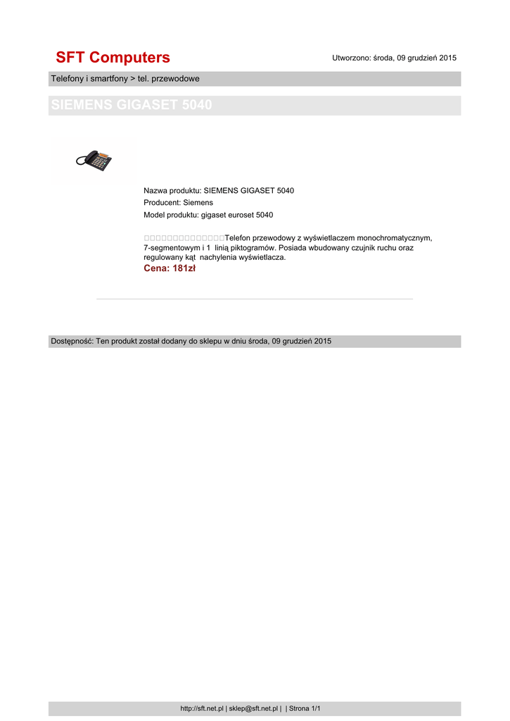 SFT Computers Utworzono: środa, 09 grudzień 2015 Telefony i smartfony > tel. przewodowe SIEMENS GIGASET 5040 Nazwa produktu: SIEMENS GIGASET 5040 Producent: Siemens Model produktu: gigaset euroset 5040 Telefon przewodowy z wyświetlaczem monochromatycznym, 7-segmentowym i 1 linią piktogramów. Posiada wbudowany czujnik ruchu oraz regulowany kąt nachylenia wyświetlacza. Cena: 181zł Dostępność: Ten produkt został dodany do sklepu w dniu środa, 09 grudzień 2015 http://sft.net.pl | [email protected] | | Strona 1/1