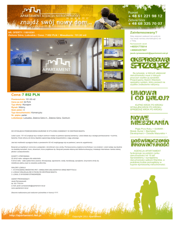 NR. OFERTY: 118010301 Zielona Góra, Lubuskie / Cena: 7 852 PLN / Mieszkanie: 151.00 m2 Zainteresowany? Żeby obejrzeć zadzwoń lub wyślij do nas swoje namiary skontaktujemy sie z Tobą. Rymaszewski Jacek +48501778914 +48683257007 [email protected] Są sytuacje, w których właściciel nieruchomości musi z różnych przyczyn szybko ją sprzedać. Proponujemy Swoim Klientom specjalny system, który pozwoli na szybkie znalezienie nabywcy. Cena: 7 852 PLN Powierzchnia: 151.00 m2 Cena za m2: 52 PLN Typ oferty: Wynajem Rynek: Wtórny Ilość pieter: 3 Typ nieruchomości: Komercyjny Nr. piętra: parter Lokalizacja: Lubuskie, Zielona Góra m., Zielona Góra, Centrum DO WYNAJĘCIA POMIESZCZENIA BIUROWE W STYLOWEJ KAMIENICY W CENTRUM MIASTA. KUPNO KROK PO KROKU WYNAJEM KROK PO KROKU SPRZEDAŻ KROK PO KROKU Piąta Pora Roku > GUMAR Marek Guner > Bachalski Development > Osiedle Mazurskie > Lokal o pow. 151 m2 znajduje się w ścisłym centrum miasta na parterze stylowej kamienicy. Lokal składa się z dużego pomieszczenia + kuchnia, łazienka. Duże witryny od strony deptaka zapewniają dostęp bezpośrednio z ciągu pieszego. Jest też możliwość wynajęcia lokalu o powierzchni 42 m2 znajdującego się na parterze ( cena do uzgodnienia). Budynek po kapitalnym remoncie z podjazdem, domofonem oraz windą. Pomieszczenia urządzone komfortowo i ze smakiem. Lokal nadaje się idealnie na siedzibę kancelarii, biuro, showroom, biuro projektowe itp. Budynek posiada własną sieć telekomunikacyjną i instalacje internetowe- bardzo dobrej jakości i przepustowości. KOSZTY UTRZYMANIA: 52 zł/m2 netto- odstępne dla właściciela 9 zł/m2 netto - stała opłata która zawiera: klimatyzację, ogrzewanie, wodę, kanalizację, sprzątanie, utrzymanie windy itp. dodatkowo płatny prąd na zasadzie podlicznika. WALORY LOKALU: 1. W OTOCZENIU MNÓSTWO PKT. HANDLOWO-USŁUGOWYCH ORAZ INSTYTUCJI. 2. LOKALE ZNAJDUJĄ SIĘ W ŚCISŁYM CENTRUM MIASTA. 3. LOKAL O WYSOKIM STANDARDZIE. AGENT PROWADZĄCY: Jacek Rymaszewski tel. 501 778 914 e-mail: [email protected] www.apartament.net.pl Zlecenie realizowane pod nadzorem pośrednika nr licencji 1717. http://apartament.net.pl AGENCJA APARTAMENT funkcjonuje na polskim rynku nieruchomości od 15 lat! Sprzedaliśmy i wynajęliśmy nieruchomości setkom Klientów, a podobnej liczbie pomogliśmy w kupnie wymarzonej nieruchomości.