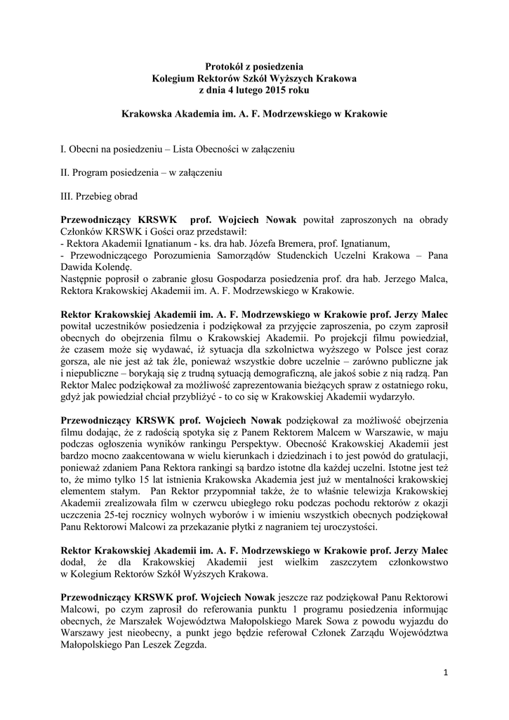 Protokół z posiedzenia Kolegium Rektorów Szkół Wyższych Krakowa z dnia 4 lutego 2015 roku Krakowska Akademia im. A. F. Modrzewskiego w Krakowie I. Obecni na posiedzeniu – Lista Obecności w załączeniu II. Program posiedzenia – w załączeniu III. Przebieg obrad Przewodniczący KRSWK prof. Wojciech Nowak powitał zaproszonych na obrady Członków KRSWK i Gości oraz przedstawił: - Rektora Akademii Ignatianum - ks. dra hab. Józefa Bremera, prof. Ignatianum, - Przewodniczącego Porozumienia Samorządów Studenckich Uczelni Krakowa – Pana Dawida Kolendę. Następnie poprosił o zabranie głosu Gospodarza posiedzenia prof. dra hab. Jerzego Malca, Rektora Krakowskiej Akademii im. A. F. Modrzewskiego w Krakowie. Rektor Krakowskiej Akademii im. A. F. Modrzewskiego w Krakowie prof. Jerzy Malec powitał uczestników posiedzenia i podziękował za przyjęcie zaproszenia, po czym zaprosił obecnych do obejrzenia filmu o Krakowskiej Akademii. Po projekcji filmu powiedział, że czasem może się wydawać, iż sytuacja dla szkolnictwa wyższego w Polsce jest coraz gorsza, ale nie jest aż tak źle, ponieważ wszystkie dobre uczelnie – zarówno publiczne jak i niepubliczne – borykają się z trudną sytuacją demograficzną, ale jakoś sobie z nią radzą. Pan Rektor Malec podziękował za możliwość zaprezentowania bieżących spraw z ostatniego roku, gdyż jak powiedział chciał przybliżyć - to co się w Krakowskiej Akademii wydarzyło. Przewodniczący KRSWK prof. Wojciech Nowak podziękował za możliwość obejrzenia filmu dodając, że z radością spotyka się z Panem Rektorem Malcem w Warszawie, w maju podczas ogłoszenia wyników rankingu Perspektyw. Obecność Krakowskiej Akademii jest bardzo mocno zaakcentowana w wielu kierunkach i dziedzinach i to jest powód do gratulacji, ponieważ zdaniem Pana Rektora rankingi są bardzo istotne dla każdej uczelni. Istotne jest też to, że mimo tylko 15 lat istnienia Krakowska Akademia jest już w mentalności krakowskiej elementem stałym. Pan Rektor przypomniał także, że to właśnie telewizja Krakowskiej Akademii zrealizowała film w czerwcu ubiegłego roku podczas pochodu rektorów z okazji uczczenia 25-tej rocznicy wolnych wyborów i w imieniu wszystkich obecnych podziękował Panu Rektorowi Malcowi za przekazanie płytki z nagraniem tej uroczystości. Rektor Krakowskiej Akademii im. A. F. Modrzewskiego w Krakowie prof. Jerzy Malec dodał, że dla Krakowskiej Akademii jest wielkim zaszczytem członkowstwo w Kolegium Rektorów Szkół Wyższych Krakowa. Przewodniczący KRSWK prof. Wojciech Nowak jeszcze raz podziękował Panu Rektorowi Malcowi, po czym zaprosił do referowania punktu 1 programu posiedzenia informując obecnych, że Marszałek Województwa Małopolskiego Marek Sowa z powodu wyjazdu do Warszawy jest nieobecny, a punkt jego będzie referował Członek Zarządu Województwa Małopolskiego Pan Leszek Zegzda. 1 pkt 1. Propozycja lokalizacji w Krakowie Małopolskiego Centrum Nauki. Członek Zarządu Województwa Małopolskiego Pan Leszek Zegzda powitał wszystkich zebranych i podziękował za możliwość wystąpienia podczas obrad KRSWK. Poinformował, że Małopolskie Centrum Nauki to inwestycja, która ma być zrealizowana w Krakowie, a jej budowę zaplanowano na lata 2014-2020. MCN w założeniach będzie ofertą skierowaną do młodych ludzi, aby zainteresować ich nauką i nowymi technologiami, ale także jako forma spędzania wolnego czasu dla rodzin z dziećmi. Inwestycja ta miałaby mieć podobny charakter jak Centrum Nauki Kopernik w Warszawie, który jak wiadomo cieszy się wielką popularnością. W pierwszym etapie było uwzględnianych siedem lokalizacji, ostatecznie wskazane pozostają – do dalszych konsultacji, do których Pan Marszałek serdecznie zaprasza grono Rektorów – dwie lokalizacje tj. pierwsza znajduje się przy ul. Skrzatów (dawne tereny wojskowe) w dzielnicy Grzegórzki przy wałach Wisły, natomiast druga przy ul. Babińskiego w dzielnicy Dębniki w pobliżu szpitala. Zarówno pierwsza jak i druga lokalizacja posiada swoje zalety i wady. A mianowicie jeśli chodzi o lokalizację na Grzegórzkach to jest to spory 8,2 ha teren przylegający do wałów Wiślanych, posiadający wysokie walory urbanistyczne i dość dobrą komunikacją miejską. Na tym terenie ma być także wybudowane Centrum Muzyki. Kłopotem natomiast może tutaj być znajdujący się na tym terenie zabytkowy fort. Teren do zagospodarowania na Dębnikach jest czterokrotnie mniejszy 2,3 ha, i znajduje się na nim dawny folwark - a to z kolei powoduje, że taki układ architektoniczny został wpisany do rejestru zabytków i taki musi pozostać. Ogromnym atutem jest to, że teren ten jest własnością miasta, komunikacja natomiast jest bardzo ograniczona, obecnie możliwy jest właściwie tylko dojazd samochodem. Zaletą jest tutaj bliskość autostrady, gdyż ten projekt ma być skierowany nie tylko do mieszkańców Krakowa, ale całej małopolski. Pan Marszałek Zegzda poprosił Państwa Rektorów o deklarację wyboru jednej z przedstawionych lokalizacji. Przewodniczący KRSWK prof. Wojciech Nowak powiedział, że jest w pewnym kłopocie, gdyż pamięta spotkanie z Panem Marszałkiem Makiem Sową gdzie został wstępnie poruszony ten temat, ale to było jedyne spotkanie w którym uczestniczył. Zdaniem Pana Rektora Nowaka bardzo trudno jest się ustosunkować do tematu, nie wiedząc do końca co ma być na danym terenie wybudowane tzn. jaki budynek, o jakiej kubaturze i jakie będzie musiał spełniać funkcje. Dodał, że jeśli ma on spełniać podobne funkcje jak Centrum Nauki Kopernik w Warszawie to żadna z propozycji nie jest dość dobra. Pan Rektor zapytał kto dokonał wyboru tych lokalizacji. Członek Zarządu Województwa Małopolskiego Pan Leszek Zegzda odpowiedział, że z całą pewnością nie będzie to taki sam rozmach jak Centrum Nauki Kopernik w Warszawie. Założenie jest takie, że będzie to