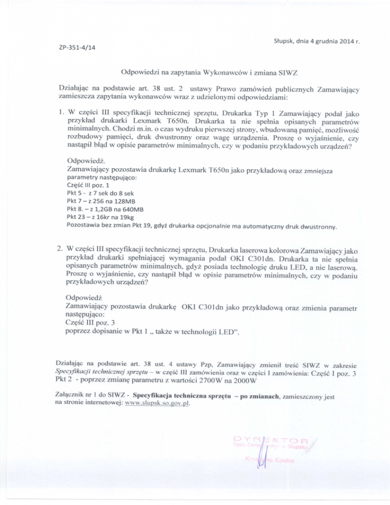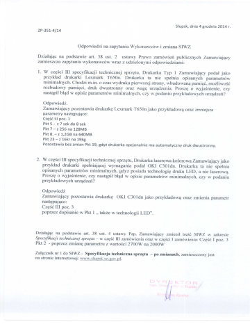 Słupsk, dnia 4 grudnia 2014 r. ZP-351-4/14 Odpowiedzi na zapytania Wykonawców i zmiana SIWZ Działając na podstawie art. 38 ust. 2 ustawy Prawo zamówień publicznych Zamawiający zamieszcza zapytania wykonawców wraz z udzielonymi odpowiedziami: 1. W części III specyfikacji technicznej sprzętu, Drukarka Typ 1 Zamawiający podał jako przykład drukarki Lexmark T650n. Drukarka ta nie spełnia opisanych parametrów minimalnych. Chodzi m.in. o czas wydruku pierwszej strony, wbudowaną pamięć, możliwość rozbudowy pamięci, druk dwustronny oraz wagę urządzenia. Proszę o wyjaśnienie, czy nastąpił błąd w opisie parametrów minimalnych, czy w podaniu przykładowych urządzeń? Odpowiedź. Zamawiający pozostawia drukarkę Lexmark T650n jako przykładową oraz zmniejsza parametry następująco: Część III poz. 1 Pkt 5 - z 7 sek do 8 sek Pkt7-z256nal28MB Pkt8.-zl,2GBna640MB Pkt 23 - z 16kr na 19kg Pozostawia bez zmian Pkt 19, gdyż drukarka opcjonalnie ma automatyczny druk dwustronny. W części III specyfikacji technicznej sprzętu, Drukarka laserowa kolorowa Zamawiający jako przykład drukarki spełniającej wymagania podał OKI C301dn. Drukarka ta nie spełnia opisanych parametrów minimalnych, gdyż posiada technologię druku LED, a nie laserową. Proszę o wyjaśnienie, czy nastąpił błąd w opisie parametrów minimalnych, czy w podaniu przykładowych urządzeń? Odpowiedź Zamawiający pozostawia drukarkę OKI C301dn jako przykładową oraz zmienia parametr następująco: Część III poz. 3 poprzez dopisanie w Pkt 1 „ także w technologii LED". Działając na podstawie art. 38 ust. 4 ustawy Pzp, Zamawiający zmienił treść SIWZ w zakresie Specyfikacji technicznej sprzętu - w część III zamówienia oraz w części I zamówienia: Część I poz. 3 Pkt 2 - poprzez zmianę parametru z wartości 2700W na 2000W Załącznik nr 1 do SIWZ - Specyfikacja techniczna sprzętu - po zmianach, zamieszczony jest na stronie internetowej: www.slupsk.so.gov.pl.