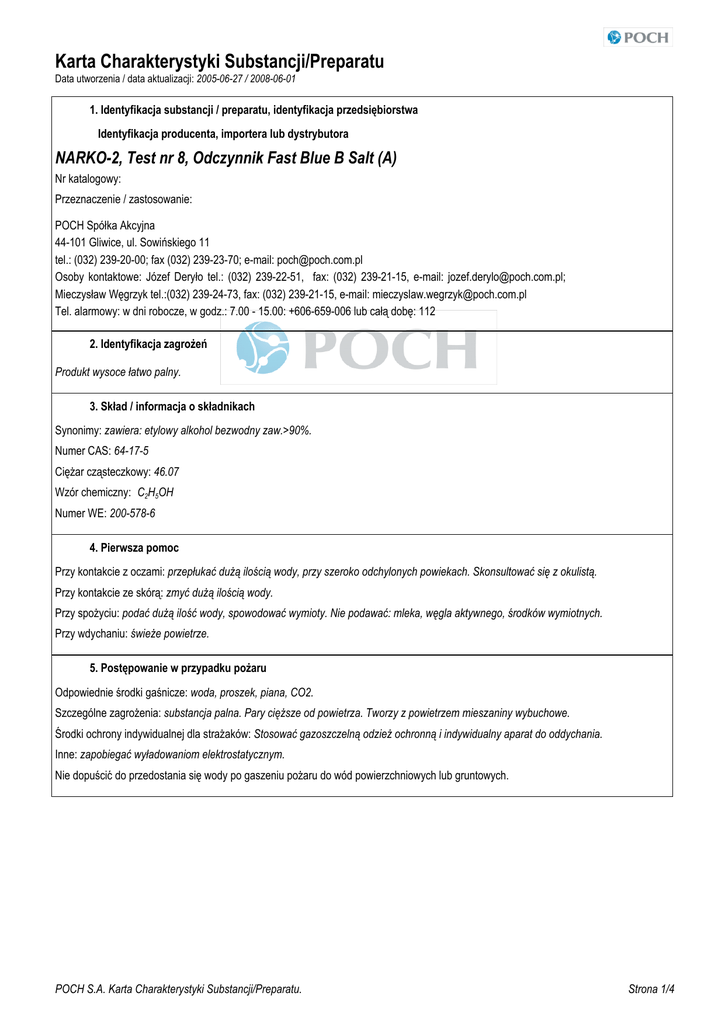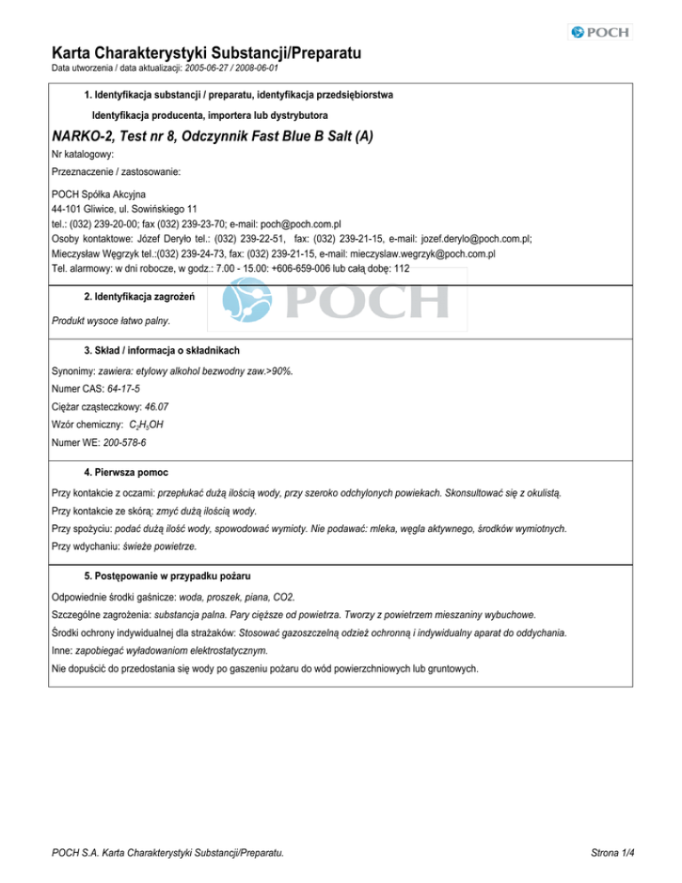 Karta Charakterystyki Substancji/Preparatu Data utworzenia / data aktualizacji: 2005-06-27 / 2008-06-01 1. Identyfikacja substancji / preparatu, identyfikacja przedsiębiorstwa Identyfikacja producenta, importera lub dystrybutora NARKO-2, Test nr 8, Odczynnik Fast Blue B Salt (A) Nr katalogowy: Przeznaczenie / zastosowanie: POCH Spółka Akcyjna 44-101 Gliwice, ul. Sowińskiego 11 tel.: (032) 239-20-00; fax (032) 239-23-70; e-mail: [email protected] Osoby kontaktowe: Józef Deryło tel.: (032) 239-22-51, fax: (032) 239-21-15, e-mail: [email protected]; Mieczysław Węgrzyk tel.:(032) 239-24-73, fax: (032) 239-21-15, e-mail: [email protected] Tel. alarmowy: w dni robocze, w godz.: 7.00 - 15.00: +606-659-006 lub całą dobę: 112 2. Identyfikacja zagrożeń Produkt wysoce łatwo palny. 3. Skład / informacja o składnikach Synonimy: zawiera: etylowy alkohol bezwodny zaw.>90%. Numer CAS: 64-17-5 Ciężar cząsteczkowy: 46.07 Wzór chemiczny: C2H5OH Numer WE: 200-578-6 4. Pierwsza pomoc Przy kontakcie z oczami: przepłukać dużą ilością wody, przy szeroko odchylonych powiekach. Skonsultować się z okulistą. Przy kontakcie ze skórą: zmyć dużą ilością wody. Przy spożyciu: podać dużą ilość wody, spowodować wymioty. Nie podawać: mleka, węgla aktywnego, środków wymiotnych. Przy wdychaniu: świeże powietrze. 5. Postępowanie w przypadku pożaru Odpowiednie środki gaśnicze: woda, proszek, piana, CO2. Szczególne zagrożenia: substancja palna. Pary cięższe od powietrza. Tworzy z powietrzem mieszaniny wybuchowe. Środki ochrony indywidualnej dla strażaków: Stosować gazoszczelną odzież ochronną i indywidualny aparat do oddychania. Inne: zapobiegać wyładowaniom elektrostatycznym. Nie dopuścić do przedostania się wody po gaszeniu pożaru do wód powierzchniowych lub gruntowych. POCH S.A. Karta Charakterystyki Substancji/Preparatu. Strona 1/4 NARKO-2, Test nr 8, Odczynnik Fast Blue B Salt (A) 6. Postępowanie w przypadku niezamierzonego uwolnienia do środowiska Zebrać przy pomocy substancji absorbującej ciecze, przekazać do likwidacji. Oczyścić zanieczyszczony teren. Nie dopuścić do dostania się do wód, ścieków i gleby. 7. Postępowanie z substancją / preparatem i jej / jego magazynowanie Obchodzenie się z substancją: Zapewnić skuteczną wymianę powietrza (wentylacja). Postępować zgodnie z zasadami dobrej praktyki przemysłowej oraz ogólnymi zasadami bezpieczeństwa i higieny pracy z substancjami chemicznymi. Stosować środki ochrony osobistej zgodnie z pkt.8. Nie opróżniać do kanalizacji. Zapobiegać wyładowaniom elektrostatycznym. Zakaz palenia oraz manipulowania otwartym ogniem. Przestrzegać ogólnych przepisów przeciwpożarowych. Magazynowanie: szczelne opakowania, suche pomieszczenie. W temperaturze pokojowej (zalecana od +15°C do +25°C). Rozporządzenie Ministra Zdrowia z dnia 14 marca 2003 r. w sprawie sposobu oznakowania miejsc, rurociągów oraz pojemników i zbiorników służących do przechowywania lub zawierających substancje niebezpieczne lub preparaty niebezpieczne (Dz.U.03.61.552) 8. Kontrola narażenia i środki ochrony indywidualnej Paramerty kontroli (NDS, NDSCh, NDSP): NDS: 1900 mg/m3. Stosować odpowiednią wentylację wywiewną, miejscową i ogólną zapewniającą utrzymanie stężenia produktu w powietrzu poniżej określonych limitów. Zaleca się wyposażenie miejsca pracy w wodny natrysk do płukania oczu oraz prysznic. Środki ochrony indywidualnej powinny być tak zaprojektowane i wykonane aby wykluczały zagrożenie i inne niedogodności w przewidywanych warunkach użytkowania, chroniące przed chemikaliami. Środki ochrony indywidualnej: ochrona dróg oddechowych: niekonieczna ochrona oczu: niekonieczna ochrona rąk: konieczna - rękawice ochronne odporne na działanie chemikaliów wykonane z gumy nitrylowej lub inne dopuszczone przez producenta rękawic do kontaktu z tym produktem. Czas wytrzymałości materiału określa producent rękawic. ochrona ciała: konieczna - fartuch laboratoryjny środki ochronne i higieny: wymyć ręce i twarz po pracy z tą substancja. Rozporządzenie Ministra Zdrowia z dnia 30 grudnia 2004 r. w sprawie bezpieczeństwa i higieny pracy związanej z występowaniem w miejscu pracy czynników chemicznych (Dz.U.05.11.86). Rozporządzenie Ministra Pracy i Polityki Społecznej z dnia 30 sierpnia 2007 (Dz. U. nr 161, poz. 1142) 9. Właściwości fizyczne i chemiczne Forma: ciecz lepkość dynamiczna: Kolor: bezbarwna lepkość kinematyczna: Zapach: charakterystyczny Ciśnienie par: 59 mbar (20°C) pH: obojętne Gęstość: 0,789 - 0,791 g/cm3 (20°C) Temperatura topnienia: -117°C Ciężar nasypowy: nie dotyczy Temperatura wrzenia: 78°C Rozpuszczalność: Temperatura samozapłonu: 425°C w wodzie: rozpuszczalny Temperatura zapłonu: 12°C w rozpuszczalnikach organicznych: rozpuszczalny Granice wybuchowości: log P(w/o): dolna: 3,5% obj. górna: 15% obj. POCH S.A. Karta Charakterystyki Substancji/Preparatu. Strona 2/4 NARKO-2, Test nr 8, Odczynnik Fast Blue B Salt (A) 10. Stabilność i reaktywność Warunki których należy unikać: podwyższona temperatura. Materiały których należy unikać: silne utleniacze, metale alkaliczne i ziem alkalicznych, tlenki metali alkalicznych. Niebezpieczne produkty rozkładu: brak. Następne dane: wysoce łatwopalny. 11. Informacje toksykologiczne Informacje toksykologiczne: LD50 (doustnie szczury): 7060 mg/kg. Pozostałe dane: przy spożyciu: nudności, wymioty; przy absorpcji większej ilości: zawroty głowy, stan upojenia; przy wdychaniu: podrażnienia błon śluzowych; kontakt z oczami: powierzchowne podrażnienia 12. Informacje ekologiczne Przy odpowiednim i fachowym posługiwaniu się substancją nie wystąpią problemy ekologiczne. 13. Postępowanie z odpadami POCH S.A. przyjmuje do likwidacji substancje chemiczne zakupione w POCH S.A. oraz opakowania po tych substancjach. Dostawy substancji i opakowań należy każdorazowo uzgadniać z P