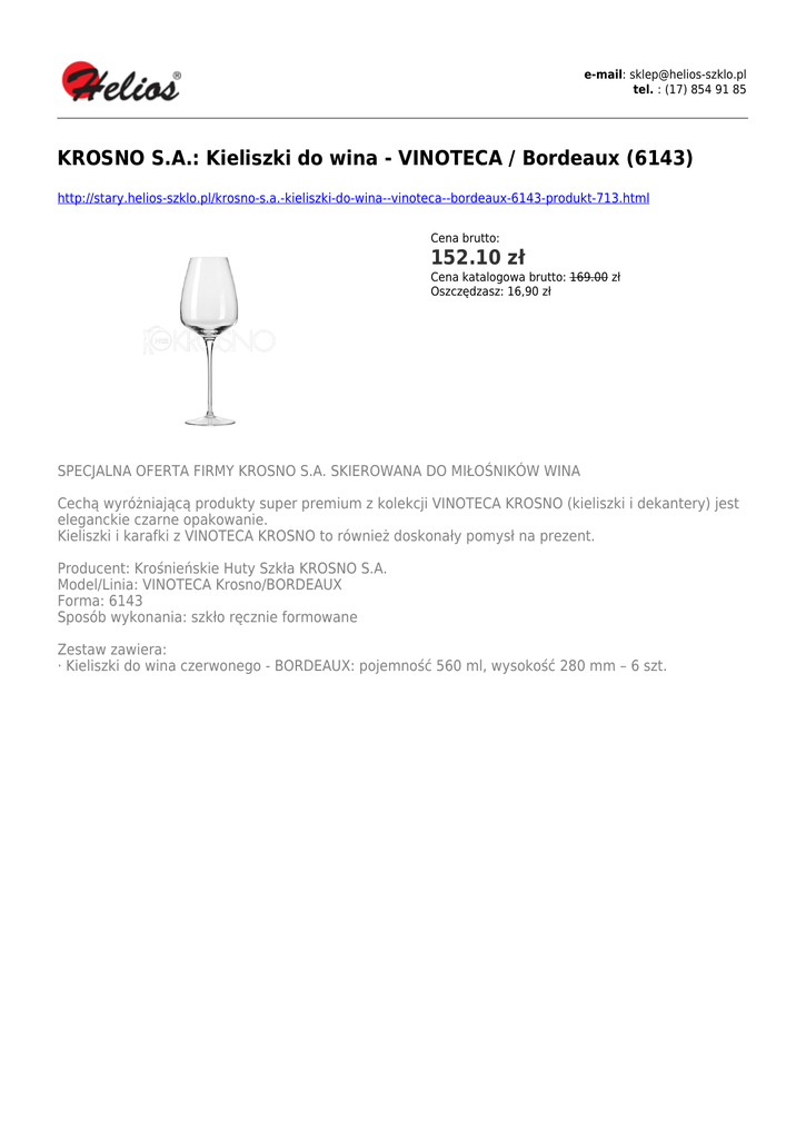 e-mail: [email protected] tel. : (17) 854 91 85 KROSNO S.A.: Kieliszki do wina - VINOTECA / Bordeaux (6143) http://stary.helios-szklo.pl/krosno-s.a.-kieliszki-do-wina--vinoteca--bordeaux-6143-produkt-713.html Cena brutto: 152.10 zł Cena katalogowa brutto: 169.00 zł Oszczędzasz: 16,90 zł SPECJALNA OFERTA FIRMY KROSNO S.A. SKIEROWANA DO MIŁOŚNIKÓW WINA Cechą wyróżniającą produkty super premium z kolekcji VINOTECA KROSNO (kieliszki i dekantery) jest eleganckie czarne opakowanie. Kieliszki i karafki z VINOTECA KROSNO to również doskonały pomysł na prezent. Producent: Krośnieńskie Huty Szkła KROSNO S.A. Model/Linia: VINOTECA Krosno/BORDEAUX Forma: 6143 Sposób wykonania: szkło ręcznie formowane Zestaw zawiera: · Kieliszki do wina czerwonego - BORDEAUX: pojemność 560 ml, wysokość 280 mm – 6 szt.