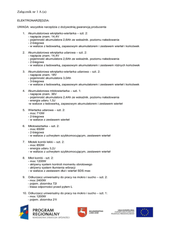 Załącznik nr 1 A (a) ELEKTRONARZĘDZIA: UWAGA: wszystkie narzędzia z dożywotnią gwarancją producenta 1. Akumulatorowa wkrętarko-wiertarka – szt. 2: - napięcie znam. 14,4V - pojemność akumulatora 2,6Ah ze wskaźnik. poziomu naładowania - 2-biegowa - w walizce z ładowarką, zapasowym akumulatorem i zestawem wierteł i końcówek 2. Akumulatorowa wkrętarka udarowa – szt. 2: - napięcie znam. 14,4V - pojemność akumulatora 2,6Ah ze wskaźnik. poziomu naładowania - 2-biegowa - w walizce z ładowarką, zapasowym akumulatorem i zestawem różnych końcówek 3. Akumulatorowa wkrętarko-wiertarka udarowa – szt. 2: - napięcie znam. 18V - pojemność akumulatora 3,0Ah - 3-biegowa - w walizce z ładowarką, zapasowym akumulatorem i zestawem wierteł i końcówek 4. Akumulatorowa młotowiertarka – szt. 1: - napięcie znam. 36V - pojemność akumulatora 2,4Ah ze wskaźnik. poziomu naładowania - energia udaru 1,5J -w walizce z ładowarką, zapasowym akumulatorem i zestawem wierteł 5. Wiertarka udarowa – szt. 2: - moc 710W - 2-biegowa - w walizce z zestawem wierteł 6. Młotowiertarka – szt. 2: - moc 650W - 2-biegowa - w walizce z uchwytem szybkomocującym, zestawem wierteł 7. Młotek kombi lekki – szt. 2: - moc 850W - energia udaru 3,2J - w walizce z uchwytem szybkomocującym, zestawem wierteł 8. Młot kombi - szt. 2: - moc 1200W - aktywny system kontroli momentu obrotowego - aktywny system tłumienia wibracji - w walizce z zestawem dłut i wierteł SDS max 9. Odkurzacz uniwersalny do pracy na mokro i sucho – szt. 2: - moc 2400W - pojem. zbiornika 72l - klasa odporności przed pyłem L 10. Odkurzacz uniwersalny do pracy na mokro i sucho – szt. 1: - moc 1200W - pojem. zbiornika 21l Załącznik nr 1 A (a) - klasa odporności przed pyłem L 11. Szlifierka kątowa do metalu i betonu – szt. 2: - moc 1400W - liczba obrotów 11tys.obr/min - średnica tarczy 125mm - w walizce z okularami ochronnymi i tarczami do cięcia i szlifowania 12. Szlifierka kątowa do metalu – szt. 2: - moc 2100W - liczba obrotów 6500obr/min - średnica tarczy 230mm - w walizce okularami ochronnymi i tarczami do metalu 13. Dalmierz laserowy kieszonkowy – szt. 2: - zakres pomiarowy: 0,05-200m - dokładność -+1mm - IP54 14. Piła szablasta – 1 szt: - napięcie 230V - moc 1400W - skok 32 mm - aktywny system tłumienia wibracji - w walizce z dodatkową rękojeścią boczną i zestawem brzeszczotów 15. Pompa zatapialna do wody brudnej 1-fazowa – szt. 2: - U=230 v - Wydajność 450 l/min - h- podnoszenia do 40m - złącze szybko-mocujące pompy - wąż o długości 10m ze złączem szybkomocującym 16. Szlifierka wielofunkcyjna akumulatorowa – szt. 2: - U=10,8V - V= do 30000 obr./min - Z regulacją obrotów, walizką i kpl. akcesoriów 17. Spawarka inwerterowa , prąd spawania 0-200A ,z przewodami spawalniczymi i kpl. spawalniczym – kpl. 2 18. Wiertarka stołowa kolumnowa – szt.:3 - Uchwyt do wiertła fi=16mm - Stożkowe mocowanie do wiertła fi=36 mm - Zasilanie 3x400V 19. Szlifierka stołowa dwutarczowa, średnica tarczy fi=250mm – szt. 2