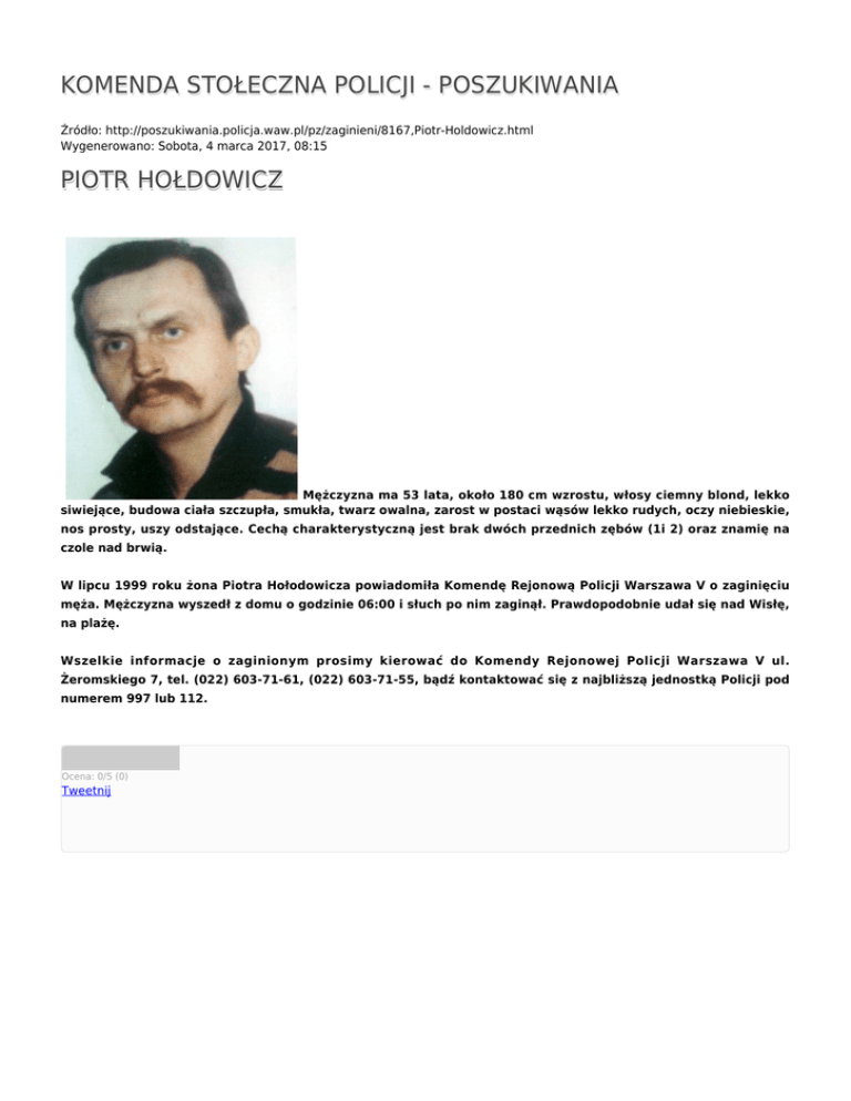 KOMENDA STOŁECZNA POLICJI - POSZUKIWANIA Źródło: http://poszukiwania.policja.waw.pl/pz/zaginieni/8167,Piotr-Holdowicz.html Wygenerowano: Sobota, 4 marca 2017, 08:15 PIOTR HOŁDOWICZ Mężczyzna ma 53 lata, około 180 cm wzrostu, włosy ciemny blond, lekko siwiejące, budowa ciała szczupła, smukła, twarz owalna, zarost w postaci wąsów lekko rudych, oczy niebieskie, nos prosty, uszy odstające. Cechą charakterystyczną jest brak dwóch przednich zębów (1i 2) oraz znamię na czole nad brwią. W lipcu 1999 roku żona Piotra Hołodowicza powiadomiła Komendę Rejonową Policji Warszawa V o zaginięciu męża. Mężczyzna wyszedł z domu o godzinie 06:00 i słuch po nim zaginął. Prawdopodobnie udał się nad Wisłę, na plażę. Wszelkie informacje o zaginionym prosimy kierować do Komendy Rejonowej Policji Warszawa V ul. Żeromskiego 7, tel. (022) 603-71-61, (022) 603-71-55, bądź kontaktować się z najbliższą jednostką Policji pod numerem 997 lub 112. Ocena: 0/5 (0) Tweetnij
