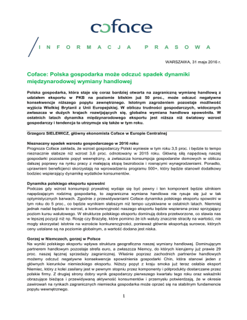 I N F O R M A C J A P R A S O W A WARSZAWA, 31 maja 2016 r. Coface: Polska gospodarka może odczuć spadek dynamiki międzynarodowej wymiany handlowej Polska gospodarka, która staje się coraz bardziej otwarta na zagraniczną wymianę handlową z udziałem eksportu w PKB na poziomie bliskim już 50 proc., może odczuć negatywne konsekwencje niższego popytu zewnętrznego. Istotnym zagrożeniem pozostaje możliwość wyjścia Wielkiej Brytanii z Unii Europejskiej. W obliczu trudności gospodarczych, widocznych zwłaszcza w dużych krajach rozwijających się, globalna wymiana handlowa spowolniła. W ostatnich latach dynamika międzynarodowego eksportu jest niższa niż światowy wzrost gospodarczy i tendencja ta utrzymuje się także w tym roku. Grzegorz SIELEWICZ, główny ekonomista Coface w Europie Centralnej Nieznaczny spadek wzrostu gospodarczego w 2016 roku Prognoza Coface zakłada, że wzrost gospodarczy Polski wyniesie w tym roku 3,5 proc. i będzie to tempo nieznacznie słabsze niż wzrost 3,6 proc. odnotowany w 2015 roku. Główną siłą napędową naszej gospodarki pozostanie popyt wewnętrzny, a zwłaszcza konsumpcja gospodarstw domowych w obliczu dalszej poprawy na rynku pracy z malejącą stopą bezrobocia i rosnącymi wynagrodzeniami. Ponadto, uprawnieni beneficjenci skorzystają na wprowadzeniu programu 500+, który będzie stanowił dodatkowy bodziec wspierający dynamikę wydatków konsumentów. Dynamika polskiego eksportu spowolni Podczas gdy wzrost konsumpcji prywatnej wydaje się być pewny i ten komponent będzie silnikiem napędzającym rodzimą gospodarkę, to zagraniczna wymiana handlowa nie rysuje się już w tak optymistycznych barwach. Zgodnie z przewidywaniami Coface dynamika polskiego eksportu spowolni w tym roku do 5 proc., co będzie wynikiem słabszym niż tempo uzyskiwane w ostatnich latach. Niemniej jednak nadal będzie to wzrost, a konkurencyjność naszego eksportu będzie wspierana przez sprzyjający poziom kursu walutowego. W strukturze polskiego eksportu dominują dobra przetworzone, co stawia nas w lepszej pozycji niż np. Rosję czy Brazylię, które pomimo że ich waluty znacznie straciły na wartości, nie mogły skorzystać istotnie na wzroście konkurencyjności, ponieważ głównie eksportują surowce, których ceny ustalane są na poziomie globalnym, a wartość dodana jest niska. Gorzej w Niemczech, gorzej w Polsce Na wyniki polskiego eksportu wpływa struktura geograficzna naszej wymiany handlowej. Dominującym partnerem handlowym pozostaje strefa euro, a zwłaszcza Niemcy, do których kierujemy już prawie 29 proc. naszej łącznej sprzedaży zagranicznej. Właśnie poprzez zachodnich partnerów handlowych możemy odczuć negatywne konsekwencje spowolnienia gospodarki Chin, która stanowi jeden z głównych kierunków niemieckiego eksportu. Niższy popyt z kraju smoka już teraz osłabia eksport Niemiec, który z kolei zasilany jest w pewnym stopniu przez komponenty i półprodukty dostarczane przez polskie firmy. Z drugiej strony dobry wynik gospodarczy pierwszego kwartału tego roku oraz wskaźniki obrazujące bieżąca i przewidywaną aktywność konsumentów i przemysłu potwierdzają, że w okresie zawirowań na rynkach zagranicznych niemiecka gospodarka może oprzeć się na stabilnym fundamencie popytu wewnętrznego. 1 Perspektywy W obliczu wolniejszego tempa rozwoju handlu światowego oraz nadal mizernego ożywienia gospodarczego w krajach rozwiniętych, polski eksport skazany jest na wolniejszą dynamikę wzrostu niż notowana w latach ubiegłych. Istotnym zagrożeniem pozostaje możliwość wyjścia Wielkiej Brytanii z Unii Europejskiej, zarówno bezpośrednio dla naszego eksportu (Wielka Brytania jest trzecim największym odbiorcą polskiego eksportu), jak również dla wymiany handlowej na rynkach zagranicznych. Poszukiwanie nowych rynków zbytu wspiera naszą zagraniczną wymianę handlową, jednak wciąż eksportujemy głównie na rynki Unii Europejskiej i to właśnie popyt z tego kierunku będzie miał największy wpływ na polską sprzedaż zagraniczną. W odróżnieniu od wielu innych krajów rozwijających się, zwłaszcza spoza regionu Europy Środkowo-Wschodniej, Polska może liczyć na solidny popyt krajowy utrzymujący wzrost gospodarczy na przyzwoitym poziomie. Niemniej jednak, wyjście z recesji lub spowolnienia, jakich doświadczają obecnie duże gospodarki rozwijające się (Chiny, Rosja, Brazylia) ożywiłoby globalną wymianę handlową, co pozytywnie wpłynęłoby także na polski eksport. KONTAKT DLA MEDIÓW: Anna A. GUZIK – T. +48 22 465 02 22, M. +48 509 467 531 – E. [email protected] Grupa Coface, światowy lider w ubezpieczeniach należności, oferuje firmom na całym świecie rozwiązania w zakresie ochrony przed ryzykiem niewypłacalności ich klientów, zarówno w transakcjach krajowych jak i eksportowych. W 2015 r. Grupa, wspierana przez 4.500 pracowników, osiągnęła skonsolidowane przychody w wysokości 1490 mln EUR. Coface jest obecny, bezpośrednio lub pośrednio, w 99 krajach i ubezpiecza transakcje 40.000 firm z ponad 200 krajów. Coface publikuje co kwartał swoje oceny ryzyka kraju dla 160 państw, w oparciu o unikalną wiedzę na temat zachowań płatniczych przedsiębiorstw i doświadczenie 340 lokalnych analityków ds. oceny ryzyka, współpracujących na bieżąco z klientami Coface i weryfikujących kondycję ich dłużników. We Francji Coface zarządza gwarancjami eksportowymi w imieniu skarbu państwa. W Polsce Coface jest obecny od 1992 roku. Ubezpiecza należności krajowe i eksportowe, oferuje finansowanie poprzez faktoring, a także raporty handlowe o firmach z całego świata i marketingowe bazy danych. Prowadzi monitoring i windykację należności B2B. Więcej informacji o firmie oraz pozostałe komunikaty prasowe dostępne na www.coface.pl Spółka Coface SA jest notowana w indeksie Euronext Paris – Compartment A na giełdzie papierów wartościowych w Paryżu pod 