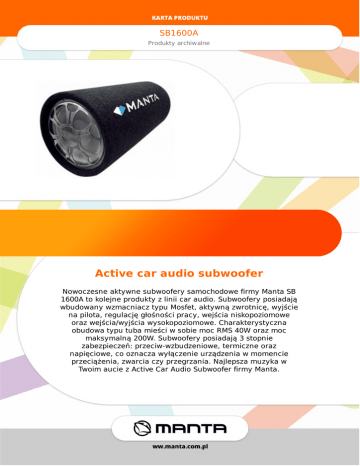 SB1600A Produktyarchiwalne Activecaraudiosubwoofer NowoczesneaktywnesubwooferysamochodowefirmyMantaSB 1600Atokolejneproduktyzliniicaraudio.Subwooferyposiadają wbudowanywzmacniacztypuMosfet,aktywnązwrotnicę,wyjście napilota,regulacjęgłośnościpracy,wejścianiskopoziomowe orazwejścia/wyjściawysokopoziomowe.Charakterystyczna obudowatyputubamieściwsobiemocRMS40Worazmoc maksymalną200W.Subwooferyposiadają3stopnie zabezpieczeń:przeciw-wzbudzeniowe,termiczneoraz napięciowe,cooznaczawyłączenieurządzeniawmomencie przeciążenia,zwarciaczyprzegrzania.Najlepszamuzykaw TwoimauciezActiveCarAudioSubwooferfirmyManta. SB1600A Produktyarchiwalne Specyfikacja http://www.manta.com.pl/pl/sb1600a EAN:5907642613191