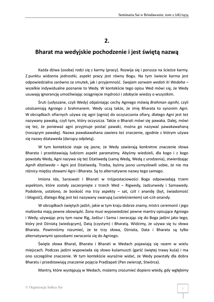 Seminaria Sai w Brindawanie, tom 2 (18)/1974 2. Bharat ma wedyjskie pochodzenie i jest świętą nazwą Każda dżiwa (osoba) rodzi się z karmy (pracy). Rozwija się i porusza na ścieżce karmy. Z punktu widzenia jednostki, aspekt pracy jest równy Bogu. Na tym świecie karma jest odpowiedzialna zarówno za smutek, jak i przyjemność. Swajam sarwam wedati iti Wedaha – wszelkie indywidualne poznanie to Wedy. W kontekście tego opisu Wed mówi się, że Wedy usuwają ignorancję umożliwiając osiągnięcie mądrości i zdobycie wiedzy o wszystkim. Śruti (usłyszane, czyli Wedy) objaśniając cechy Agniego mówią Brahman agnihi, czyli utożsamiają Agniego z brahmanem. Wedy uczą także, że imię Bharata to synonim Agni. W obrządkach ofiarnych używa się agni (ognia) do oczyszczania ofiary, dlatego Agni jest też nazywany pawaką, czyli tym, który oczyszcza. Także o Bharati mówi się pawaka. Dalej, mówi się też, że ponieważ agni przyjmuje postać pawaki, można go nazywać pawakawahaną (noszącym pawakę). Nazwa pawakawahana zawiera też znaczenie, zgodnie z którym używa się nazwy dżataweda (darzący odpłatą). W tym kontekście staje się jasne, że Wedy zawierają konkretne znaczenie słowa Bharata i przedstawiają ludziom aspekt paramatmy. Abyśmy wiedzieli, dla kogo i z kogo powstały Wedy, Agni nazywa się też Dżatiwedą (samą Wedą, Wedą z urodzenia), stwierdzając Agnih dżatiweda – Agni jest Dżatiwedą. Trzeba, byśmy jasno uzmysłowili sobie, że nie ma różnicy między słowami Agni i Bharata. Są to alternatywne nazwy tego samego. Imiona Ida, Saraswati i Bharati w trójpostaciowości Boga odpowiadają trzem aspektom, które zostały zaczerpnięte z trzech Wed – Rigwedy, Jadżurwedy i Samawedy. Podobnie, ustalono, że boskość ma trzy aspekty – sat, czit i anandę (byt, świadomość i błogość), dlatego Bóg jest też nazywany swarupą (ucieleśnieniem) sat-czit-anandy. W obrządkach świętych jadżń, jakie w tym kraju dobrze znamy, mistrz ceremonii i jego małżonka mają pewne obowiązki. Żona musi wypowiedzieć pewne mantry opisujące Agniego i Wedy, używając przy tym nazw Rig, Jadżur i Sama i zwracając się do Boga jadżni jako tego, który jest Dżniatą (wiedzącym), Datą (czystym) i Bharatą. Widzimy, że używa się tu słowa Bharata. Powinniśmy rozumieć, że te trzy słowa, Dżniata, Data i Bharata są tylko alternatywnymi sposobami zwracania się do Agniego. Święte słowa Bharat, Bharata i Bharati w Wedach pojawiają się razem w wielu miejscach. Podczas jadżni wypowiada się słowo kuśamuszti (garść świętej trawy kuśa) i ma ono szczególne znaczenie. W tym kontekście wyraźnie widać, że Wedy powstały dla dobra Bharatu i przedstawiają znaczenie pojęcia Pradżapati (Pan zwierząt, Stwórca). Mantry, które występują w Wedach, możemy zrozumieć dopiero wtedy, gdy wgłębimy © Organizacja Sathya Sai 1 Seminaria Sai w Brindawanie, tom 2 (18)/1974 się w znaczenie Wed. Dopóki nie zrozumiemy, że między słowami i mantrami w Wedach a samym Bogiem istnieje ścisły i nierozerwalny związek, Wedy będą się nam jawić tak, jak inne trywialne teksty jakiegoś nieznanego autora, jak zlepek rozmaitych słów i liter. Tymczasem są one o wiele bardziej treściwe niż zwykły zbiór słów i liter. Naturalnym pragnieniem mieszkańców Bharatu jest wcielanie przesłania wedyjskiej kultury w życie codzienne. Podczas uroczystości nadawania imienia swemu dziecku religijne osoby wyszeptują trzykrotnie do jego prawego ucha słowo wać (dźwięk, uosobienie mowy; też: matka Wed). W ten sposób mówią dziecku, że nie różni się ono od Wed i że jest spadkobiercą wedyjskiej tradycji i kultury. Powszechną praktyką jest też nadawanie, oprócz zwykłego imienia, dodatkowo jakiegoś boskiego imienia, np. Dewadatta, czemu towarzyszy powtarzanie słowa wedosi (weda+asi, jesteś Wedą). Wypowiadanie „wedosi” ma znaczyć „urodziłeś się na tym świecie w celu podtrzymania Wed”, „Bóg dał ci ludzką postać, abyś mógł spełniać to, co zawierają Wedy”. Właśnie dlatego dziecko oddaje się do adopcji samemu dewie (dewa+datta, Bogu dany). W naszej tradycji powszechne jest adoptowanie dziecka, gdy ktoś nie ma własnych dzieci; nazywa się to adopcją (dattaka). Oddanie dziecka Bogu oznacza, że jest ono upoważnione, by otrzymać od Niego boskie moce, a więc dziedziczyć Jego zdolności. Innym tego znaczeniem jest to, że narodziny, rozwój, starzenie się i śmierć ludzkiego ciała pochodzą od Pradżapatego. Daje On te rzeczy ludzkiemu ciału jako dar. Aspekt Bharaty implikuje także obecność utajonego aspektu Agniego. Jak już powiedziano, Agni jest innym imieniem Bharaty. Ze słońca pochodzi agni, z agni pochodzi waju, z waju pochodzi raśmi, a z raśmi pochodzi Bharata. Przez to następstwo powinniśmy rozumieć, że życie w ciele składa się z tych pięciu aspektów. Za nasz oddech odpowiada waju w postaci prany. Za intelekt i zdolność myślenia odpowiada słońce. Oznacza to, że wszystkie materialne części składowe naszego ciała mają boską podstawę i mogą kwitnąć tylko w aspekcie Boga. Taką interpretację, i w takiej kolejności słów, dają Wedy. Agni posiadający imię Bharata ma oprócz spalania zdolność oczyszczania wszystkiego, z czym się zetknie. Jest to kolejny aspekt, o którym mówią Wedy. Z tego powodu uważa się, że Bharata jako agni oznacza też formę prawdy. Na tej podstawie dharma przyjmuje postać, którą wszyscy znają jako równoznaczną prawdzie. Właśnie dlatego mówi się Satjannasti paro dharmaha – nie ma dharmy wyższej niż prawda. Pradżapati, ucieleśnienie prawdy, przyjmuje postać dharmy i daje światu asztanga jogę (ośmioraką jogę), wzywając do jej praktykowania, a tym samym do zrozumienia, jakie znaczenie ma Pradżapati. W tym miejscu powinniśmy podzielić słowo satja (prawda) na sa, ta i ja. Ja oznacza dyscyplinę (jogę), c