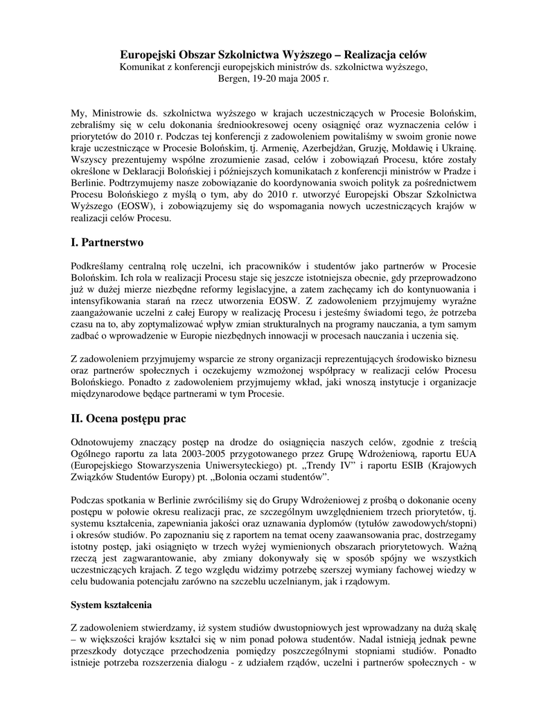 Europejski Obszar Szkolnictwa Wyższego – Realizacja celów Komunikat z konferencji europejskich ministrów ds. szkolnictwa wyższego, Bergen, 19-20 maja 2005 r. My, Ministrowie ds. szkolnictwa wyższego w krajach uczestniczących w Procesie Bolońskim, zebraliśmy się w celu dokonania średniookresowej oceny osiągnięć oraz wyznaczenia celów i priorytetów do 2010 r. Podczas tej konferencji z zadowoleniem powitaliśmy w swoim gronie nowe kraje uczestniczące w Procesie Bolońskim, tj. Armenię, Azerbejdżan, Gruzję, Mołdawię i Ukrainę. Wszyscy prezentujemy wspólne zrozumienie zasad, celów i zobowiązań Procesu, które zostały określone w Deklaracji Bolońskiej i późniejszych komunikatach z konferencji ministrów w Pradze i Berlinie. Podtrzymujemy nasze zobowiązanie do koordynowania swoich polityk za pośrednictwem Procesu Bolońskiego z myślą o tym, aby do 2010 r. utworzyć Europejski Obszar Szkolnictwa Wyższego (EOSW), i zobowiązujemy się do wspomagania nowych uczestniczących krajów w realizacji celów Procesu. I. Partnerstwo Podkreślamy centralną rolę uczelni, ich pracowników i studentów jako partnerów w Procesie Bolońskim. Ich rola w realizacji Procesu staje się jeszcze istotniejsza obecnie, gdy przeprowadzono już w dużej mierze niezbędne reformy legislacyjne, a zatem zachęcamy ich do kontynuowania i intensyfikowania starań na rzecz utworzenia EOSW. Z zadowoleniem przyjmujemy wyraźne zaangażowanie uczelni z całej Europy w realizację Procesu i jesteśmy świadomi tego, że potrzeba czasu na to, aby zoptymalizować wpływ zmian strukturalnych na programy nauczania, a tym samym zadbać o wprowadzenie w Europie niezbędnych innowacji w procesach nauczania i uczenia się. Z zadowoleniem przyjmujemy wsparcie ze strony organizacji reprezentujących środowisko biznesu oraz partnerów społecznych i oczekujemy wzmożonej współpracy w realizacji celów Procesu Bolońskiego. Ponadto z zadowoleniem przyjmujemy wkład, jaki wnoszą instytucje i organizacje międzynarodowe będące partnerami w tym Procesie. II. Ocena postępu prac Odnotowujemy znaczący postęp na drodze do osiągnięcia naszych celów, zgodnie z treścią Ogólnego raportu za lata 2003-2005 przygotowanego przez Grupę Wdrożeniową, raportu EUA (Europejskiego Stowarzyszenia Uniwersyteckiego) pt. „Trendy IV” i raportu ESIB (Krajowych Związków Studentów Europy) pt. „Bolonia oczami studentów”. Podczas spotkania w Berlinie zwróciliśmy się do Grupy Wdrożeniowej z prośbą o dokonanie oceny postępu w połowie okresu realizacji prac, ze szczególnym uwzględnieniem trzech priorytetów, tj. systemu kształcenia, zapewniania jakości oraz uznawania dyplomów (tytułów zawodowych/stopni) i okresów studiów. Po zapoznaniu się z raportem na temat oceny zaawansowania prac, dostrzegamy istotny postęp, jaki osiągnięto w trzech wyżej wymienionych obszarach priorytetowych. Ważną rzeczą jest zagwarantowanie, aby zmiany dokonywały się w sposób spójny we wszystkich uczestniczących krajach. Z tego względu widzimy potrzebę szerszej wymiany fachowej wiedzy w celu budowania potencjału zarówno na szczeblu uczelnianym, jak i rządowym. System kształcenia Z zadowoleniem stwierdzamy, iż system studiów dwustopniowych jest wprowadzany na dużą skalę – w większości krajów kształci się w nim ponad połowa studentów. Nadal istnieją jednak pewne przeszkody dotyczące przechodzenia pomiędzy poszczególnymi stopniami studiów. Ponadto istnieje potrzeba rozszerzenia dialogu - z udziałem rządów, uczelni i partnerów społecznych - w celu zwiększenia zatrudnialności absolwentów posiadających kwalifikacje na poziomie licencjackim/inżynierskim, m.in. na odpowiednich stanowiskach w służbach publicznych. Przyjmujemy kompleksową ramową strukturę dla EOSW, obejmującą: trzy cykle kształcenia (w tym cząstkowe kwalifikacje, które mogą być przyznawane w określonym kontekście w danym kraju), ogólne deskryptory dla każdego cyklu oparte na efektach kształcenia i kompetencjach oraz widełki określające liczbę punktów zaliczeniowych dla studiów I i II stopnia. Zobowiązujemy się opracować do 2010 r. krajowe ramowe struktury kwalifikacji zgodne z kompleksową ramową strukturą kwalifikacji dla EOSW i rozpocząć prace w tym zakresie do 2007 r. Zwracamy się z prośbą do Grupy Wdrożeniowej o przedstawienie raportu na temat wdrażania i dalszego rozwoju kompleksowej ramowej struktury kwalifikacji. Podkreślamy znaczenie zapewnienia komplementarności pomiędzy kompleksową ramową strukturą dla EOSW a proponowaną szerszą ramową strukturą kwalifikacji dla uczenia się przez całe życie, obejmującą kształcenie ogólne, kształcenie zawodowe oraz szkolenia, którą opracowuje obecnie Unia Europejska oraz uczestniczące kraje. Zwracamy się do Komisji Europejskiej, aby w miarę postępu prac w pełni konsultowała się ze wszystkimi stronami Procesu Bolońskiego. Zapewnianie jakości Niemal wszystkie kraje stworzyły podstawy systemu zapewniania jakości, który opiera się na kryteriach określonych w Komunikacie Berlińskim i przewiduje szeroki zakres współpracy oraz działań w ramach sieci. Wciąż jednak wiele pozostaje do zrobienia, zwłaszcza w kwestii udziału studentów i współpracy międzynarodowej. Ponadto namawiamy uczelnie do kontynuowania starań na rzecz podniesienia poziomu jakości prowadzonych działań poprzez systematyczne wprowadzanie wewnętrznych mechanizmów i ich bezpośrednie powiązanie z zewnętrznym zapewnianiem jakości. Przyjmujemy proponowane przez ENQA (Europejskie Stowarzyszenie na Rzecz Jakości Kształcenia) standardy i wskazówki dotyczące zapewniania jakości w Europejskim Obszarze Szkolnictwa Wyższego. Zobowiązujemy się do wprowadzenia w swoich krajach proponowanego modelu przewidującego objęcie agencji ds. zapewniania jakości tzw. oceną środowiskową (peer review). Przyjmujemy z zadowoleniem zasadę