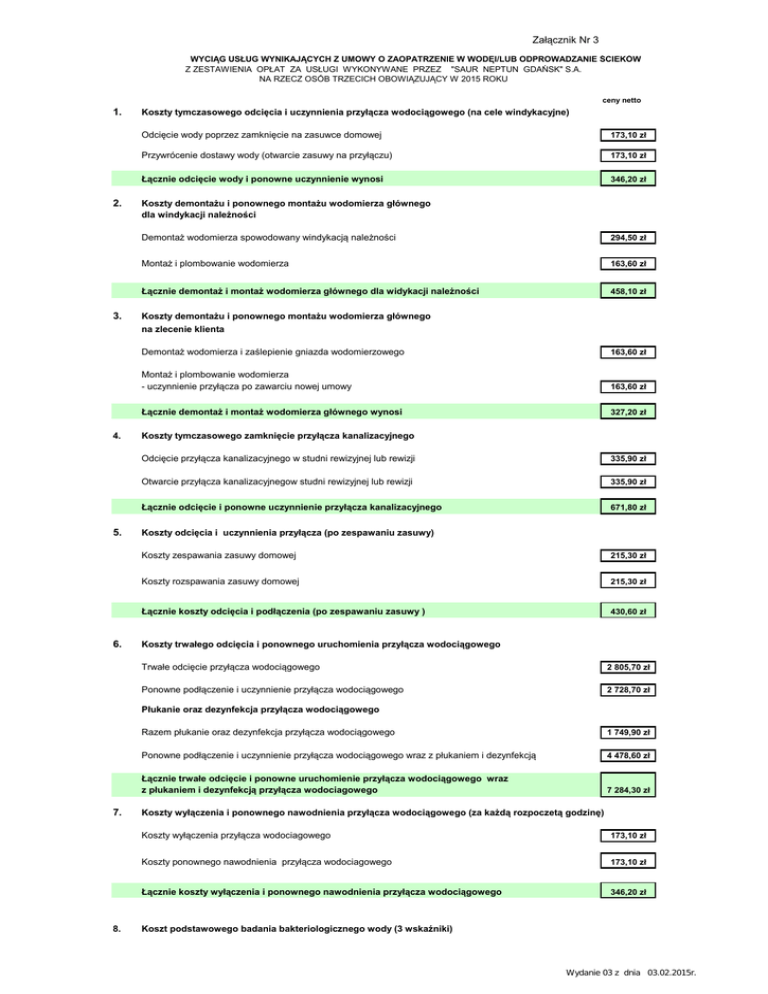 Załącznik Nr 3 WYCIĄG USŁUG WYNIKAJĄCYCH Z UMOWY O ZAOPATRZENIE W WODĘI/LUB ODPROWADZANIE ŚCIEKÓW Z ZESTAWIENIA OPŁAT ZA USŁUGI WYKONYWANE PRZEZ "SAUR NEPTUN GDAŃSK" S.A. NA RZECZ OSÓB TRZECICH OBOWIĄZUJĄCY W 2015 ROKU ceny netto 1. 2. 3. Koszty tymczasowego odcięcia i uczynnienia przyłącza wodociągowego (na cele windykacyjne) Odcięcie wody poprzez zamknięcie na zasuwce domowej 173,10 zł Przywrócenie dostawy wody (otwarcie zasuwy na przyłączu) 173,10 zł Łącznie odcięcie wody i ponowne uczynnienie wynosi 346,20 zł Koszty demontażu i ponownego montażu wodomierza głównego dla windykacji należności Demontaż wodomierza spowodowany windykacją należności 294,50 zł Montaż i plombowanie wodomierza 163,60 zł Łącznie demontaż i montaż wodomierza głównego dla widykacji należności 458,10 zł Koszty demontażu i ponownego montażu wodomierza głównego na zlecenie klienta 4. 5. 6. Demontaż wodomierza i zaślepienie gniazda wodomierzowego 163,60 zł Montaż i plombowanie wodomierza - uczynnienie przyłącza po zawarciu nowej umowy 163,60 zł Łącznie demontaż i montaż wodomierza głównego wynosi 327,20 zł Koszty tymczasowego zamknięcie przyłącza kanalizacyjnego Odcięcie przyłącza kanalizacyjnego w studni rewizyjnej lub rewizji 335,90 zł Otwarcie przyłącza kanalizacyjnegow studni rewizyjnej lub rewizji 335,90 zł Łącznie odcięcie i ponowne uczynnienie przyłącza kanalizacyjnego 671,80 zł Koszty odcięcia i uczynnienia przyłącza (po zespawaniu zasuwy) Koszty zespawania zasuwy domowej 215,30 zł Koszty rozspawania zasuwy domowej 215,30 zł Łącznie koszty odcięcia i podłączenia (po zespawaniu zasuwy ) 430,60 zł Koszty trwałego odcięcia i ponownego uruchomienia przyłącza wodociągowego Trwałe odcięcie przyłącza wodociągowego 2 805,70 zł Ponowne podłączenie i uczynnienie przyłącza wodociągowego 2 728,70 zł Płukanie oraz dezynfekcja przyłącza wodociągowego 7. 8. Razem płukanie oraz dezynfekcja przyłącza wodociągowego 1 749,90 zł Ponowne podłączenie i uczynnienie przyłącza wodociągowego wraz z płukaniem i dezynfekcją 4 478,60 zł Łącznie trwałe odcięcie i ponowne uruchomienie przyłącza wodociągowego wraz z płukaniem i dezynfekcją przyłącza wodociagowego 7 284,30 zł Koszty wyłączenia i ponownego nawodnienia przyłącza wodociągowego (za każdą rozpoczetą godzinę) Koszty wyłączenia przyłącza wodociagowego 173,10 zł Koszty ponownego nawodnienia przyłącza wodociagowego 173,10 zł Łącznie koszty wyłączenia i ponownego nawodnienia przyłącza wodociągowego 346,20 zł Koszt podstawowego badania bakteriologicznego wody (3 wskaźniki) Wydanie 03 z dnia 03.02.2015r. Łącznie koszt podstawowego badania bakteriologicznego z poborem i transportem do laboratorium Do powyższych cen dolicza się podatek VAT zgodnie z obowiązującymi przepisami 129,06 zł (obecnie 23%) W przypadku naprawy, wymiany lub plombowania wodomierza głównego w następstwie okoliczności, za które odpowiedzialność ponosi Odbiorca Usług wskutek braku właściwego zabezpieczenia wodomierza, usługa jest płatna zgodnie z zestawieniem opłat za usługi wykonywane przez SNG na rzecz osób trzecich. Wydanie 03 z dnia 03.02.2015r.