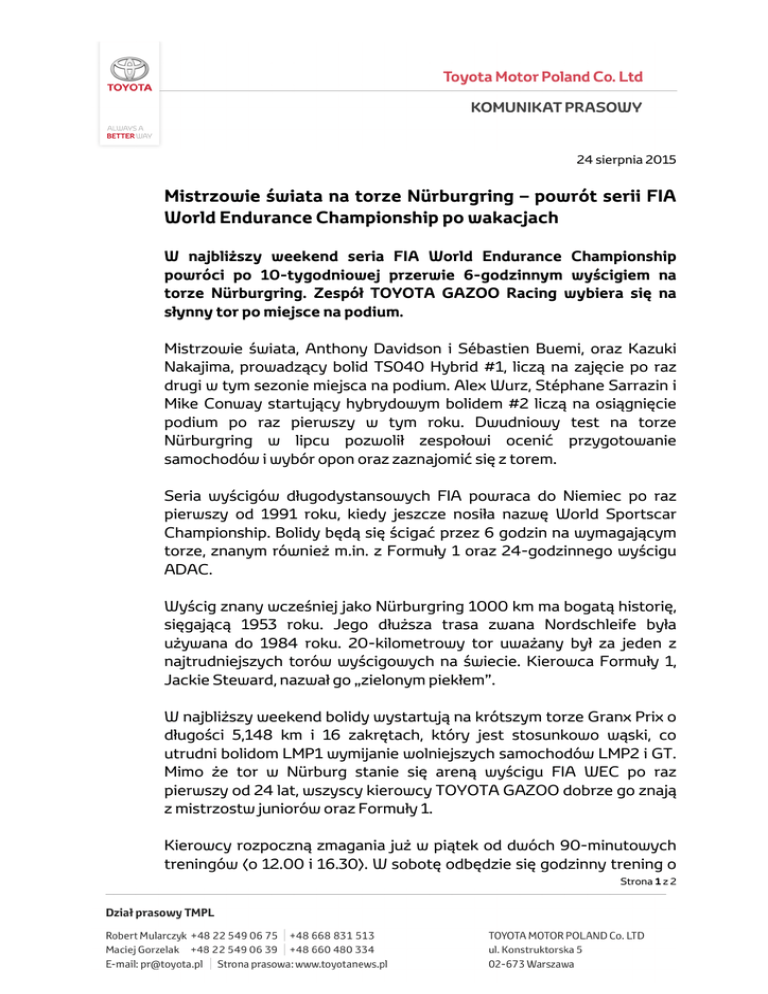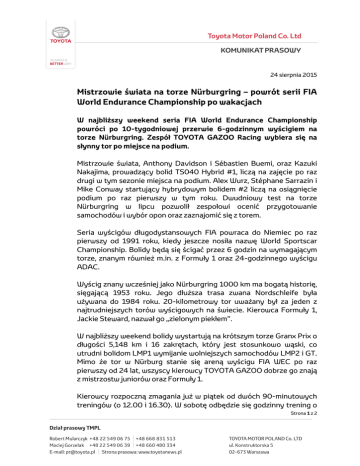 24 sierpnia 2015 Mistrzowie świata na torze Nürburgring – powrót serii FIA World Endurance Championship po wakacjach W najbliższy weekend seria FIA World Endurance Championship powróci po 10-tygodniowej przerwie 6-godzinnym wyścigiem na torze Nürburgring. Zespół TOYOTA GAZOO Racing wybiera się na słynny tor po miejsce na podium. Mistrzowie świata, Anthony Davidson i Sébastien Buemi, oraz Kazuki Nakajima, prowadzący bolid TS040 Hybrid #1, liczą na zajęcie po raz drugi w tym sezonie miejsca na podium. Alex Wurz, Stéphane Sarrazin i Mike Conway startujący hybrydowym bolidem #2 liczą na osiągnięcie podium po raz pierwszy w tym roku. Dwudniowy test na torze Nürburgring w lipcu pozwolił zespołowi ocenić przygotowanie samochodów i wybór opon oraz zaznajomić się z torem. Seria wyścigów długodystansowych FIA powraca do Niemiec po raz pierwszy od 1991 roku, kiedy jeszcze nosiła nazwę World Sportscar Championship. Bolidy będą się ścigać przez 6 godzin na wymagającym torze, znanym również m.in. z Formuły 1 oraz 24-godzinnego wyścigu ADAC. Wyścig znany wcześniej jako Nürburgring 1000 km ma bogatą historię, sięgającą 1953 roku. Jego dłuższa trasa zwana Nordschleife była używana do 1984 roku. 20-kilometrowy tor uważany był za jeden z najtrudniejszych torów wyścigowych na świecie. Kierowca Formuły 1, Jackie Steward, nazwał go „zielonym piekłem”. W najbliższy weekend bolidy wystartują na krótszym torze Granx Prix o długości 5,148 km i 16 zakrętach, który jest stosunkowo wąski, co utrudni bolidom LMP1 wymijanie wolniejszych samochodów LMP2 i GT. Mimo że tor w Nürburg stanie się areną wyścigu FIA WEC po raz pierwszy od 24 lat, wszyscy kierowcy TOYOTA GAZOO dobrze go znają z mistrzostw juniorów oraz Formuły 1. Kierowcy rozpoczną zmagania już w piątek od dwóch 90-minutowych treningów (o 12.00 i 16.30). W sobotę odbędzie się godzinny trening o Strona 1 z 2 9.30 oraz kwalifikacje od 14.30 do 14.50. Właściwy wyścig rozpocznie się w sobotę o 13.00. TOYOTA Racing w serii FIA World Endurance Championship W roku 1983 TOYOTA zapoczątkowała karierę w wyścigach długodystansowych FIA World Endurance Championship. Dwa lata później wystartowała po raz pierwszy w 24-godzinnym wyścigu Le Mans. Od tego przełomowego w historii marki wydarzenia bolidy Toyoty wzięły udział w 16 wyścigach Le Mans 24 Hours, zajmując drugie pozycje w latach 1992, 1994, 1999 i 2013. W 2012 roku zadebiutowała z modelem TS030, w pełni hybrydowym bolidem startującym w klasie prototypów LMP1. Nowy samochód pierwsze zwycięstwo w serii WEC odniósł już podczas swojego trzeciego wyścigu. Łącznie po dwóch sezonach startów ma na koncie 5 zwycięstw. W 2014 roku zastąpił go bolid TS040 HYBRID z napędem na 4 koła. 1000-konna hybryda zapewniła Toyocie mistrzostwo producentów oraz mistrzostwo kierowców w sezonie 2014. Oba bolidy zostały zaprojektowane i zbudowane przez Toyota Motorsport GmbH (TMG) z Kolonii, gdzie siedzibę ma cały zespół wyścigowy. W przeszłości w TMG umiejscowiony był także zespół Toyota World Rally i fabryczny zespół Formuły 1. W roku 1998 TMG zaprezentowała światu bolid TS020, który startował w wyścigach Le Mans 24 Hours w latach 1998-99. Obecnie TMG łączy uczestnictwo w motorsporcie z rozwojem zaawansowanej technologii, dostarczanej firmom zewnętrznym oraz rodzinie seryjnych modeli Toyoty. Strona 2 z 2
