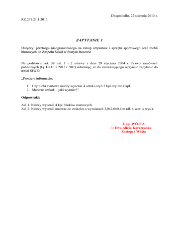 Długosiodło, 22 sierpnia 2013 r. RZ.271.21.1.2013 ZAPYTANIE 1 Dotyczy: przetargu nieograniczonego na zakup artykułów i sprzętu sportowego oraz mebli biurowych do Zespołu Szkół w Starym Bosewie Na podstawie art. 38 ust. 1 i 2 ustawy z dnia 29 stycznia 2004 r. Prawo zamówień publicznych (t.j. Dz.U. z 2013 r. 907) informuję, że do zamawiającego wpłynęło zapytanie do treści SIWZ: „Proszę o informacje; 1. Czy bloki startowe należy wycenić 4 sztuki czyli 2 kpl czy też 4 kpl. 2. Materac zeskok – jaki wymiar?” Odpowiedź: Ad. 1. Należy wycenić 4 kpl. bloków startowych. Ad. 2. Należy wycenić materac do zeskoku o wymiarach 3,0x2,0x0,4 m (dł. x szer. x wys.). Z up. WÓJTA /-/ Ewa Alicja Karczewska Zastępca Wójta