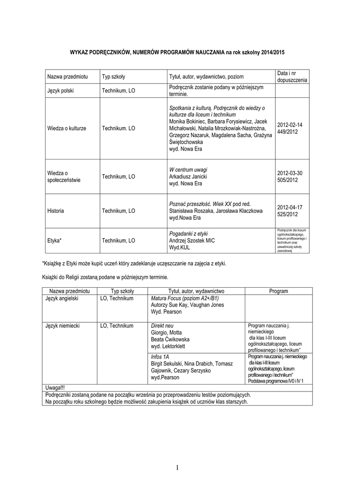 WYKAZ PODRĘCZNIKÓW, NUMERÓW PROGRAMÓW NAUCZANIA na rok szkolny 2014/2015 Data i nr dopuszczenia Nazwa przedmiotu Typ szkoły Tytuł, autor, wydawnictwo, poziom Język polski Technikum, LO Podręcznik zostanie podany w późniejszym terminie. Wiedza o kulturze Technikum. LO Spotkania z kulturą. Podręcznik do wiedzy o kulturze dla liceum i technikum Monika Bokiniec, Barbara Forysiewicz, Jacek 2012-02-14 Michałowski, Natalia Mrozkowiak-Nastrożna, 449/2012 Grzegorz Nazaruk, Magdalena Sacha, Grażyna Świętochowska wyd. Nowa Era Wiedza o społeczeństwie Technikum, LO W centrum uwagi Arkadiusz Janicki wyd. Nowa Era 2012-03-30 505/2012 Historia Technikum, LO Poznać przeszłość. Wiek XX pod red. Stanisława Roszaka, Jarosława Kłaczkowa wyd.Nowa Era 2012-04-17 525/2012 Technikum, LO Pogadanki z etyki Andrzej Szostek MIC Wyd.KUL Podręcznik dla liceum ogólnokształcącego, liceum profilowanego i technikum oraz zasadniczej szkoły zawodowej Etyka* *Książkę z Etyki może kupić uczeń który zadeklaruje uczęszczanie na zajęcia z etyki. Książki do Religii zostaną podane w późniejszym terminie. Nazwa przedmiotu Język angielski Typ szkoły LO, Technikum Tytuł, autor, wydawnictwo Matura Focus (poziom A2+/B1) Autorzy Sue Kay, Vaughan Jones Wyd. Pearson Język niemiecki LO, Technikum Direkt neu Giorgio, Motta Beata Ćwikowska wyd. Lektorklett Infos 1A Birgit Sekulski, Nina Drabich, Tomasz Gajownik, Cezary Serzysko wyd.Pearson Program Program nauczania j. niemieckiego dla klas I-III liceum ogólnokształcącego, liceum profilowanego i technikum” Program nauczania j. niemieckiego dla klas I-III liceum ogólnokształcącego, liceum profilowanego i technikum” Podstawa programowa IV0 i IV 1 Uwaga!!! Podręczniki zostaną podane na początku września po przeprowadzeniu testów poziomujących. Na początku roku szkolnego będzie możliwość zakupienia książek od uczniów klas starszych. 1 Nazwa przedmiotu Typ szkoły Tytuł, autor, wydawnictwo, poziom Geografia wszystkie ponadgimnazjalne Chemia wszystkie ponadgimnazjalne Biologia wszystkie ponadgimnazjalne Fizyka wszystkie ponadgimnazjalne Matematyka liceum i technikum Edukacja dla bezpieczeństwa podręcznik dla szkół ponadgimnazjalnych „Oblicza geografi” R.Uliszak, K.Wiederman Nowa Era Poziom podstawowy „To jest chemia” R.Hassa,A.Mrzigod, J.Mrzigod Nowa Era Poziom podstawowy „Biologia na casie” E.Bonar, W.Krzeszowiec-Jeleń, S.Czachorowski Nowa Era Poziom podstawowy "Świat fizyki. Podręcznik dla szkół ponadgimnazjalnych. Zakres podstawowy" Zamkor Poziom podstawowy MATEMATYKA. Zakres podstawowy i rozszerzony Nowa Era Typ szkoły Systemy operacyjne Urządzenia techniki komputerowej Diagnostyka i naprawa urządzeń techniki komputerowej Technikum Technik informatyk klasy 1-2 Typ szkoły Systemy operacyjne i sieci Technik informatyk komputerowe klasa 1, klasa 2 14.02.2012 MEN 450/2012 08.12.2012 MEN 394/2012 360/1/2011 24.08.2011 426/2012 Informatyka dla szkół ponadgimnazjalnych – zakres podstawowy, Grażyna Koba, MIGRA Nazwa przedmiotu Nazwa przedmiotu 03.02.2012 MEN 438/2012 Krok przedsiębiorczości Zbigniew Makieła, Tomasz Rachwał Nowa Era Poziom podstawowy technikum Data i nr dopuszczenia 31.01.2012 MEN433/2012 Żyje i działam bezpiecznie Zakres podstawowy Jarosław Słoma Nowa Era podręcznik dla szkół Podstawy ponadgimnazjalnych przedsiębiorczości Informatyka Nr programu 29.02.2012 467/2012 Symbole cyfrowe zawodów: 311408 311204 351203 351103 311930 536/2012 Tytuł Kwalifikacja E-12 Montaż i eksploatacja komputerów osobistych oraz urządzeń peryferyjnych. Tomasz Kowalski wyd. Helion Nr programu Symbole cyfrowe zawodów: 351203 Data i nr dopuszczenia Tytuł, autor, wydawnictwo, poziom Nr programu Systemy operacyjne i sieci komputerowe. Część 1, 2 Krzysztof Pytel Sylwia Osetek, WSiP 312[01]/T,SP/MENiS/2004.06.14 2010 2 Nazwa przedmiot Typ szkoły Rysunek techniczny Technologia robót murarskich i tynkarskich Tytuł podręcznika Autor Wydawnictwo „Rysunek techniczny budowlany” „Murarstwo i tynkarstwo. Materiały.” „Murarstwo i tynkarstwo. Roboty murarskie.” Tadeusz Maj Edward Szymański Włodzimierz Martinek, Nabi Ibadov Włodzimierz Martinek, Nabi Ibadov Włodzimierz Martinek, Nabi Ibadov Tadeusz Maj WSiP WSiP „Murarstwo i tynkarstwo. Roboty tynkarskie.” Organizacja robót budowlanych Technikum – technik budownictwa „Murarstwo i tynkarstwo. Odbiory, naprawy i rozliczenia.” „Organizacja i przygotowanie budowy.” „Organizacja i technologia robót stanu surowego.” „Organizacja i technologia robót wykończeniowych.” „Utrzymanie obiektów budowlanych.” „Organizacja robót rozbiórkowych.” WSiP Tadeusz Maj Tadeusz Maj Tadeusz Maj Tadeusz Maj Podręczniki z innych przedmiotów zawodowych dla klas pierwszych w związku z wprowadzaniem nowej podstawy programowej zostaną podane na początku roku szkolnego. Zatwierdzono przez Radę Pedagogiczną dnia 23.06.2014r. 3 Nr programu Symbole cyfrowe zawodów: 311204