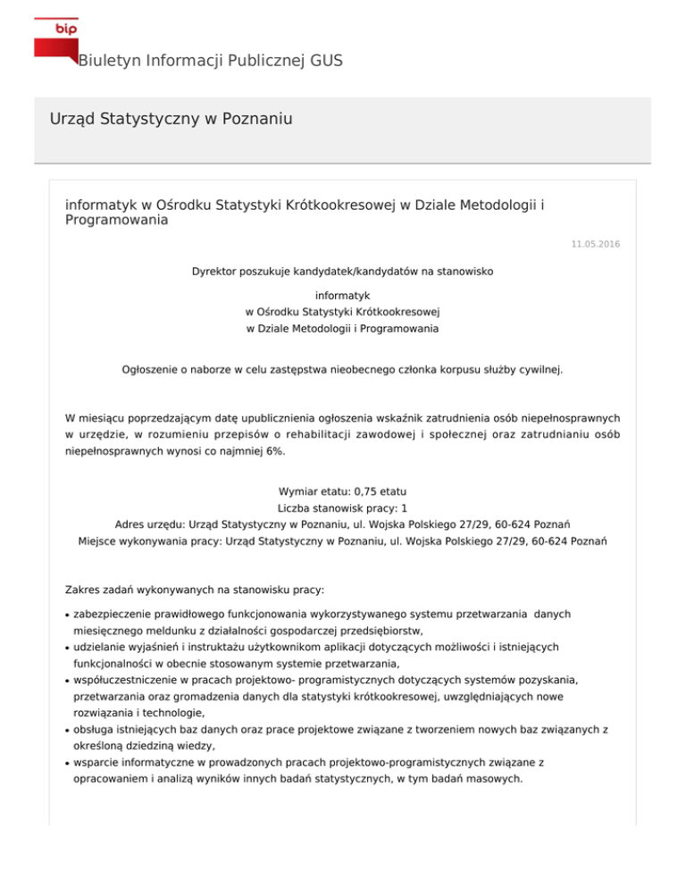 Biuletyn Informacji Publicznej GUS Urząd Statystyczny w Poznaniu informatyk w Ośrodku Statystyki Krótkookresowej w Dziale Metodologii i Programowania 11.05.2016 Dyrektor poszukuje kandydatek/kandydatów na stanowisko informatyk w Ośrodku Statystyki Krótkookresowej w Dziale Metodologii i Programowania Ogłoszenie o naborze w celu zastępstwa nieobecnego członka korpusu służby cywilnej. W miesiącu poprzedzającym datę upublicznienia ogłoszenia wskaźnik zatrudnienia osób niepełnosprawnych w urzędzie, w rozumieniu przepisów o rehabilitacji zawodowej i społecznej oraz zatrudnianiu osób niepełnosprawnych wynosi co najmniej 6%. Wymiar etatu: 0,75 etatu Liczba stanowisk pracy: 1 Adres urzędu: Urząd Statystyczny w Poznaniu, ul. Wojska Polskiego 27/29, 60-624 Poznań Miejsce wykonywania pracy: Urząd Statystyczny w Poznaniu, ul. Wojska Polskiego 27/29, 60-624 Poznań Zakres zadań wykonywanych na stanowisku pracy: ● zabezpieczenie prawidłowego funkcjonowania wykorzystywanego systemu przetwarzania danych miesięcznego meldunku z działalności gospodarczej przedsiębiorstw, ● udzielanie wyjaśnień i instruktażu użytkownikom aplikacji dotyczących możliwości i istniejących funkcjonalności w obecnie stosowanym systemie przetwarzania, ● współuczestniczenie w pracach projektowo- programistycznych dotyczących systemów pozyskania, przetwarzania oraz gromadzenia danych dla statystyki krótkookresowej, uwzględniających nowe rozwiązania i technologie, ● obsługa istniejących baz danych oraz prace projektowe związane z tworzeniem nowych baz związanych z określoną dziedziną wiedzy, ● wsparcie informatyczne w prowadzonych pracach projektowo-programistycznych związane z opracowaniem i analizą wyników innych badań statystycznych, w tym badań masowych. Warunki pracy Warunki dotyczące charakteru pracy na stanowisku i sposobu wykonywania zadań: Praca administracyjno-biurowa na stanowisku wyposażonym w komputer i monitor ekranowy. Praca wewnątrz pomieszczenia, lekka z przewagą wysiłku umysłowego, siedząca, samodzielna, wymagająca szczególnej koncentracji. Opracowywanie dokumentów, prace analityczno-koncepcyjne i biurowokancelaryjne. Użytkowanie sprzętu biurowego (komputer, drukarka, kserokopiarka, niszczarka do dokumentów). Reprezentowanie Urzędu poza siedzibą, udział w seminariach, warsztatach i konferencjach, wyjazdy służbowe. Miejsce i otoczenie organizacyjno-techniczne stanowiska pracy: Stanowisko pracy znajduje się w należącym do Urzędu Statystycznego 5-kondygnacyjnym budynku administracyjnym przy ul. Wojska Polskiego 27/29 w Poznaniu. Budynek stanowi obiekt administracji publicznej. W obrębie wszystkich kondygnacji znajdują się pomieszczenia biurowe, sanitarne, socjalne i pomocnicze. W obiekcie wydzielone są strefy ograniczonego dostępu. Pod względem organizacyjnotechnicznym i użytkowym budynek jest w pełni dostosowany dla potrzeb osób niepełnosprawnych. Wymagania związane ze stanowiskiem pracy niezbędne wykształcenie: wyższe doświadczenie: brak pozostałe wymagania niezbędne: ● znajomość języka angielskiego na poziomie komunikatywnym, ● znajomość języka SQL i zagadnień związanych z budową relacyjnych baz danych, ● znajomość technologii informatycznych i języków programowania, ● podstawowa umiejętność projektowania i analizy, ● znajomość metod statystycznych, ● rzetelność, ● organizacja pracy i orientacja na osiąganie celów, ● wykorzystanie wiedzy i doskonalenie zawodowe, ● współpraca, ● komunikacja interpersonalna, ● komunikacja pisemna. wymagania dodatkowe: ● wykształcenie wyższe profilowe (techniczne lub informatyczne), ● znajomość pakietów statystycznych, ● znajomość zagadnień związanych z optymalizacją i strojeniem zapytań SQL, ● praktyczna znajomość jednego z czołowych silników RDBMS (np. Microsoft SQL Server, Oracle, Sybase), ● znajomość architektury i zagadnień związanych z hurtowniami danych, ● znajomość podstawowych zagadnień związanych ze statystyką publiczną, ● myślenie analityczne, ● kreatywność. Wymagane dokumenty i oświadczenia: ● życiorys i list motywacyjny, ● oświadczenie o wyrażeniu zgody na przetwarzanie danych osobowych do celów rekrutacji, ● oświadczenie o korzystaniu z pełni praw publicznych, ● oświadczenie o nieskazaniu prawomocnym wyrokiem za umyślne przestępstwo lub umyślne przestępstwo skarbowe, ● kopie dokumentów potwierdzających wykształcenie, ● kopia dokumentu potwierdzającego posiadanie polskiego obywatelstwa lub oświadczenie o posiadaniu obywatelstwa polskiego, ● CV, ● kopie świadectw pracy oraz inne zaświadczenia potwierdzające spełnianie wymagań niezbędnych i dodatkowych. Termin składania dokumentów: do dnia 27-05-2016 r., pod adresem: Urząd Statystyczny w Poznaniu Sekretariat ul. Wojska Polskiego 27/29 60-624 Poznań koniecznie z dopiskiem - Oferta nr 7/2016 Inne informacje: Kandydatki/kandydaci proszeni są o odniesienie się w liście motywacyjnym do spełniania wymagań niezbędnych i dodatkowych. List motywacyjny musi być opatrzone własnoręcznym podpisem a oświadczenia muszą być opatrzone datą i własnoręcznym podpisem. Prosimy o skorzystanie ze wzorów oświadczeń zamieszczonych na stronie: http://bip.stat.gov.pl/ogloszenia/wolne-stanowiska-pracy/urzad-statystyczny-w-poznaniu/ Kandydatki/kandydaci zakwalifikowani zostaną powiadomieni telefonicznie lub e-mailem o terminie postępowania rekrutacyjnego. Oferty kandydatek/kandydatów niezakwalifikowanych zostaną komisyjnie zniszczone po zakończeniu procedury naboru. Dodatkowe informacje można uzyskać pod nr tel. 61 27-98-267. Do składania dokumentów zachęcamy również osoby niepełnosprawne. Nasz urząd jest pracodawcą równych szans i wszystkie aplikacje są rozważane z równą uwagą bez względu na płeć, wiek, niepełnosprawność, rasę, narodowość, przekonania polityczne, p