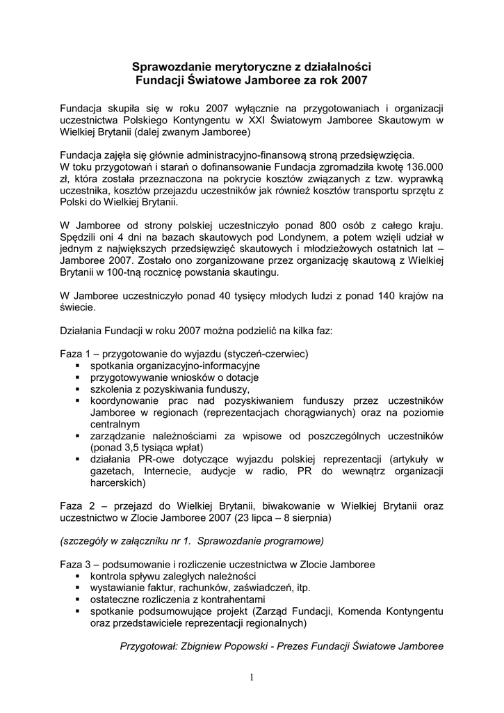 Sprawozdanie merytoryczne z działalności Fundacji Światowe Jamboree za rok 2007 Fundacja skupiła się w roku 2007 wyłącznie na przygotowaniach i organizacji uczestnictwa Polskiego Kontyngentu w XXI Światowym Jamboree Skautowym w Wielkiej Brytanii (dalej zwanym Jamboree) Fundacja zajęła się głównie administracyjno-finansową stroną przedsięwzięcia. W toku przygotowań i starań o dofinansowanie Fundacja zgromadziła kwotę 136.000 zł, która została przeznaczona na pokrycie kosztów związanych z tzw. wyprawką uczestnika, kosztów przejazdu uczestników jak również kosztów transportu sprzętu z Polski do Wielkiej Brytanii. W Jamboree od strony polskiej uczestniczyło ponad 800 osób z całego kraju. Spędzili oni 4 dni na bazach skautowych pod Londynem, a potem wzięli udział w jednym z największych przedsięwzięć skautowych i młodzieżowych ostatnich lat – Jamboree 2007. Zostało ono zorganizowane przez organizację skautową z Wielkiej Brytanii w 100-tną rocznicę powstania skautingu. W Jamboree uczestniczyło ponad 40 tysięcy młodych ludzi z ponad 140 krajów na świecie. Działania Fundacji w roku 2007 można podzielić na kilka faz: Faza 1 – przygotowanie do wyjazdu (styczeń-czerwiec) spotkania organizacyjno-informacyjne przygotowywanie wniosków o dotacje szkolenia z pozyskiwania funduszy, koordynowanie prac nad pozyskiwaniem funduszy przez uczestników Jamboree w regionach (reprezentacjach chorągwianych) oraz na poziomie centralnym zarządzanie należnościami za wpisowe od poszczególnych uczestników (ponad 3,5 tysiąca wpłat) działania PR-owe dotyczące wyjazdu polskiej reprezentacji (artykuły w gazetach, Internecie, audycje w radio, PR do wewnątrz organizacji harcerskich) Faza 2 – przejazd do Wielkiej Brytanii, biwakowanie w Wielkiej Brytanii oraz uczestnictwo w Zlocie Jamboree 2007 (23 lipca – 8 sierpnia) (szczegóły w załączniku nr 1. Sprawozdanie programowe) Faza 3 – podsumowanie i rozliczenie uczestnictwa w Zlocie Jamboree kontrola spływu zaległych należności wystawianie faktur, rachunków, zaświadczeń, itp. ostateczne rozliczenia z kontrahentami spotkanie podsumowujące projekt (Zarząd Fundacji, Komenda Kontyngentu oraz przedstawiciele reprezentacji regionalnych) Przygotował: Zbigniew Popowski - Prezes Fundacji Światowe Jamboree 1 załącznik nr 1. Sprawozdanie programowe 1. Przygotowania programowe W ramach przygotowań odbywały się spotkania z kadrą drużyn, podczas których na bieżąco przekazywane były informacje na temat organizacji i programu Jamboree. W trakcie spotkań odbywały się warsztaty programowe, mające na celu przygotowanie kadry do prezentacji Polski oraz harcerstwa podczas Jamboree. Zajęcia te dotyczyły w dużej mierze szkoleń z zakresu aplikowania o środki do działania oraz rozliczania projektów. Członkowie IST (administracyjna kadra pomocnicza) zostali także przygotowani do prowadzenia zajęć w ramach World Villages. Wnioski: - trudno pracowało się z kadrą – kadra wymieniała się na spotkaniach, ale byli też tacy, którzy obecni byli na wszystkich spotkaniach. Przykro przyznać, ale nie wszyscy członkowie kadry mieli nawyk czytania materiałów na naszej liście dyskusyjnej. Taki układ powodował, że często zmuszeni byliśmy powtarzać na spotkaniach informacje, które pojawiały się wcześniej. - najwięcej informacji członkowie kadry wynosili ze spotkań – w przyszłości należy utrzymać warsztaty i spotkania z kadrą 2. Program Jamboree: Program podzielony na dziewięć modułów. Uczestnicy spędzali cały dzień lub kilka godzin dziennie w każdym z nich, uczestnicząc w zajęciach prowadzonych przez międzynarodową kadrę: - Gilwell – z linami, torami przeszkód, ściankami do wspinaczki; - Splash! – czyli wszystko co związane z wodą – budowanie tratew, pływanie w kajakach; - Starburst – dzień służby na rzecz lokalnego społeczeństwa, połączony z poznawaniem lokalnych atrakcji turystycznych - World Village – warsztaty przygotowane przez kraje uczestniczące w Jamboree – można było spróbować sił w dojeniu krowy, gotowaniu egzotycznych (dla nas) potraw, malowaniu na szkle, nauce tańca, wyplataniu pierścieni i wielu innych. W tym bloku programowym zajęcia prowadzili także polscy instruktorzy - Trash, czyli zajęcia podczas których wykorzystywane były popularne śmieci służyły jako instrumenty muzyczne, elementy budowli – podczas zajęć uczestnicy mieli także okazję zastanowić się nad ich wykorzystaniem w codziennym życiu oraz nad ich wpływem na naszą planetę - Elements – warsztaty związane z żywiołami oraz ich wpływem na nasze życie - Wioska Globalnego Rozwoju (Global Development Village) z zajęciami poświęconymi aktualnym problemom na świecie oraz sposobom ich rozwiązania – także w najbliższym otoczeniu - Choice Time – można było odwiedzić cyrk i nauczyć się żonglerki czy akrobacji, było nurkowanie w rozstawionych ogromnych basenach, nauka salsy, aerobik, golf, park dla deskorolkarzy, gry zespołowe, budowa konstrukcji z drewna, rozpalanie ognisk… a jeśli ktoś chciałby chwilę odetchnąć i odpocząć, to mógł skorzystać z masażu, chwili relaksu podczas jogi, tai – chi czy po prostu odpocząć na plaży, która wyrosła w jednym z miejsc programowych. 2 Oprócz zajęć w poszczególnych modułach można było wybrać się w podróż dookoła świata, czyli odwiedzić World Scout Centre – namioty narodowe poszczególnych krajów i organizacji, które z lotu ptaka układały się w skautową lilijkę. Centrum religijne – Faith and Beliefs – też czekało z dodatkowymi zajęciami, pozwalającymi na poznanie wielu różnych, niekoniecznie znanych religii oraz organizacji. Dodatkowo na terenie całego zlotu znajdowało się sześć londyńskich autobusów, w których znajdowały się prezentacje i krótkie warsztatowe zajęcia, poruszające problemy współczesnego świata – 