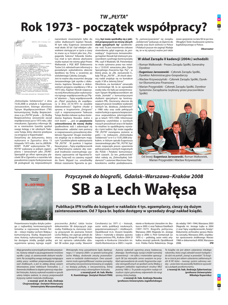 TW „PŁYTA” Rok 1973 - początek współpracy? „Dolnośląska Solidarności” z dnia 15.05.2008 w artykule o Eugeniuszu Jaroszewskim, którego określono Tajnym Współpracownikiem (TW) komunistycznej Służby Bezpieczeństwa o p.s „PŁYTA” pisała - „ Ze Służbą Bezpieczeństwa Jaroszewski zaczął współpracować już w 1973 roku. Jako mieszkaniec Zgorzelca informuje SB, że w niemieckim Goerlitz spotkał swego kolegę z lat szkolnych Tadeusza Tutaja, który obecnie przebywa na emigracji w Kopenhadze”. Dotarliśmy do dokumentu, który wykonano w Zgorzelcu dnia 15 listopada 1973 roku. Jest to „KIERUNKOWY PLAN” wykorzystania TW „ PŁYTA” wykonany w jednym egzemplarzu i oznaczonym jako „TAJNE”. Sporządził go oficer operacyjny placówki SB w Zgorzelcu o nazwisku lub pseudonimie (często funkcjonariusze SB posługiwali się nieprawdziwymi nazwiskami stworzonymi tylko do celów służbowych) kapitan Nowak. W tym roku Eugeniusz Jaroszewski miał około 30 lat i był młodym człowiekiem startującym w życie a czasy te znane są w historii jako tzw. „Propaganda Sukcesu” Edwarda Gierka. Czy miał w tym okresie ukończone studia wyższe nie wiemy gdyż Prezes Walkowiak z PGE BOT Elektrownia Turów S.A. odmówił nam informacji o posiadanym wykształceniu obecnie dyrektora tej firmy a wcześniej jej wieloletniego Członka Zarządu. Jest to ważne aby zrozumieć decyzję Jaroszewskiego (jak wynika z dokumentu kapitana Nowaka) o dobrowolnym przyjęciu współpracy z SB w 1973 roku. Kapitan Nowak rozpoczyna swój Kierunkowy plan wykorzystania tajnego współpracownika ps.”Płyta” zdaniem - „ Tajny współpracownik ps. „Płyta” pozyskany do współpracy w dniu 23.10.1973 na zasadzie dobrowolności”. Ogólnie chodzi o sprawę o kryptonimie „Emigrant” czyli o rozpracowywanie Tadeusza Tutaja. Bardzo ciekawe są dwa stwierdzenia Kapitana Nowaka. Jedno z nich brzmi - „ ...jest on pozytywnie ustosunkowany do naszej służby (podkreślenie red) i zobowiązał się dobrowolnie udzielać nam pomocy w rozpoznawaniu prowadzonej działalności figuranta”. Drugie stwierdzenie znajduje się w obszernym mającym 7 punktów planie wykorzystania TW „PŁYTA” . W punkcie 3 kapitan Nowak pisze - „ Tajny współpracownik ps.”Płyta”otrzyma zadanie aby rozeznał możliwości ewentualnego uzyskania zaproszenia od figuranta(Tadeusz Tutaj-red) na czasowy wyjazd do Danii. Wyjazd t.w. umożliwiłby bliższe rozeznanie figuranta za gra- nicą, być może spotkałby się z jakimiś propozycjami ze strony obcych służb specjalnych itp” (podkreślenie -red). To jest niezmiernie ciekawe stwierdzenie, gdyż sugeruje, że „prowadzący” Eugeniusza Jaroszewskiego kapitan Nowak był etatowym pracownikiem cywilnego kontrwywiadu PRL czyli II Wydziału SB. Potwierdzać to może cytowana przez nas notatka z 13.03.81 oznaczona jako „Tajne Specjalnego Znaczenia Egz. Poj.” , w której pisze, że „Ob. Jaroszewski E., były TW ps. „PŁYTA” .....W chwili obecnej nadal znajduje się na kontakcie wydz. II SB w Jeleniej Górze.” Określenia „na kontakcie” oznaczało w terminologii SB, to że wprawdzie osoba taka nie była już zarejestrowanym Tajnym Współpracownikiem ale miała „kontakt” z komunistycznymi służbami specjalnymi np. kontrwywiadem PRL. Docieramy obecnie do żyjących jeszcze świadków wydarzeń tamtych lat, działaczy „Solidarności” z 1980 roku oraz osób pełniących ważne funkcje o aparacie bezpieczeństwa województwa jeleniogórskiego w latach 1973-1990. Informować będziemy czytelników o wynikach naszych poszukiwań oraz o ile będzie to możliwe to opublikujemy wywiady z tymi ludźmi. Być może zagadka TW „PŁYTA” rozwiązana zostanie w pełni i to niebawem. „Dolnośląska Solidarność” w nr 5 z 15.05.2008 artykułem, w którym opisała Eugeniusza Jaroszewskiego jako TW „ PŁYTA”, być może rozpoczęła proces ujawnienia pełnej prawdy o tamtych tragicznych dla Polski i Polaków komunistycznych czasach. Za ten „prekursorski” tekst należą się „Dolnośląskiej Solidarności” i autorowi Marcinowi Raczkowskiemu wielkie podziękowania. To „samooczyszczenie” się związku „Solidarność” pokazuje, że dążenie do prawdy oraz duch wolności w Polsce i Polakach jeszcze nie zaginął. Wydaje się, że w tej sytuacji ważne jest także C M Y K nowe spojrzenie na lata 90-te po tzw. Okrągłym Stole i budowanie systemu kapitalistycznego w Polsce. Obserwator W skład Zarządu II kadencji (2004r.) wchodzili: • Roman Walkowiak - Prezes Zarządu Spółki, Generalny Dyrektor • Eugeniusz Jaroszewski - Członek Zarządu Spółki, Dyrektor Administracyjno-Gospodarczy • Wacław Krzywoszyński - Członek Zarządu Spółki, Dyrektor Ekonomiczno-Finansowy • Marian Przygrodzki - Członek Zarządu Spółki, Dyrektor Systemów Zarządzania (wybrany przez pracowników Spółki) Od lewej: Eugeniusz Jaroszewski, Roman Walkowiek, Marian Przygrodzki i Wacław Krzywoszński Przyczynek do biografii, Gdańsk–Warszawa–Kraków 2008 SB a Lech Wałęsa Publikacja IPN trafiła do księgarń w nakładzie 4 tys. egzemplarzy, cieszy się dużym zainteresowaniem. Od 7 lipca br. będzie dostępny w sprzedaży drugi nakład książki. Prezentowana książka dotyka jednego z najbardziej kontrowersyjnych tematów w najnowszej historii Polski – relacji między Lechem Wałęsą i komunistyczną Służbą Bezpieczeństwa. Autorzy, wykorzystując wszystkie dostępne źródła, podjęli próbę wyjaśnienia sprawy tajnego współ- pracownika „Bolka”, także losów dokumentów SB dotyczących jego osoby. Publikacja ta, stanowiąc istotny przyczynek do poznania historii Lecha Wałęsy, nie aspiruje jednak do miana pełnej biografii tego polityka ani też opisania całokształtu działań SB wobec jego osoby. Sławomir Moja generalna ocena książki jest bardzo pozytywna. Autorzy włożyli w jej przygotowanie mnóstwo wysiłku i