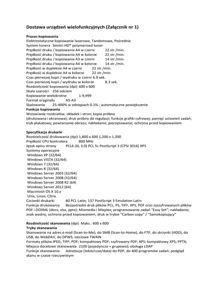 Dostawa urządzeń wielofunkcyjnych (Załącznik nr 1) Proces kopiowania Elektrostatyczne kopiowanie laserowe, Tandemowe, Pośrednie System tonera Simitri HD® polymerised toner Prędkość druku / kopiowania A4 w czerni 22 str./min. Prędkość druku / kopiowania A4 w kolorze 22 str./min. Prędkość druku / kopiowania A3 w czerni 14 str./min. Prędkość druku / kopiowania A4 w kolorze 14 str./min. Prędkość w dupleksie A4 w czerni 22 str./min. Prędkość w dupleksie A4 w kolorze 22 str./min. Czas pierwszej kopii / wydruku w czerni 6.9 sek. Czas pierwszej kopii / wydruku w kolorze 8.3 sek. Rozdzielczość kopiowania (dpi) 600 x 600 Skala szarości 256 odcieni Kopiowanie wielokrotne 1-9,999 Format oryginału A5-A3 Skalowanie 25-400% w odstępach 0.1% ; automatyczne powiększenie Funkcje kopiowania Wstawianie rozdziałów, okładek i stron; kopia próbna (drukowana i ekranowa); druk próbny do regulacji; funkcje grafiki cyfrowej; pamięć ustawień zadań; tryb plakatowy; powtarzanie obrazu; nakładanie; pieczętowanie; ochrona przed kopiowaniem Specyfikacja drukarki Rozdzielczość drukowania (dpi) 1,800 x 600 1,200 x 1,200 Prędkość CPU kontrolera 800 MHz Język opisu strony PCL6 (XL 3.0) PCL 5c PostScript 3 (CPSI 3016) XPS Systemy operacyjne Windows XP (32/64) Windows VISTA (32/64) Windows 7 (32/64) Windows 8 (32/64) Windows Server 2003 (32/64) Windows Server 2008 (32/64) Windows Server 2008 R2 (64) Windows Server 2012 (64) Macintosh OS X 10.x Unix, Linux, Citrix Czcionki drukarki 80 PCL Latin; 137 PostScript 3 Emulation Latin Funkcje drukowania Bezpośredni druk plików PCL, PS, TIFF, XPS, PDF oraz zaszyfrowanych plików PDF i OOXML (docx, xlsx, pptx); Mixmedia i Mixplex; programowanie zadań "Easy Set”; nakładanie; znak wodny; ochrona przed kopiowaniem, druk w trybie "Carbon copy” / "Samokopiujący” Rozdzielczość skanowania (dpi) Maks.: 600 x 600 Tryby skanowania Skanowanie na adres e-mail (Scan-to-Me), do SMB (Scan-to-Home), do FTP, do skrzynki (HDD), do USB, do WebDAV, do DPWS, sieciowe TWAIN Formaty plików JPEG; TIFF; PDF; kompaktowy PDF; szyfrowany PDF; XPS; kompaktowy XPS; PPTX; Miejsca docelowe skanowania 2100 (pojedynczo + grupowo); obsługa LDAP Funkcje skanowania Adnotacje (tekst/czas/data) do PDF; do 400 programów zadań; podgląd skanu w czasie rzeczywistym SYSTEM Standardowa pamięć systemu (MB) 2,048 Standardowy dysk twardy (GB) 250 Standardowe interfejsy 10-Base-T/100-Base-T/1,000-Base-T Ethernet USB 2.0 Protokoły sieciowe TCP/IP (IPv4 / IPv6); IPX/SPX; NetBEUI; AppleTalk (EtherTalk); SMB; LPD; IPP; SNMP; HTTP Rodzaje ramek Ethernet 802.2; Ethernet 802.3; Ethernet II; Ethernet SNAP Automatyczny (duplex) podajnik dokumentów Do 100 oryginałów; A6-A3; 35-163 g/m² Rozmiar papieru A6-SRA3, własny format papieru; Gramatura papieru (g/m²) 52-300 g/m² Pojemność papieru (arkusze) Standardowa: 1,150 Standardowe podajniki papieru Taca 1: 500 arkuszy, A5-A3, 52-256 g/m² Taca 2: 500 arkuszy, A5-SRA3, 52-256 g/m² Podajnik ręczny: 150 arkuszy, A6-SRA3, własny format, Kaseta o dużej pojemności: 2,500 arkuszy, A4, 52-256 g/m² Automatyczny dupleks A5-SRA3; 52-256 g/m²