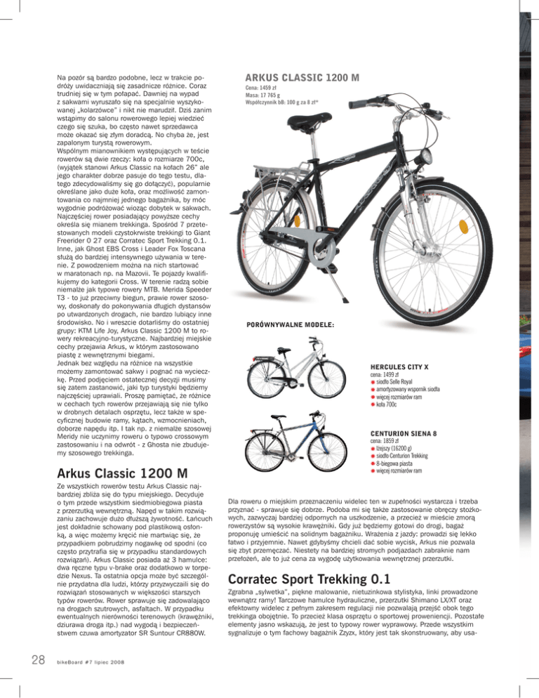 Na pozór są bardzo podobne, lecz w trakcie podróży uwidaczniają się zasadnicze różnice. Coraz trudniej się w tym połapać. Dawniej na wypad z sakwami wyruszało się na specjalnie wyszykowanej „kolarzówce” i nikt nie marudził. Dziś zanim wstąpimy do salonu rowerowego lepiej wiedzieć czego się szuka, bo często nawet sprzedawca może okazać się złym doradcą. No chyba że, jest zapalonym turystą rowerowym. Wspólnym mianownikiem występujących w teście rowerów są dwie rzeczy: koła o rozmiarze 700c, (wyjątek stanowi Arkus Classic na kołach 26” ale jego charakter dobrze pasuje do tego testu, dlatego zdecydowaliśmy się go dołączyć), popularnie określane jako duże koła, oraz możliwość zamontowania co najmniej jednego bagażnika, by móc wygodnie podróżować wioząc dobytek w sakwach. Najczęściej rower posiadający powyższe cechy określa się mianem trekkinga. Spośród 7 przetestowanych modeli czystokrwiste trekkingi to Giant Freerider 0 27 oraz Corratec Sport Trekking 0.1. Inne, jak Ghost EBS Cross i Leader Fox Toscana służą do bardziej intensywnego używania w terenie. Z powodzeniem można na nich startować w maratonach np. na Mazovii. Te pojazdy kwalifikujemy do kategorii Cross. W terenie radzą sobie niemalże jak typowe rowery MTB. Merida Speeder T3 - to już przeciwny biegun, prawie rower szosowy, doskonały do pokonywania długich dystansów po utwardzonych drogach, nie bardzo lubiący inne środowisko. No i wreszcie dotarliśmy do ostatniej grupy: KTM Life Joy, Arkus Classic 1200 M to rowery rekreacyjno-turystyczne. Najbardziej miejskie cechy przejawia Arkus, w którym zastosowano piastę z wewnętrznymi biegami. Jednak bez względu na różnice na wszystkie możemy zamontować sakwy i pognać na wycieczkę. Przed podjęciem ostatecznej decyzji musimy się zatem zastanowić, jaki typ turystyki będziemy najczęściej uprawiali. Proszę pamiętać, że różnice w cechach tych rowerów przejawiają się nie tylko w drobnych detalach osprzętu, lecz także w specyficznej budowie ramy, kątach, wzmocnieniach, doborze napędu itp. I tak np. z niemalże szosowej Meridy nie uczynimy roweru o typowo crossowym zastosowaniu i na odwrót - z Ghosta nie zbudujemy szosowego trekkinga. Arkus Classic 1200 M Ze wszystkich rowerów testu Arkus Classic najbardziej zbliża się do typu miejskiego. Decyduje o tym przede wszystkim siedmiobiegowa piasta z przerzutką wewnętrzną. Napęd w takim rozwiązaniu zachowuje dużo dłuższą żywotność. Łańcuch jest dokładnie schowany pod plastikową osłonką, a więc możemy kręcić nie martwiąc się, że przypadkiem pobrudzimy nogawkę od spodni (co często przytrafia się w przypadku standardowych rozwiązań). Arkus Classic posiada aż 3 hamulce: dwa ręczne typu v-brake oraz dodatkowo w torpedzie Nexus. Ta ostatnia opcja może być szczególnie przydatna dla ludzi, którzy przyzwyczaili się do rozwiązań stosowanych w większości starszych typów rowerów. Rower sprawuje się zadowalająco na drogach szutrowych, asfaltach. W przypadku ewentualnych nierówności terenowych (krawężniki, dziurawa droga itp.) nad wygodą i bezpieczeństwem czuwa amortyzator SR Suntour CR880W. 28 bi k eB oar d #7 l i pi ec 2008 ARKUS CLASSIC 1200 M Cena: 1459 zł Masa: 17 765 g Współczynnik bB: 100 g za 8 zł* PORÓWNYWALNE MODELE: HERCULES CITY X cena: 1499 zł siodło Selle Royal amortyzowany wspornik siodła więcej rozmiarów ram koła 700c CENTURION SIENA 8 cena: 1859 zł lżejszy (16200 g) siodło Centurion Trekking 8-biegowa piasta więcej rozmiarów ram Dla roweru o miejskim przeznaczeniu widelec ten w zupełności wystarcza i trzeba przyznać - sprawuje się dobrze. Podoba mi się także zastosowanie obręczy stożkowych, zazwyczaj bardziej odpornych na uszkodzenie, a przecież w mieście zmorą rowerzystów są wysokie krawężniki. Gdy już będziemy gotowi do drogi, bagaż proponuję umieścić na solidnym bagażniku. Wrażenia z jazdy: prowadzi się lekko łatwo i przyjemnie. Nawet gdybyśmy chcieli dać sobie wycisk, Arkus nie pozwala się zbyt przemęczać. Niestety na bardziej stromych podjazdach zabraknie nam przełożeń, ale to już cena za wygodę użytkowania wewnętrznej przerzutki. Corratec Sport Trekking 0.1 Zgrabna „sylwetka”, piękne malowanie, nietuzinkowa stylistyka, linki prowadzone wewnątrz ramy! Tarczowe hamulce hydrauliczne, przerzutki Shimano LX/XT oraz efektowny widelec z pełnym zakresem regulacji nie pozwalają przejść obok tego trekkinga obojętnie. To przecież klasa osprzętu o sportowej proweniencji. Pozostałe elementy jasno wskazują, że jest to typowy rower wyprawowy. Przede wszystkim sygnalizuje o tym fachowy bagażnik Zzyzx, który jest tak skonstruowany, aby usa-