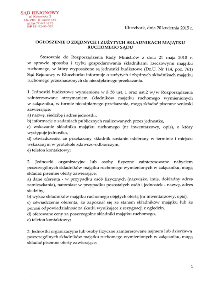 SĄD R E J O N O W Y ul. Katowicka 2 46-200 Kluczbork tel./fax 77 447 16 73 Kluczbork, dnia 20 kwietnia 2015 r. NIP 751-12-90-362 OGŁOSZENIE O ZBĘDNYCH I ZUŻYTYCH SKŁADNIKACH MAJĄTKU R U C H O M E G O SĄDU Stosownie do Rozporządzenia Rady Ministrów z dnia 21 maja 2010 r. w sprawie sposobu i trybu gospodarowania składnikami rzeczowymi majątku rucłiomego, w który wyposażone są jednostki budżetowe (Dz.U. N r 114, poz. 761) Sąd Rejonowy w Kluczborku informuje o zużytych i zbędnych składnikach majątku ruchomego przeznaczonych do nieodpłatnego przekazarua. 1. Jednostki budżetowe wymienione w § 38 ust. 1 oraz ust.2 w / w Rozporządzenia zainteresowane otrzymaniem składników majątku ruchomego wymienionych w załączniku, w formie nieodpłatnego przekazania, mogą składać pisemne wnioski zawierające: a) nazwę, siedzibę i adres jednostki, b) informacje o zadaniach publicznych realizowanych przez jednostkę, c) wskazanie składnika majątku ruchomego (nr inwentarzowy, opis), o który występuje jednostka, d) oświadczenie, ze przekazany składnik zostanie odebrany w terminie i miejscu wskazanym w protokole zdawczo-odbiorczym, e) telefon kontaktowy; 2. Jednostki organizacyjne lub osoby fizyczne zainteresowane nabyciem poszczególnych składników majątku ruchomego wymienionych w załączniku, mogą składać pisemne oferty zawierające: a) dane oferenta - w przypadku osób fizycznych (nazwisko, imię, dokładny adres zamieszkania), natomiast w przypadku pozostałych osób i jednostek - nazwę, adres siedziby, b) wykaz składników majątku ruchomego objętych ofertą (nr inwentarzowy, opis), c) oświadczenie oferenta, że zapoznał się ze stanem składników majątku l u b że ponosi odpowiedzialność za skutki wynikające z rezygnacji z oględzin, d) oferowane ceny za poszczególne składniki majątku ruchomego, e) telefon kontaktowy; 3. Jednostki organizacyjne lub osoby fizyczne zainteresowane najmem lub dzierżawą poszczególnych składników majątku ruchomego wymienionych w załączniku, mogą składać pisemne oferty zawierające: 1 a) dane oferenta - w przypadku osób fizycznych (nazwisko, imię, dokładny adres zamieszkania), natomiast w przypadku pozostałych osób i jednostek - nazwę, adres siedziby, b) wykaz składników majątku ruchomego objętych ofertą (nr inwentarzowy, opis), c) oświadczenie oferenta, że zapoznał się ze stanem składników majątku l u b że ponosi odpowiedzialność za skutki wynikające z rezygnacji z oględzin, d) telefon kontaktowy; 4. Jednostki wymienione w § 39 ust. 1 w / w Rozporządzenia zainteresowane nabyciem w formie darowizny składników majątku ruchomego wymienionych w załączniku, mogą składać pisemne wnioski zawierające: a) nazwę, siedziby i adres jednostki, b) stahit, c) informację o zadaniach publicznych realizowanych przez jednostkę, d) wskazanie składnika majątku ruchomego (nr inwentarzowy, opis), o który występuje jednostka, e) uzasadnienie potrzeb i sposobu wykorzystania składnika majątku ruchomego, f) zobowiązanie do pokrycia kosztów związanych z darowizną, w t y m kosztów odbioru przedmiotu darowizny, g) telefon kontaktowy. Wnioski o których mowa powyżej należy kierować do Dyrektora Sądu Rejonowego w Kluczborku. Wnioski należy składać osobiście l u b za pośrednictwem poczty (decyduje data wpływu) do dnia 04.05.2015 r. do godz. 15.30 do Dyrektora Sądu Rejonowego w Kluczborku, ul. Katowicka 2,46-200 Kluczbork, pokój 52. Zagospodarowanie zbędnych lub zużytych składników majątku ruchomego Sądu odbywa się poprzez: 1) nieodpłatne przekazanie i n n y m jednostkom budżetowym, 2) nieodpłatne przekazanie jednostkom samorządu terytorialnego, 3) sprzedaż, o ile nie dojdzie do skutku zagospodarowanie składników w sposób określony w pkt 1-2; 4) najem lub dzierżawę o ile nie dojdzie do skutku zagospodarowanie składników w sposób określony w pkt.1-3. 5) zbycie w formie darowizny, o ile nie dojdzie do skutku zagospodarowanie składników w sposób określony w pkt.1-4. Zbędne lub zużyte składniki rzeczowe majątku ruchomego, niezagospodarowane w sposób o którym mowa w pkt. 1-5 mogą zostać zlikwidowane. 2 Składniki majątku można oglądać w Sądzie Rejonowym w Kluczborku, u l . Katowicka 2, 46-200 Kluczbork w godzinach od 9.00 do 14.00 w terminie od 21.04.2015 r. do dnia 04.05.2015 r., po wcześniejszym uzgodnieniu telefonicznym. Osobą upoważnioną do kontaktów w sprawie zapoznania się ze stanem przedmiotów oraz do kontaktów w sprawie wniosków jest Pani Barbara Safian (pok. 52) tel.77 4471669 wew. 1 . W przypadku gdy co najmniej dwie jednostki wymienione w § 38 ust. 1 oraz ust.2 w/w o Rozporządzenia, przydziale składnika będą zainteresowane majątku ruchomego nieodpłatnym decyduje przekazaniem, kolejność wpłynięcia wniosków do sekretariatu Dyrektora Sądu Rejonowego w Kluczborku oraz analiza potrzeb podmiotu wnioskującego. W przypadku gdy co najmniej dwie jednostki wymienione w § 39 ust. 1 w / w Rozporządzenia, będą zainteresowane nabyciem w formie darowizny, o przydziale składnika majątku ruchomego decyduje kolejność wpłynięcia wniosków do sekretariatu Dyrektora Sądu Rejonowego w Kluczborku oraz analiza potrzeb podmiotu wnioskującego. W przypadku gdy co najmniej dwóch oferentów zaproponuje tą sama cenę za dany składnik majątku ruchomego pomiędzy tymi oferentami Sąd przeprowadzi dodatkową aukcję. Szczegółowy wykaz zbędnych i zużytych składników majątku ruchomego zawiera załącznik nr 1 . DYREKTOR SąduJ^jonowego w Kluczborku 3