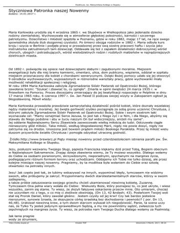 Parafia pw. św. Maksymiliana Kolbego w Słupsku Styczniowa Patronka naszej Nowenny dodano: 14.01.2017 r. Maria Karłowska urodziła się 4 września 1865 r. we Słupówce w Wielkopolsce jako jedenaste dziecko rodziny ziemiańskiej. Wychowywała się w atmosferze głębokiej pobożności, karności i szczerego patriotyzmu. Dzieciństwo i młodość spędziła w Poznaniu, gdzie w roku 1882, mając 17 lat, na ręce swego spowiednika złożyła ślub dozgonnej czystości. Po śmierci obojga rodziców w 1882 r. Maria odbyła kurs kroju i szycia w Berlinie i podjęła pracę w prowadzonej przez swą siostrę pracowni haftu i szycia jako instruktorka zatrudnionych tam dziewcząt. Oddawała się też z zapałem działalności dobroczynnej wśród chorych, ubogich i potrzebujących, wśród wielodzietnych rodzin i rozbitych małżeństw w najnędzniejszych dzielnicach miasta. Od 1892 r. poświęciła się opiece nad dziewczętami słabymi i zagubionymi moralnie. Miejscem ewangelizacji były dla niej bramy kamienic, cmentarz, ulica, dom publiczny, więzienie, oddział w szpitalu miejskim przeznaczony dla kobiet z chorobami wenerycznymi. Dzięki Bożej pomocy udało się jej otworzyć 9 ośrodków wychowawczych, wyposażonych w różnorodne warsztaty pracy, gdzie wychowanki miały możliwość rehabilitacji społecznej i religijnej. W roku 1894 Maria Karłowska założyła Zgromadzenie Sióstr Pasterek od Opatrzności Bożej, którego zawołanie brzmi: "Szukać i zbawiać to, co zginęło". Zmarła w opinii świętości 24 marca 1935 r. w Pniewitem na Pomorzu. Proces diecezjalny zmierzający do jej beatyfikacji rozpoczęto w Pelplinie w dniu 17 marca 1965 roku. 6 czerwca 1997 r. św. Jan Paweł II podczas swojej wizyty w Zakopanem ogłosił ją błogosławioną. Mówił wtedy: Maria Karłowska prowadziła prawdziwie samarytańską działalność pośród kobiet, które doznały wszelakiej nędzy materialnej i moralnej. Jej święta gorliwość szybko pociągnęła za sobą grono uczennic Chrystusa, z którymi założyła Zgromadzenie Sióstr Pasterek od Opatrzności Bożej. Sobie i swym siostrom taki wyznaczała cel: "Mamy oznajmiać Serce Jezusa, to jest tak z Niego żyć i w Nim, i dla Niego, abyśmy się stawały do Niego podobne i aby w życiu naszym On był widoczniejszy, aniżeli my same". Jej oddanie Najświętszemu Sercu Zbawiciela zaowocowało wielką miłością do ludzi. Odczuwała ciągle nienasycony głód miłości. Taka miłość, według błogosławionej Marii, nigdy nie powie dosyć, nigdy nie zatrzyma się na drodze. Unoszona jest bowiem prądem miłości Boskiego Parakleta. Przez tę miłość wielu duszom przywróciła światło Chrystusa i pomogła odzyskać utraconą godność. Źródło:http://www.brewiarz.pl Piąty miesiąc nowenny przed czterdziestoleciem istnienia parafii pw. Św. Maksymiliana Kolbego w Słupsku. Jezu, posłuszni wezwaniu Twojego Sługi, papieża Franciszka klękamy dziś przed Tobą, Bogiem obecnym w Najświętszym Sakramencie. Znając dzieje zbawienia wiemy, że Ty możesz wszystko. Dlatego wołamy do Ciebie za osobami poranionymi, skrzywdzonymi, nieporadnymi, spychanymi na margines życia, podlegającymi różnym formom terroru oraz uchodźcami. Oddajemy ich Tobie nie tylko dzisiaj, ale przez kolejne miesiące naszej nowenny. Pragniemy, by ta modlitwa była wołaniem do Ciebie oraz szkołą otwartości na potrzeby innych. Jezu! Jak często jest tak, że lubimy wskazywać na innych, wypominać błędy, tymczasem nie widzimy swoich, albo próbujemy je zakryć. Przypominamy dwóch starotestamentalnych starców, którzy w swoim zaślepieniu, a także próbie zatuszowania swojego grzechu chcieli ukamienować niewinną kobietę, Zuzannę. Tymczasem Ona pełna wiary wołała do Ciebie: Wiekuisty Boże, który poznajesz to, co jest ukryte, i wiesz wszystko, zanim się stanie. Ty wiesz, że złożyli fałszywe oskarżenie przeciw mnie. Oto umieram, chociaż nie uczyniłam nic z tego, o co mię ci złośliwie obwiniają. (Dn 13, 42 – 43). Posłańcem Twojej woli stał się Prorok Daniel, który zawołał głośno: Jestem czysty od jej krwi! Czy tak bardzo jesteście nierozumni, synowie Izraela, że skazujecie córkę izraelską bez dochodzenia i pewności? ( por. Dn 13, 46;48). Uratował niewinną krew, a tym dwom starcom wykazał ich niegodziwość. Panie, ta scena uczy nas, że Tylko Ty jesteś jedynym sprawiedliwym Sędzią, a my nie powinniśmy sądzić, zwłaszcza tych zepchniętych na margines życia. Ty wiesz, że potrzeba nam Twojego Ducha dlatego wołamy za Psalmistą: Jak łania pragnie wody ze strumieni, http://kolbe.slupsk.pl Kreator PDF Utworzono 4 March, 2017, 08:24 Parafia pw. św. Maksymiliana Kolbego w Słupsku tak dusza moja pragnie Ciebie, Boże! Dusza moja pragnie Boga, Boga żywego: kiedyż więc przyjdę i ujrzę oblicze Boże? Łzy stały się dla mnie chlebem we dnie i w nocy, gdy mówią mi co dzień: «Gdzie jest twój Bóg?» Gdy wspominam o tym, rozrzewnia się dusza moja we mnie, ponieważ wstępowałem do przedziwnego namiotu, do domu Bożego, wśród głosów radości i dziękczynienia w świątecznym orszaku. Czemu jesteś zgnębiona, moja duszo, i czemu jęczysz we mnie? Ufaj Bogu, bo jeszcze Go będę wysławiać. (Ps 42, 2 - 6). «Szukać i zbawiać to, co zginęło», w myśl zasady: «Warto być pasterką, aby choć jednej duszy pomóc do zbawienia» - te słowa dojrzały w myśli i sercu, bł. Marii Karłowskiej, założycielki Zgromadzenia Sióstr Pasterek od Opatrzności Bożej. Dojrzały, bo doświadczyły Ciebie, Boga Żywego oraz nakazały bł. Marii prowadzić samarytańską działalność pośród kobiet dotkniętych nędzą materialną i moralną. Założycielka Zgromadzenia Sióstr Pasterek od Opatrzności Bożej sobie i siostrom wyznaczała cel: «Mamy oznajmiać Serce Jezusa, to jest tak z Niego żyć i w Nim, i dla Niego, abyśmy się stawały do Niego podobne i aby w życiu naszym On był widoczniejszy aniżel