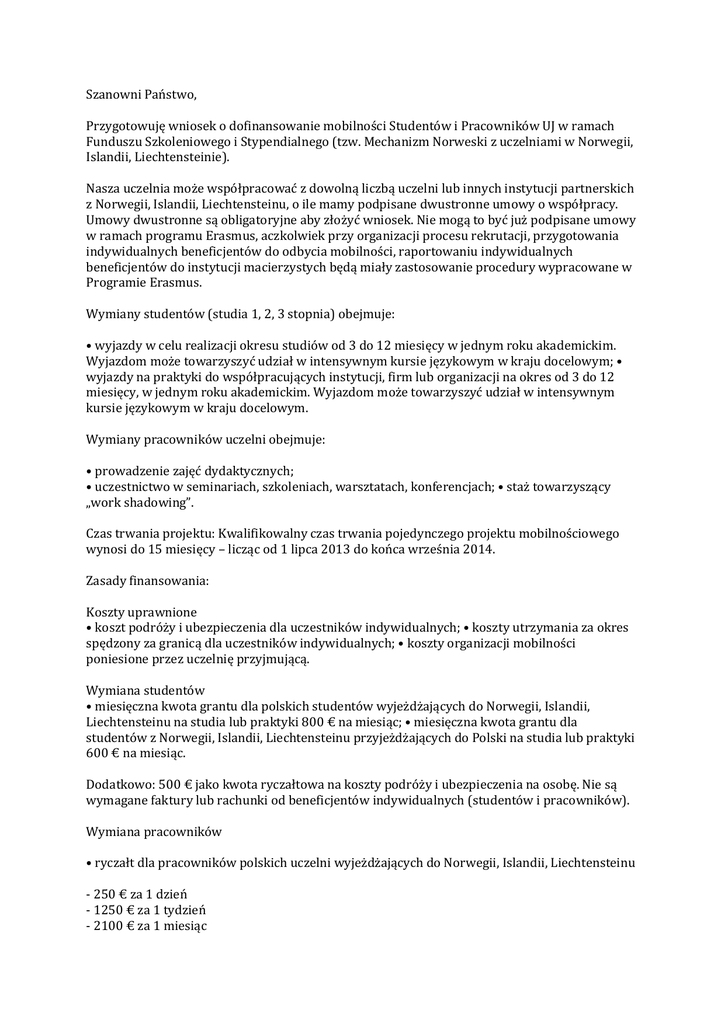 Szanowni Państwo, Przygotowuję wniosek o dofinansowanie mobilności Studentów i Pracowników UJ w ramach Funduszu Szkoleniowego i Stypendialnego (tzw. Mechanizm Norweski z uczelniami w Norwegii, Islandii, Liechtensteinie). Nasza uczelnia może współpracować z dowolną liczbą uczelni lub innych instytucji partnerskich z Norwegii, Islandii, Liechtensteinu, o ile mamy podpisane dwustronne umowy o współpracy. Umowy dwustronne są obligatoryjne aby złożyć wniosek. Nie mogą to być już podpisane umowy w ramach programu Erasmus, aczkolwiek przy organizacji procesu rekrutacji, przygotowania indywidualnych beneficjentów do odbycia mobilności, raportowaniu indywidualnych beneficjentów do instytucji macierzystych będą miały zastosowanie procedury wypracowane w Programie Erasmus. Wymiany studentów (studia 1, 2, 3 stopnia) obejmuje: • wyjazdy w celu realizacji okresu studiów od 3 do 12 miesięcy w jednym roku akademickim. Wyjazdom może towarzyszyć udział w intensywnym kursie językowym w kraju docelowym; • wyjazdy na praktyki do współpracujących instytucji, firm lub organizacji na okres od 3 do 12 miesięcy, w jednym roku akademickim. Wyjazdom może towarzyszyć udział w intensywnym kursie językowym w kraju docelowym. Wymiany pracowników uczelni obejmuje: • prowadzenie zajęć dydaktycznych; • uczestnictwo w seminariach, szkoleniach, warsztatach, konferencjach; • staż towarzyszący „work shadowing”. Czas trwania projektu: Kwalifikowalny czas trwania pojedynczego projektu mobilnościowego wynosi do 15 miesięcy – licząc od 1 lipca 2013 do końca września 2014. Zasady finansowania: Koszty uprawnione • koszt podróży i ubezpieczenia dla uczestników indywidualnych; • koszty utrzymania za okres spędzony za granicą dla uczestników indywidualnych; • koszty organizacji mobilności poniesione przez uczelnię przyjmującą. Wymiana studentów • miesięczna kwota grantu dla polskich studentów wyjeżdżających do Norwegii, Islandii, Liechtensteinu na studia lub praktyki 800 € na miesiąc; • miesięczna kwota grantu dla studentów z Norwegii, Islandii, Liechtensteinu przyjeżdżających do Polski na studia lub praktyki 600 € na miesiąc. Dodatkowo: 500 € jako kwota ryczałtowa na koszty podróży i ubezpieczenia na osobę. Nie są wymagane faktury lub rachunki od beneficjentów indywidualnych (studentów i pracowników). Wymiana pracowników • ryczałt dla pracowników polskich uczelni wyjeżdżających do Norwegii, Islandii, Liechtensteinu - 250 € za 1 dzień - 1250 € za 1 tydzień - 2100 € za 1 miesiąc • ryczałt dla pracowników uczelni z Norwegii, Islandii, Liechtensteinu przyjeżdżających do Polski: - 150 € za 1 dzień - 750 € za 1 tydzień - 1250 € za 1 miesiąc Dodatkowo: 500 € jako kwota ryczałtowa na koszty podróży i ubezpieczenia na osobę. Nie są wymagane faktury lub rachunki od beneficjentów indywidualnych (studentów i pracowników). Uprzejmie proszę jednostki UJ zainteresowane wymianą Studentów i Pracowników w ramach Funduszu Szkoleniowego i Stypendialnego (tzw. Mechanizm Norweski) o przekazanie najpóźniej do 8 kwietnia 2013 na adres: [email protected] 1. Nazwy uczelni partnerskiej, z którą planowana jest wymiana (moża to być uczelnia, z którą mamy podpisaną umowę programu Erasmus) 2. Danych osoby kontaktowej uczelni partnerskiej, z którą planowana jest wymiana (imię nazwisko, tytuł naukowy, jednostka organizacyjna uczelni, adres emailowy) 3. Kod erasmusowy dyscypliny, w ramach której planowana jest wymiana (jak w umowach erasmusowych) 4. Planowana liczba studentów (wyjazdy i przyjazdy) 5. Planowana liczba pracowników (wyjazdy i przyjazdy) Po otrzymaniu danych przygotuję umowy dwustronne podpisywane na bieżąco przez Prof. Stanisława Kistryna, Prorektora ds. badań naukowych i funduszy strukturalnych UJ a następnie złożę wniosek do Fundacji Rozwoju Systemu Edukacji tzw. Operatora Funduszu Szkoleniowego i Stypendialnego w Warszawie. W razie dalszych pytań proszę o kontakt, najlepiej telefoniczny, ewentualnie mailowy. Z poważaniem, Mirosław Klimkiewicz Uniwersytet Jagielloński Koordynator Programu Erasmus Koordynator Funduszu Szkoleniowego i Stypendialnego Gołębia 24, 31-007 Kraków T: +48-12-663 1106 F: +48-12-663 1545