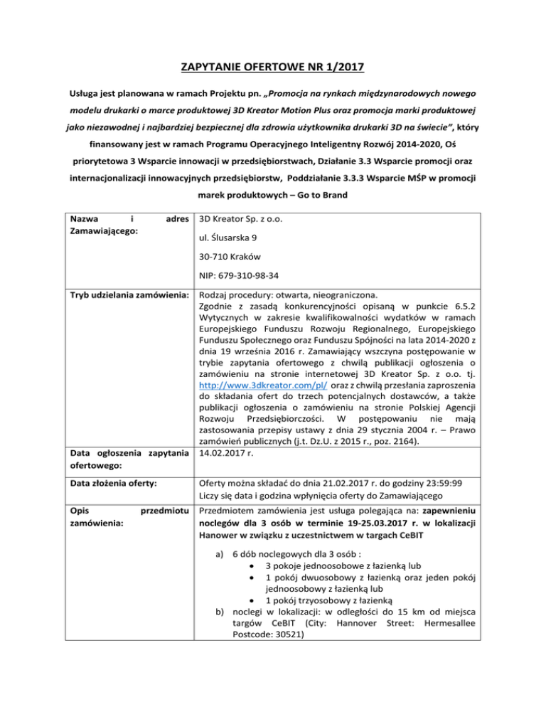 ZAPYTANIE OFERTOWE NR 1/2017 Usługa jest planowana w ramach Projektu pn. „Promocja na rynkach międzynarodowych nowego modelu drukarki o marce produktowej 3D Kreator Motion Plus oraz promocja marki produktowej jako niezawodnej i najbardziej bezpiecznej dla zdrowia użytkownika drukarki 3D na świecie”, który finansowany jest w ramach Programu Operacyjnego Inteligentny Rozwój 2014-2020, Oś priorytetowa 3 Wsparcie innowacji w przedsiębiorstwach, Działanie 3.3 Wsparcie promocji oraz internacjonalizacji innowacyjnych przedsiębiorstw, Poddziałanie 3.3.3 Wsparcie MŚP w promocji marek produktowych – Go to Brand Nazwa i Zamawiającego: adres 3D Kreator Sp. z o.o. ul. Ślusarska 9 30-710 Kraków NIP: 679-310-98-34 Tryb udzielania zamówienia: Rodzaj procedury: otwarta, nieograniczona. Zgodnie z zasadą konkurencyjności opisaną w punkcie 6.5.2 Wytycznych w zakresie kwalifikowalności wydatków w ramach Europejskiego Funduszu Rozwoju Regionalnego, Europejskiego Funduszu Społecznego oraz Funduszu Spójności na lata 2014-2020 z dnia 19 września 2016 r. Zamawiający wszczyna postępowanie w trybie zapytania ofertowego z chwilą publikacji ogłoszenia o zamówieniu na stronie internetowej 3D Kreator Sp. z o.o. tj. http://www.3dkreator.com/pl/ oraz z chwilą przesłania zaproszenia do składania ofert do trzech potencjalnych dostawców, a także publikacji ogłoszenia o zamówieniu na stronie Polskiej Agencji Rozwoju Przedsiębiorczości. W postępowaniu nie mają zastosowania przepisy ustawy z dnia 29 stycznia 2004 r. – Prawo zamówień publicznych (j.t. Dz.U. z 2015 r., poz. 2164). Data ogłoszenia zapytania 14.02.2017 r. ofertowego: Data złożenia oferty: Opis zamówienia: Oferty można składać do dnia 21.02.2017 r. do godziny 23:59:99 Liczy się data i godzina wpłynięcia oferty do Zamawiającego przedmiotu Przedmiotem zamówienia jest usługa polegająca na: zapewnieniu noclegów dla 3 osób w terminie 19-25.03.2017 r. w lokalizacji Hanower w związku z uczestnictwem w targach CeBIT a) 6 dób noclegowych dla 3 osób : 3 pokoje jednoosobowe z łazienką lub 1 pokój dwuosobowy z łazienką oraz jeden pokój jednoosobowy z łazienką lub 1 pokój trzyosobowy z łazienką b) noclegi w lokalizacji: w odległości do 15 km od miejsca targów CeBIT (City: Hannover Street: Hermesallee Postcode: 30521) c) nocleg w hotelu o standardzie maksymalnie na poziomie 3* ze śniadaniem; d) z opcją darmowego Wi-Fi Kod CPV: 55110000-4 - Hotelarskie usługi noclegowe Cel zamówienia Warunki udziału postępowaniu Celem zamówienia jest zapewnienie usług noclegowych w związku z uczestnictwem w targach CeBIT w Hanowerze w 1. Z udziału w postępowaniu wykluczone są podmioty powiązane osobowo i kapitałowo z Zamawiającym. Przez powiązania kapitałowe lub osobowe rozumie się wzajemne powiązania między zamawiającym lub osobami upoważnionymi do zaciągania zobowiązań w mieniu zamawiającego lub osobami wykonującymi w imieniu zamawiającego czynności związane z przygotowaniem i przeprowadzaniem procedury wyboru wykonawcy, a wykonawcą, polegające w szczególności na: 1) uczestniczeniu w spółce, jako wspólnik spółki cywilnej lub spółki osobowej, 2) posiadaniu udziałów lub co najmniej 5 % akcji, 3) pełnieniu funkcji członka organu nadzorczego lub zarządzającego, prokurenta, pełnomocnika, 4) pozostawaniu w takim stosunku prawnym lub faktycznym, który może budzić uzasadnione wątpliwości, co do bezstronności w wyborze wykonawcy, w szczególności pozostawanie w związku małżeńskim, w stosunku pokrewieństwa lub powinowactwa w linii prostej, pokrewieństwa lub powinowactwa w linii bocznej do drugiego stopnia lub w stosunku przysposobienia, opieki lub kurateli Ocena zostanie dokonana na podstawie złożonych ofert poprzez określenie zgodnie z zasadą: 1 – spełnienie kryterium; 0 -nie spełnienie kryterium Harmonogram realizacji: Od dn. 19.03.2017 r. do dn. 25.03.2017 r. Dodatkowe warunki 1. Zamawiający zastrzega sobie prawo do zmiany treści niniejszego zapytania. Jeżeli zmiany będą mogły mieć wpływ na treść składanych w postępowaniu ofert, Zamawiający przedłuży termin składania ofert. 2. Zamawiający zastrzega sobie prawo do unieważnienia niniejszego postępowania bez podania uzasadnienia, a także do pozostawienia postępowania bez wyboru oferty. 3. Zamawiający może wezwać w wyznaczonym przez siebie terminie do złożenia wyjaśnień lub uzupełnienia oferty. 4. Zamawiający nie dopuszcza możliwości składania ofert częściowych. Kryteria oceny oferty Wybór najkorzystniejszej oferty nastąpi w oparciu o następujące kryteria: 1) Cena (w PLN) - 70%, 2) Termin płatności (w dniach) – 30% Ocena ofert będzie dokonywana według następujących zasad: Ad. 1) Wartość punktowa kryterium cena będzie wyliczana według wzoru: (C min: C n) x 100 x 70% gdzie: C min - najniższa cena ogółem brutto spośród ofert nie odrzuconych C n - cena ogółem brutto ocenianej oferty gdzie 1 % = 1 pkt Ad. 2) Wartość punktowa kryterium termin płatności będzie wyliczany według wzoru: (T min: T n) x 100 x 30% gdzie: T min – najkrótszy termin płatności za usługę spośród ofert nieodrzuconych T n – termin płatności za usługę ocenianej oferty gdzie 1%=1 pkt Ad. 3) Ostateczna ocena oferty będzie wyliczana według wzoru: O=C+T gdzie: O – ostateczna ocena oferty C – wartość punktowa uzyskana przez badaną ofertę za kryterium cena, T - wartość punktowa uzyskana przez badaną ofertę za kryterium termin płatności. Oferta musi zawierać Ofertę należy przygotować w następujący sposób: następujące elementy a) Oferta musi mieć formę pisemną; b) Oferta powinna zawierać: Pełne dane identyfikujące oferenta (nazwa, adres, nr NIP, nr KRS/CEiDG), Datę przygotowania i termin ważności oferty Czas realizacji przedmiotu zamówienia Wartość zamówienia brutto, Warunki i termin płatności, Dane osoby do kontaktu (imię nazwisko,