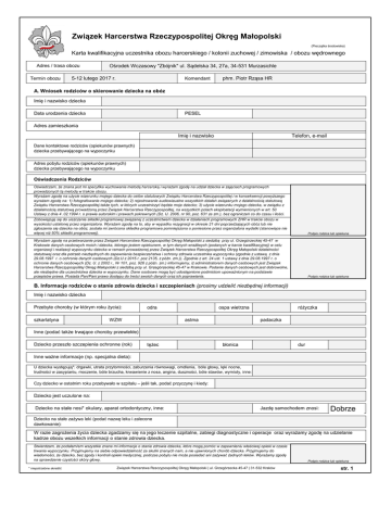 Związek Harcerstwa Rzeczypospolitej Okręg Małopolski (Pieczątka środowiska) Karta kwalifikacyjna uczestnika obozu harcerskiego / kolonii zuchowej / zimowiska / obozu wędrownego Adres / trasa obozu Termin obozu Ośrodek Wczasowy "Zbójnik" ul. Sądelska 34, 27a, 34-531 Murzasichle 5-12 lutego 2017 r. Komendant phm. Piotr Rząsa HR A. Wniosek rodziców o skierowanie dziecka na obóz Imię i nazwisko dziecka Data urodzenia dziecka PESEL Adres zamieszkania Imię i nazwisko Telefon, e-mail Dane kontaktowe rodziców (opiekunów prawnych) dziecka przebywającego na wypoczynku Adres pobytu rodziców (opiekunów prawnych) dziecka przebywającego na wypoczynku Oświadczenia Rodziców Oświadczam, że znana jest mi specyfika wychowania metodą harcerską i wyrażam zgodę na udział dziecka w zajęciach programowych prowadzonych tą metodą w trakcie obozu. Wyrażam zgodę na użycie wizerunku mojego dziecka do celów statutowych Związku Harcerstwa Rzeczypospolitej i w konsekwencji powyższego wyrażam zgodę na: 1) fotografowanie mojego dziecka; 2) rejestrowanie audiowizualne wszystkich działań związanych z działalnością statutową Związku Harcerstwa Rzeczypospolitej także tych, w których uczestniczyć będzie moje dziecko; 3) użycie wizerunku mojego dziecka, w związku z działalnością statutową prowadzoną przez Związek Harcerstwa Rzeczypospolitej, na wszystkich polach eksploatacji wymienionych w art. 50 Ustawy z dnia 4 .02.1994 r. o prawie autorskim i prawach pokrewnych (Dz. U. 2006, nr 90, poz. 631 ze zm.), bez ograniczeń co do czasu i ilości. Zobowiązuję się do uiszczenia składki programowej związanej z uczestnictwem dziecka w działaniach programowych ZHR w trakcie obozu w wysokości ustalonej przez organizatora. Wyrażam zgodę na to, aby w wypadku rezygnacji w okresie 21 dni poprzedzających obóz lub nie zgłoszenia się dziecka na obóz, została mi zwrócona składka programowa pomniejszona o poniesione przez organizatora wydatki (stanowiące nie więcej niż 50% składki programowej). Podpis rodzica lub opiekuna Wyrażam zgodę na przetwarzanie przez Związek Harcerstwa Rzeczypospolitej Okręg Małopolski z siedzibą przy ul. Grzegórzeckiej 45-47 w Krakowie danych osobowych moich i dziecka, którego jestem opiekunem, w tym danych wrażliwych (podanych w karcie kwalifikacyjnej) w celu organizacji i realizacji wypoczynku dziecka w ramach prowadzonej przez Związek Harcerstwa Rzeczypospolitej Okręg Małopolski działalności statutowej oraz dla potrzeb niezbędnych do zapewnienia bezpieczeństwa i ochrony zdrowia uczestnika wypoczynku (zgodnie z ustawą z dnia 29.08.1997 r. o ochronie danych osobowych (Dz.U z 2015 r. poz 2135, z późn. zm.)). Zgodnie z art. 24 ust. 1 ustawy z dnia 29.08.1997 r. o ochronie danych osobowych (Dz. U. z 2002 r., Nr 101, poz. 926 z późn. zm.) informujemy, iż administratorem danych osobowych jest Związek Harcerstwa Rzeczypospolitej Okręg Małopolski z siedzibą przy ul. Grzegórzeckiej 45-47 w Krakowie. Podanie danych osobowych jest dobrowolne, ale niezbędne dla uczestnictwa dziecka w wypoczynku. Dane osobowe mogą być udostępnione podmiotom upoważnionym na podstawie przepisów prawa. Posiada Pan/Pani prawo dostępu do treści swoich danych oraz ich poprawiania. Podpis rodzica lub opiekuna B. Informacje rodziców o stanie zdrowia dziecka i szczepieniach (prosimy udzielić niezbędnej informacji) Imię i nazwisko dziecka Przebyte choroby (w którym roku życia): szkarlatyna odra WZW różyczka ospa wietrzna astma padaczka Inne (podać także trwające choroby przewlekłe) Dziecko przeszło szczepienia ochronne (rok) tężec błonica dur Inne ważne informacje (np. specjalna dieta): U dziecka występują*: drgawki, utrata przytomności, zaburzenia równowagi, omdlenia, bóle głowy, lęki nocne, trudności w zasypianiu, moczenie, bóle brzucha, krwawienie z nosa, angina, duszności, bóle stawów, wymioty, inne: Czy dziecko w ostatnim roku przebywało w szpitalu – jeśli tak, podać przyczynę i kiedy: Dziecko jest uczulone na: Dziecko na stałe nosi* okulary, aparat ortodontyczny, inne: Jazdę samochodem znosi: dobrze / źle* Dobrze Dziecko na stałe zażywa leki (podać nazwę leku i zalecone dawkowanie): W razie zagrożenia życia dziecka zgadzamy się na jego leczenie szpitalne, zabiegi diagnostyczne i operacje oraz wyrażamy zgodę na udzielanie kadrze obozu wszelkich informacji o stanie zdrowia dziecka. Stwierdzam, że podałam/em wszystkie znane mi informacje o stanie zdrowia dziecka, które mogą pomóc w zapewnieniu właściwej opieki w czasie trwania wypoczynku. Przyjmujemy na siebie odpowiedzialność za skutki znanych nam, a nie ujawnionych chorób dziecka. Przyjmujemy do wiadomości, że dziecko, bez zgody i kontroli opieki medycznej, podczas pobytu nie może posiadać ani zażywać żadnych leków. Wyrażamy zgodę na sprawdzenie czystości skóry głowy. * niepotrzebne skreślić Związek Harcerstwa Rzeczypospolitej Okręg Małopolski | ul. Grzegórzecka 45-47 | 31-532 Kraków Podpis rodzica lub opiekuna str. 1 C. Pieczęć szkoły (obowiązkowo) pieczęć szkoły Informacja o specjalnych potrzebach wychowawczo-opiekuńczych uczestnika wypoczynku, w szczególności o potrzebach wynikających z niepełnosprawności, niedostosowania społecznego lub zagrożenia niedostosowaniem społecznym: Inne informacje dotyczące spraw wychowawczych: D. Istotne informacje Istnieją orzeczone przez Sąd ograniczenia prawne kontaktu dziecka z ………………………………. i wobec tego do wiadomości komendy obozu załączam kopię stosownego orzeczenia. TAK / NIE* NIE Inne: ……………….……………………………………………………………………………………………………………………………………………………………………………………………………… ……………….…………………………………………………………………………