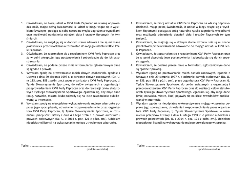 1. Oświadczam, że biorę udział w XXVI Perle Paprocan na własną odpowiedzialność, mając pełną świadomość, iż udział w biegu wiąże się z wysiłkiem fizycznym i pociąga za sobą naturalne ryzyko zagrożenia wypadkami oraz możliwość odniesienia obrażeń ciała i urazów fizycznych (w tym śmierci). 2. Oświadczam, że znajduję się w dobrym stanie zdrowia i nie są mi znane jakiekolwiek przeciwwskazania zdrowotne do mojego udziału w XXVI Perle Paprocan. 3. Oświadczam, że zapoznałem się z regulaminem XXVI Perły Paprocan oraz że w pełni akceptuję jego postanowienia i zobowiązuję się do ich przestrzegania. 4. Oświadczam, że podane przeze mnie w formularzu zgłoszeniowym dane są zgodne z prawdą. 5. Wyrażam zgodę na przetwarzanie moich danych osobowych, zgodnie z Ustawą z dnia 29 sierpnia 1997 r. o ochronie danych osobowych (Dz. U. nr 133, poz. 883 z późn. zm.), przez organizatora XXVI Perły Paprocan, tj. Tyskie Stowarzyszenie Sportowe, do celów związanych z organizacją i przeprowadzeniem XXVI Perły Paprocan oraz do realizacji celów statutowych Tyskiego Stowarzyszenia Sportowego. Zgadzam się, aby moje dane (imię, nazwisko, miasto, klub) pojawiły się na liście zawodników publikowanej w Internecie. 6. Wyrażam zgodę na nieodpłatne wykorzystywanie mojego wizerunku poprzez jego sporządzanie, utrwalanie i rozpowszechnianie przez organizatora XXVI Perły Paprocan, tj. Tyskie Stowarzyszenie Sportowe, w rozumieniu przepisów Ustawy z dnia 4 lutego 1994 r. o prawie autorskim i prawach pokrewnych (Dz. U. z 2014 r. poz. 121 z późn. zm.). Udzielam nieodpłatnej licencji na wykorzystanie mojego utrwalonego wizerunku. Tychy, .............................. .................................................... (podpis zawodnika) 1. Oświadczam, że biorę udział w XXVI Perle Paprocan na własną odpowiedzialność, mając pełną świadomość, iż udział w biegu wiąże się z wysiłkiem fizycznym i pociąga za sobą naturalne ryzyko zagrożenia wypadkami oraz możliwość odniesienia obrażeń ciała i urazów fizycznych (w tym śmierci). 2. Oświadczam, że znajduję się w dobrym stanie zdrowia i nie są mi znane jakiekolwiek przeciwwskazania zdrowotne do mojego udziału w XXVI Perle Paprocan. 3. Oświadczam, że zapoznałem się z regulaminem XXVI Perły Paprocan oraz że w pełni akceptuję jego postanowienia i zobowiązuję się do ich przestrzegania. 4. Oświadczam, że podane przeze mnie w formularzu zgłoszeniowym dane są zgodne z prawdą. 5. Wyrażam zgodę na przetwarzanie moich danych osobowych, zgodnie z Ustawą z dnia 29 sierpnia 1997 r. o ochronie danych osobowych (Dz. U. nr 133, poz. 883 z późn. zm.), przez organizatora XXVI Perły Paprocan, tj. Tyskie Stowarzyszenie Sportowe, do celów związanych z organizacją i przeprowadzeniem XXVI Perły Paprocan oraz do realizacji celów statutowych Tyskiego Stowarzyszenia Sportowego. Zgadzam się, aby moje dane (imię, nazwisko, miasto, klub) pojawiły się na liście zawodników publikowanej w Internecie. 6. Wyrażam zgodę na nieodpłatne wykorzystywanie mojego wizerunku poprzez jego sporządzanie, utrwalanie i rozpowszechnianie przez organizatora XXVI Perły Paprocan, tj. Tyskie Stowarzyszenie Sportowe, w rozumieniu przepisów Ustawy z dnia 4 lutego 1994 r. o prawie autorskim i prawach pokrewnych (Dz. U. z 2014 r. poz. 121 z późn. zm.). Udzielam nieodpłatnej licencji na wykorzystanie mojego utrwalonego wizerunku. Tychy, .............................. .................................................... (podpis zawodnika)