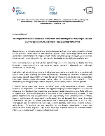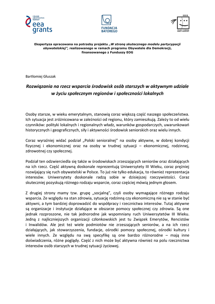 Ekspertyza opracowana na potrzeby projektu „W stronę skutecznego modelu partycypacji obywatelskiej”, realizowanego w ramach programu Obywatele dla Demokracji, finansowanego z Funduszy EOG Bartłomiej Głuszak Rozwiązania na rzecz wsparcia środowisk osób starszych w aktywnym udziale w życiu społecznym regionów i społeczności lokalnych Osoby starsze, w wieku emerytalnym, stanowią coraz większą część naszego społeczeństwa. Ich sytuacja jest zróżnicowana w zależności od regionu, który zamieszkują. Zależy to od wielu czynników: polityki lokalnych i regionalnych władz, warunków gospodarczych, uwarunkowań historycznych i geograficznych, siły i aktywności środowisk seniorskich oraz wielu innych. Coraz wyraźniej widać podział „Polski senioralnej” na osoby aktywne, w dobrej kondycji fizycznej i ekonomicznej oraz na osoby w trudnej sytuacji – ekonomicznej, rodzinnej, zdrowotnej czy społecznej. Podział ten odzwierciedla się także w środowiskach zrzeszających seniorów oraz działających na ich rzecz. Część aktywną doskonale reprezentują Uniwersytety III Wieku, coraz prężniej rozwijający się ruch obywatelski w Polsce. To już nie tylko edukacja, to również reprezentacja interesów. Uniwersytety doskonale radzą sobie w dzisiejszej rzeczywistości. Coraz skuteczniej pozyskują różnego rodzaju wsparcie, coraz częściej mówią jednym głosem. Z drugiej strony mamy tzw. grupę „socjalną”, czyli osoby wymagające różnego rodzaju wsparcia. Ze względu na stan zdrowia, sytuację rodzinną czy ekonomiczną nie są w stanie być aktywni, a tym bardziej doprowadzić do współpracy i rzecznictwa interesów. Tutaj aktywne są organizacje i instytucje działające w obszarze pomocy społecznej czy zdrowia. Są one jednak rozproszone, nie tak jednorodne jak wspomniany ruch Uniwersytetów III Wieku. Jedną z najliczniejszych organizacji członkowskich jest tu Związek Emerytów, Rencistów i Inwalidów. Ale jest też wiele podmiotów nie zrzeszających seniorów, a na ich rzecz działających, jak stowarzyszenia, fundacje, ośrodki pomocy społecznej, ośrodki kultury i wiele innych. Ze względu na swą specyfikę są one bardzo różnorodne – mają inne doświadczenia, różne poglądy. Część z nich może być aktywna również na polu rzecznictwa interesów osób starszych w trudnej sytuacji życiowej. Wspólnota Robocza Związków Organizacji Socjalnych WRZOS ze względu na swą misję i strukturę sytuuje się w obu grupach. Liczebnie przeważają organizacje działające na rzecz seniorów, choć związki członkowskie zrzeszają również organizacji seniorskie, w tym także Uniwersytety III Wieku. Potwierdza to przygotowany na zlecenie WRZOS w 2014 r. Raport Organizacje Senioralne WRZOS. WRZOS od dłuższego czasu pracuje w obszarze systemowych działań na rzecz osób starszych. Na poziomie regionalnym bardzo aktywne są organizacje członkowskie WRZOS. Inicjują i uczestniczą w tworzeniu regionalnych i lokalnych polityk senioralnych, jak np. Federacja Organizacji Senioralnych Województwa Warmińsko-Mazurskiego FOSa, która doprowadziła we współpracy z samorządem województwa do powstania polityki senioralnej województwa, jako drugiego już programu na rzecz osób starszych. Na poziomie ogólnopolskim WRZOS opracował standardy pracy socjalnej z osobami starszymi, prowadzi też debatę poświęconą polityce senioralnej i miejscu w niej organizacji pozarządowych. Z jednej strony debata ma charakter wewnętrzny – dyskusji organizacji członkowskich oraz pracy ekspertów WRZOS dot. modelowych rozwiązań, w naszej ocenie koniecznych do wprowadzenia. Z drugiej strony do debaty zapraszamy partnerów zewnętrznych, organizacje i instytucje zainteresowane tematyką senioralną. W 2013 r. przeprowadziliśmy cykl seminariów dyskusyjnych w województwach oraz debaty ogólnopolskie. Uczestniczyło w nich kilkuset przedstawicieli organizacji i instytucji działających na rzecz seniorów, w tym wielu liderów środowisk seniorskich. Zebraliśmy też dwanaście raportów dotyczących udziału osób 60+ w życiu publicznym województw kujawsko-pomorskiego, lubelskiego, lubuskiego, małopolskiego, mazowieckiego, opolskiego, pomorskiego, śląskiego, dolnośląskiego, wielkopolskiego, warmińsko-mazurskiego, zachodniopomorskiego. W oparciu o zebrane dane oraz wyniki dyskusji, WRZOS równolegle do debaty w wymiarze regionalnym i ogólnopolskim, prowadzi zaawansowaną debatę wewnętrzną, angażującą nasze organizacje członkowskie oraz ekspertów. Mamy świadomość, iż podniesienie jakości życia osób starszych wymaga zaangażowania nie tylko ze strony administracji publicznej, ale również obywatelskiego, w tym organizacji pozarządowych. Zrzeszając organizacje socjalne, chcemy uczestniczyć w tym procesie w sposób świadomy i przemyślany. Efektem naszej dyskusji jest przekonanie, że organizacje socjalne powinny angażować się w trzy kluczowe i powiązane ze sobą procesy: I. tworzenie polityki senioralnej na poziomie krajowym, regionalnym i lokalnym - krajowym – poprzez monitorowanie, opiniowanie i proponowanie rozwiązań w obszarze polityki senioralnej - regionalnym i lokalnym – poprzez inicjowanie bądź udział w tworzeniu polityki senioralnej danego województwa, powiatu czy gminy II. tworzenie reprezentacji środowisk seniorskich na poziomie krajowym, regionalnym i lokalnym: - krajowym – jesteśmy przekonani, że reprezentacja środowisk seniorskich powinna powstać. Uważamy, iż powinna odbyć się powszechna debata poświęcona współpracy środowisk seniorskich i powstaniu ich reprezentacji - regionalnym i lokalnym – poprzez inicjowanie bądź udział w tworzeniu wojewódzkich Rad Seniorów (jako ciał niezależnych) oraz podobnych rad w gminach i powiatach III. wzmocnienie roli organizacji socjalnych w realizacji usług społecznych (usługi opiekuńcze, pielęgnacyjne i in.) skierowanych do senior
