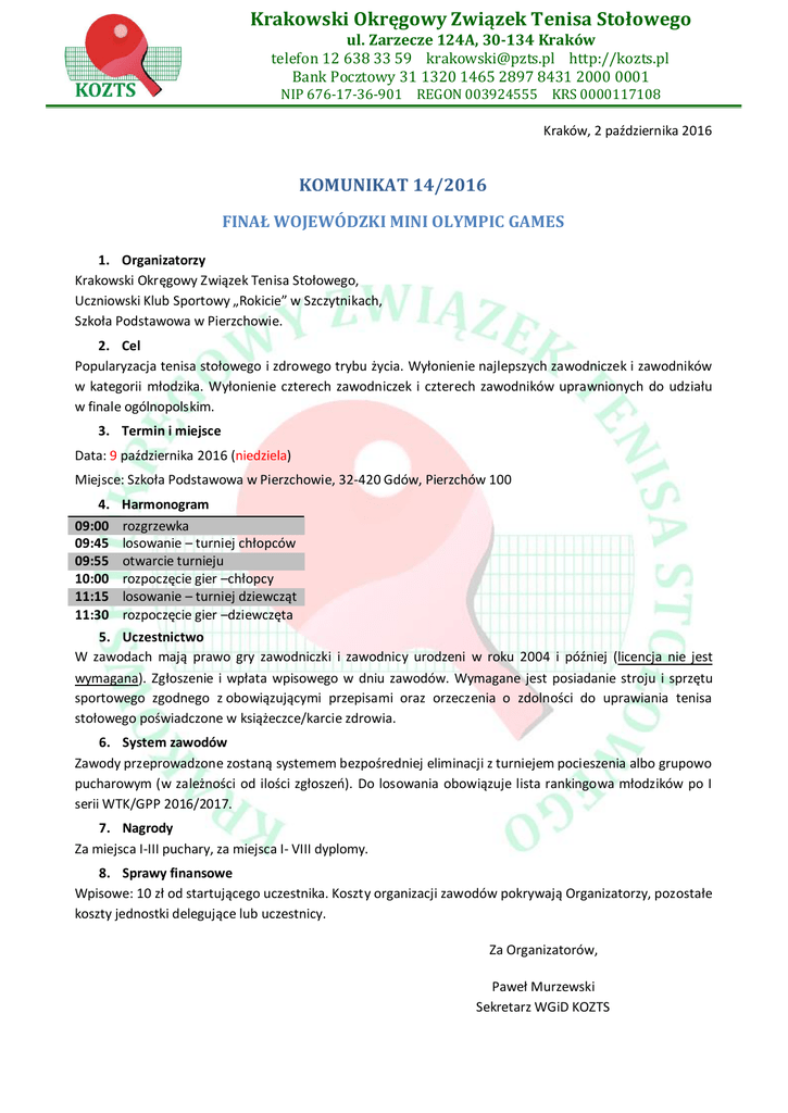 KrakowskiOkręgowyZwiązekTenisaStołowego ul.Zarzecze124A,30-134Kraków telefon126383359 [email protected] http://kozts.pl BankPocztowy31132014652897843120000001 NIP676-17-36-901 REGON003924555 KRS0000117108 Kraków, 2 października 2016 KOMUNIKAT14/2016 FINAŁWOJEWÓDZKIMINIOLYMPICGAMES 1. Organizatorzy Krakowski Okręgowy Związek Tenisa Stołowego, Uczniowski Klub Sportowy „Rokicie” w Szczytnikach, Szkoła Podstawowa w Pierzchowie. 2. Cel Popularyzacja tenisa stołowego i zdrowego trybu życia. Wyłonienie najlepszych zawodniczek i zawodników w kategorii młodzika. Wyłonienie czterech zawodniczek i czterech zawodników uprawnionych do udziału w finale ogólnopolskim. 3. Termin i miejsce Data: 9 października 2016 (niedziela) Miejsce: Szkoła Podstawowa w Pierzchowie, 32-420 Gdów, Pierzchów 100 4. 09:00 09:45 09:55 10:00 11:15 11:30 Harmonogram rozgrzewka losowanie – turniej chłopców otwarcie turnieju rozpoczęcie gier –chłopcy losowanie – turniej dziewcząt rozpoczęcie gier –dziewczęta 5. Uczestnictwo W zawodach mają prawo gry zawodniczki i zawodnicy urodzeni w roku 2004 i później (licencja nie jest wymagana). Zgłoszenie i wpłata wpisowego w dniu zawodów. Wymagane jest posiadanie stroju i sprzętu sportowego zgodnego z obowiązującymi przepisami oraz orzeczenia o zdolności do uprawiania tenisa stołowego poświadczone w książeczce/karcie zdrowia. 6. System zawodów Zawody przeprowadzone zostaną systemem bezpośredniej eliminacji z turniejem pocieszenia albo grupowo pucharowym (w zależności od ilości zgłoszeń). Do losowania obowiązuje lista rankingowa młodzików po I serii WTK/GPP 2016/2017. 7. Nagrody Za miejsca I-III puchary, za miejsca I- VIII dyplomy. 8. Sprawy finansowe Wpisowe: 10 zł od startującego uczestnika. Koszty organizacji zawodów pokrywają Organizatorzy, pozostałe koszty jednostki delegujące lub uczestnicy. Za Organizatorów, Paweł Murzewski Sekretarz WGiD KOZTS