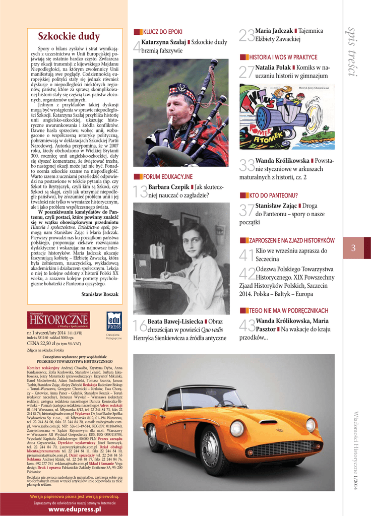 Spory o bilans zysków i strat wynikających z uczestnictwa w Unii Europejskiej pojawiają się ostatnio bardzo często. Zwłaszcza przy okazji transmisji z kijowskiego Majdanu Niepodległości, na którym zwolennicy Unii manifestują swe poglądy. Codziennością europejskiej polityki stały się jednak również dyskusje o niepodległości niektórych regionów, państw, które za sprawą skomplikowanej historii stały się częścią tzw. państw złożonych, organizmów unijnych. Jednym z przykładów takiej dyskusji mogą być wystąpienia w sprawie niepodległości Szkocji. Katarzyna Szałaj przybliża historię unii angielsko-szkockiej, ukazując historyczne uwarunkowania i źródła konfliktów. Dawne hasła sprzeciwu wobec unii, wzbogacone o współczesną retorykę polityczną, pobrzmiewają w deklaracjach Szkockiej Partii Narodowej. Autorka przypomina, że w 2007 roku, kiedy obchodzono w Wielkiej Brytanii 300. rocznicę unii angielsko-szkockiej, dały się słyszeć komentarze, że świętować trzeba, bo następnej okazji może już nie być. Ponadto ocenia szkockie szanse na niepodległość. Warto razem z uczniami prześledzić odpowiedzi na postawione w tekście pytania (np. czy Szkot to Brytyjczyk, czyli kim są Szkoci, czy Szkoci są skąpi, czyli jak utrzymać niepodległe państwo), by zrozumieć problem unii i jej trwałości nie tylko w wymiarze historycznym, ale i jako problem współczesnego świata. W poszukiwaniu kandydatów do Panteonu, czyli postaci, które powinny znaleźć się w wątku obowiązkowym przedmiotu Historia i społeczeństwo. Dziedzictwo epok, pomogą nam Stanisław Zając i Maria Jadczak. Pierwszy prowadzi nas ku początkom państwa polskiego, proponując ciekawe rozwiązania dydaktyczne i wskazując na najnowsze interpretacje historyków. Maria Jadczak ukazuje fascynującą kobietę – Elżbietę Zawacką, która była żołnierzem, nauczycielką, wykładowcą akademickim i działaczem społecznym. Lekcja o niej to kolejne odsłony z historii Polski XX wieku, a zarazem kolejne portrety psychologiczne bohaterki z Panteonu ojczystego. Katarzyna Szałaj Szkockie dudy brzmią fałszywie 4 Maria Jadczak Tajemnica Elżbiety Zawackiej 23 HISTORIA I WOS W PRAKTYCE Natalia Polak Komiks w nauczaniu historii w gimnazjum 27 FORUM EDUKACYJNE Barbara Czepik Jak skuteczniej nauczać o zagładzie? 13 spis treści KLUCZ DO EPOKI Szkockie dudy Wanda Królikowska Powstanie styczniowe w arkuszach maturalnych z historii, cz. 2 33 KTO DO PANTEONU? Stanisław Zając Droga do Panteonu – spory o nasze początki 37 ZAPROSZENIE NA ZJAZD HISTORYKÓW Klio we wrześniu zaprasza do Szczecina 41 42 3 Odezwa Polskiego Towarzystwa Historycznego. XIX Powszechny Zjazd Historyków Polskich, Szczecin 2014. Polska – Bałtyk – Europa Stanisław Roszak TEGO NIE MA W PODRĘCZNIKACH Beata Bawej-Lisiecka Obraz nr 1 styczeń/luty 2014 311 (LVII) indeks 381160 nakład 3000 egz. Czasopisma Pedagogiczne CENA 22,50 zł (w tym 5% VAT) 16chrześcijan w powieści Quo vadis Henryka Sienkiewicza a źródła antyczne Wanda Królikowska, Maria Pasztor Na wakacje do kraju przodków... 43 Zdjęcia na okładce: Fotolia Czasopismo wydawane przy współudziale POLSKIEGO TOWARZYSTWA HISTORYCZNEGO Wersja papierowa pisma jest wersją pierwotną. Zapraszamy do odwiedzenia naszej strony w Internecie www.edupress.pl Wiadomości Historyczne 1/2014 Komitet redakcyjny Andrzej Chwalba, Krystyna Dyba, Anna Kardaszewicz, Zofia Kozłowska, Stanisław Lenard, Barbara Jakubowska, Jerzy Maternicki (przewodniczący), Krzysztof Mikulski, Karol Modzelewski, Adam Suchoński, Tomasz Szarota, Janusz Tazbir, Stanisław Zając, Alojzy Zielecki Redakcja Radosław Biskup – Toruń–Warszawa, Grzegorz Chomicki – Kraków, Ewa Chorąży – Katowice, Anna Paner – Gdańsk, Stanisław Roszak – Toruń (redaktor naczelny), Ireneusz Wywiał – Warszawa (sekretarz redakcji, zastępca redaktora naczelnego) Danuta Konieczka-Śliwińska – Poznań (zastępca redaktora naczelnego) Adres redakcji 01–194 Warszawa, ul. Młynarska 8/12, tel. 22 244 84 73, faks 22 244 84 76, [email protected] Wydawca Dr Josef Raabe Spółka Wydawnicza Sp. z o.o., ul. Młynarska 8/12, 01–194 Warszawa, tel. 22 244 84 00, faks 22 244 84 20, e-mail: [email protected]. pl, www.raabe.com.pl, NIP: 526-13-49-514, REGON: 011864960, Zarejestrowana w Sądzie Rejonowym dla m.st. Warszawy w Warszawie XII Wydział Gospodarczy KRS, KRS 0000118704, Wysokość Kapitału Zakładowego: 50.000 PLN Prezes zarządu Anna Gryczewska, Dyrektor wydawniczy Józef Szewczyk, tel. 22 244 84 70, [email protected] Dział obsługi klienta/prenumerata tel. 22 244 84 11, faks 22 244 84 10, [email protected], Dział sprzedaży tel. 22 244 84 55 Reklama Andrzej Idziak, tel. 22 244 84 77, faks 22 244 84 76, kom. 692 277 761 [email protected] Skład i łamanie Vega design Druk i oprawa Pabianickie Zakłady Graficzne SA, 95–200 Pabianice Redakcja nie zwraca nadesłanych materiałów, zastrzega sobie pra wo formalnych zmian w treści artykułów i nie odpowiada za treść płatnych reklam.