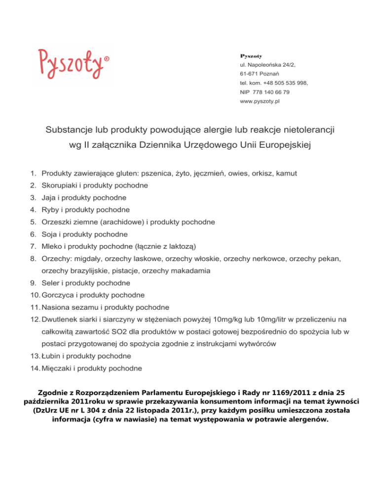 Pyszoty ul. Napoleońska 24/2, 61-671 Poznań tel. kom. +48 505 535 998, NIP 778 140 66 79 www.pyszoty.pl Substancje lub produkty powodujące alergie lub reakcje nietolerancji wg II załącznika Dziennika Urzędowego Unii Europejskiej 1. Produkty zawierające gluten: pszenica, żyto, jęczmień, owies, orkisz, kamut 2. Skorupiaki i produkty pochodne 3. Jaja i produkty pochodne 4. Ryby i produkty pochodne 5. Orzeszki ziemne (arachidowe) i produkty pochodne 6. Soja i produkty pochodne 7. Mleko i produkty pochodne (łącznie z laktozą) 8. Orzechy: migdały, orzechy laskowe, orzechy włoskie, orzechy nerkowce, orzechy pekan, orzechy brazylijskie, pistacje, orzechy makadamia 9. Seler i produkty pochodne 10. Gorczyca i produkty pochodne 11. Nasiona sezamu i produkty pochodne 12. Dwutlenek siarki i siarczyny w stężeniach powyżej 10mg/kg lub 10mg/litr w przeliczeniu na całkowitą zawartość SO2 dla produktów w postaci gotowej bezpośrednio do spożycia lub w postaci przygotowanej do spożycia zgodnie z instrukcjami wytwórców 13. Łubin i produkty pochodne 14. Mięczaki i produkty pochodne Zgodnie z Rozporządzeniem Parlamentu Europejskiego i Rady nr 1169/2011 z dnia 25 października 2011roku w sprawie przekazywania konsumentom informacji na temat żywności (DzUrz UE nr L 304 z dnia 22 listopada 2011r.), przy każdym posiłku umieszczona została informacja (cyfra w nawiasie) na temat występowania w potrawie alergenów.