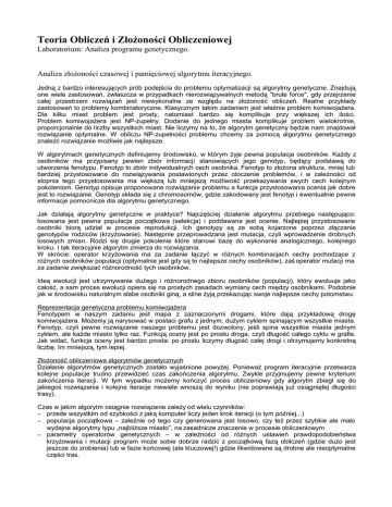 Teoria Obliczeń i Złożoności Obliczeniowej Laboratorium: Analiza programu genetycznego. Analiza złożoności czasowej i pamięciowej algorytmu iteracyjnego. Jedną z bardzo interesujących prób podejścia do problemu optymalizacji są algorytmy genetyczne. Znajdują one wiele zastosowań, zwłaszcza w przypadkach nierozwiązywalnych metodą "brute force", gdy przejrzenie całej przestrzeni rozwiązań jest niewykonalne ze względu na złożoność obliczeń. Realne przykłady zastosowań to problemy kombinatoryczne. Klasycznym takim zadaniem jest właśnie problem komiwojażera. Dla kilku miast problem jest prosty, natomiast bardzo się komplikuje przy większej ich ilości. Problem komiwojażera jest NP-zupełny. Dodanie do jednego miasta komplikuje problem wielokrotnie, proporcjonalnie do liczby wszystkich miast. Nie liczymy na to, że algorytm genetyczny będzie nam znajdował rozwiązanie optymalne. W obliczu NP-zupełności problemu chcemy za pomocą algorytmu genetycznego znaleźć rozwiązanie możliwie jak najlepsze. W algorytmach genetycznych definiujemy środowisko, w którym żyje pewna populacja osobników. Każdy z osobników ma przypisany pewien zbiór informacji stanowiących jego genotyp, będący podstawą do utworzenia fenotypu. Fenotyp to zbiór indywidualnych cech osobnika. Fenotyp to złożona struktura, mniej lub bardziej przystosowana do rozwiązywania postawionych przez otoczenie problemów, i w zależności od stopnia tego przystosowania ma większą lub mniejszą możliwość przekazywania swych cech kolejnym pokoleniom. Genotyp opisuje proponowane rozwiązanie problemu a funkcja przystosowania ocenia jak dobre jest to rozwiązanie. Genotyp składa się z chromosomów, gdzie zakodowany jest fenotyp i ewentualnie pewne informacje pomocnicze dla algorytmu genetycznego. Jak działają algorytmy genetyczne w praktyce? Najczęściej działanie algorytmu przebiega następująco: losowana jest pewna populacja początkowa (selekcja) i poddawana jest ocenie. Najlepiej przystosowane osobniki biorą udział w procesie reprodukcji. Ich genotypy są ze sobą kojarzone poprzez złączanie genotypów rodziców (krzyżowanie). Następnie przeprowadzana jest mutacja, czyli wprowadzenie drobnych losowych zmian. Rodzi się drugie pokolenie które stanowi bazę do wykonania analogicznego, kolejnego kroku. I tak iteracyjnie algorytm zmierza do rozwiązania. W skrócie: operator krzyżowania ma za zadanie łączyć w różnych kombinacjach cechy pochodzące z różnych osobników populacji (optymalnie jest gdy są to najlepsze cechy osobników), zaś operator mutacji ma za zadanie zwiększać różnorodność tych osobników. Ideą ewolucji jest utrzymywanie dużego i różnorodnego zbioru osobników (populacji), który ewoluuje jako całość, a sam proces ewolucji opiera się na prostych zasadach wymiany cech między osobnikami. Podobnie jak w środowisku naturalnym słabe osobniki giną, a silne żyją przekazując swoje najlepsze cechy potomstwu. Reprezentacja genetyczna problemu komiwojażera Fenotypem w naszym zadaniu jest mapa z zaznaczonymi drogami, które dają przykładową drogę komiwojażera. Możemy ją narysować w postaci grafu z jednym, dużym cyklem spinającym wszystkie miasta. Fenotyp, czyli pewne rozwiązanie naszego problemu jest dozwolony, jeśli spina wszystkie miasta jednym cyklem, ale każde miasto tylko raz. Funkcją oceny jest po prostu droga, czyli długość całego cyklu w grafie. Jak widać, funkcja oceny jest bardzo prosta: po prostu liczymy długość całej drogi i otrzymujemy konkretną liczbę. Im mniejszą, tym lepiej. Złożoność obliczeniowa algorytmów genetycznych Działanie algorytmów genetycznych zostało wyjaśnione powyżej. Ponieważ program iteracyjnie przetwarza kolejne populacje trudno przewidzieć czas zakończenia algorytmu. Zwykle przyjmujemy pewne kryterium zakończenia iteracji. W tym wypadku możemy kończyć proces obliczeniowy gdy algorytm zbiegł się do jakiegoś rozwiązania i kolejne iteracje niewiele wnoszą do wyniku (nie poprawiają już osiągniętej długości trasy). Czas w jakim algorytm osiągnie rozwiązanie zależy od wielu czynników: – przede wszystkim od szybkości z jaką komputer liczy jeden krok iteracji (o tym później...) – populacja początkowa – zależnie od tego czy generowana jest losowo, czy też przez szybkie ale mało wydajne algorytmy typu „najbliższe miasto”, na zasadnicze znaczenie w procesie obliczeniowym – parametry operatorów genetycznych – w zależności od różnych ustawień prawdopodobieństwa krzyżowania i mutacji program może sobie dobrze radzić z początkową fazą obliczeń (gdzie dużo jest jeszcze do zrobienia) lub w fazie końcowej (ale kluczowej!) gdzie likwidowane są drobne ale nieoptymalne części tras. Mówiąc o czasowej złożoności obliczeniowej warto zastanowić się nad złożonością kolejnych kroków iteracji, gdyż to czas ich wykonania wpływa bezpośrednio na czas zakończenia obliczeń. Najważniejszymi czynnikami decydującymi o złożoności czasowej jednego kroku programu są: – ilość miast – złożoność problemu w pierwszej kolejności zależy oczywiście od ilości miast – wielkość populacji – im większa populacja tym większy czas obliczeń – jakość generatora liczb losowych - ponieważ operacje krzyżowania i mutacji korzystają z wartości losowych, kluczową rolę odgrywa jakość generatora liczb pseudolosowych – parametry operatorów genetycznych – wymienione już wcześniej, ale tym razem w innym sensie, odgrywają kluczową rolę w złożoności obliczeniowej jednego kroku algorytmu, duże prawdopodobieństwo mutacji znacznie zwiększa potrzebę generowania liczb losowych, natomiast częste wykonywanie krzyżowania znacząco zwiększa złożoność obliczeniową przez konieczność wykonywania operacji zamiany łańcuchów oraz również losowania osobników, w których to ta zamiana nastąpi. Zło