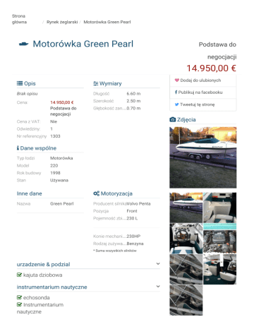 Strona główna / Rynek żeglarski / Motorówka Green Pearl Motorówka Green Pearl Podstawa do negocjacji 14.950,00 € Dodaj do ulubionych Opis Wymiary Brak opisu Długość 6.60 m Szerokość 2.50 m Cena: 14.950,00 € Podstawa do negocjacji Cena z VAT: Nie Odwiedziny: 1 Publikuj na facebooku Tweetuj tę stronę Głębokość zan…0.70 m Zdjęcia Nr referencyjny 1303 Dane wspólne Typ łodzi Motorówka Model 220 Rok budowy 1998 Stan Używana Inne dane Nazwa Motoryzacja Green Pearl Producent silnikaVolvo Penta Pozycja Front Pojemność zbi…230 L Konie mechani…230HP Rodzaj zużywa…Benzyna * Suma wszystkich silników urzadzenie & podzial kajuta dziobowa instrumentarium nautyczne echosonda Instrumentarium nautyczne kompas radionadajnik UKF ploter do map wykrywacz ryb wyposazenie glówny wlacznik do akumulatora kotwica z lancuchem pompa odpompowujaca osprzet chlodziarka lacznie z dwuosiowa przyczepa lacznie z przyczepa hamowana poklad kapielowy zintegrowany radio Dane kontaktowe Żeglarz Karlsson Karsten T. Hannover DEU Zaloguj się, aby zobaczyć wszystkie dane kontaktowe! Logowanie lub rejestracja Skontaktuj się ze sprzedawcą Skorzystaj z formularza, aby przesłać pytania albo skontaktować się ze sprzedawcą tej łodzi Imię Nazwisko E-mail Telefon Telefon komórkowy Pytanie Jestem zainteresowany/-a oferowaną przez Ciebie na portmaps.com łodzią Nie jestem robotem reCAPTCHA Wyślij wiadomość Podobne łodzie GISA €9.900,00 Riviera €10.000,00 Dreamer €26.500,00 Tamaris Łodzie w zasięgu ilometrów Serenade 83,3 km €32.500,00 Dreamer 83,5 km €26.500,00 Likedeeler 90,1 km €160.000,00 Sommerwind In… 90,7 km