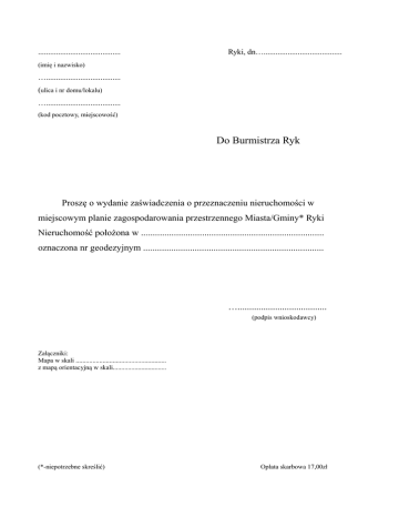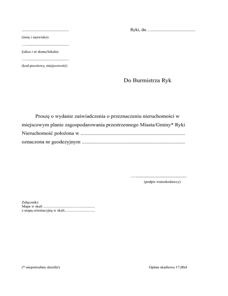 ......................................... Ryki, dn…....................................... (imię i nazwisko) …..................................... (ulica i nr domu/lokalu) …..................................... (kod pocztowy, miejscowość) Do Burmistrza Ryk Proszę o wydanie zaświadczenia o przeznaczeniu nieruchomości w miejscowym planie zagospodarowania przestrzennego Miasta/Gminy* Ryki Nieruchomość położona w .............................................................................. oznaczona nr geodezyjnym ............................................................................. …...................................... (podpis wnioskodawcy) Załączniki: Mapa w skali ...................................................... z mapą orientacyjną w skali................................ (*-niepotrzebne skreślić) Opłata skarbowa 17,00zł