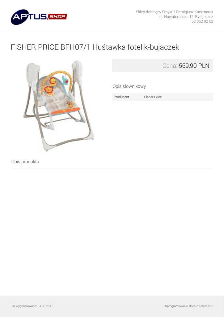 Sklep dziecięcy Smykuś Remigiusz Kaczmarek ul. Nowotoruńska 12, Bydgoszcz 52 362 02 63 FISHER PRICE BFH07/1 Huśtawka fotelik-bujaczek Cena: 569,90 PLN Opis słownikowy Producent Fisher Price Opis produktu Plik wygenerowano: 04-03-2017 Powered by TCPDF (www.tcpdf.org) Oprogramowanie sklepu: AptusShop